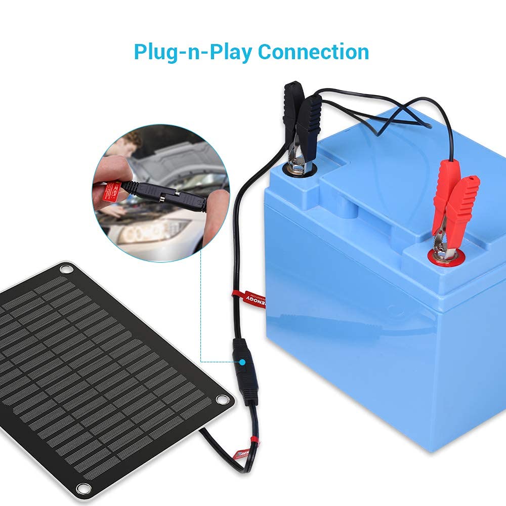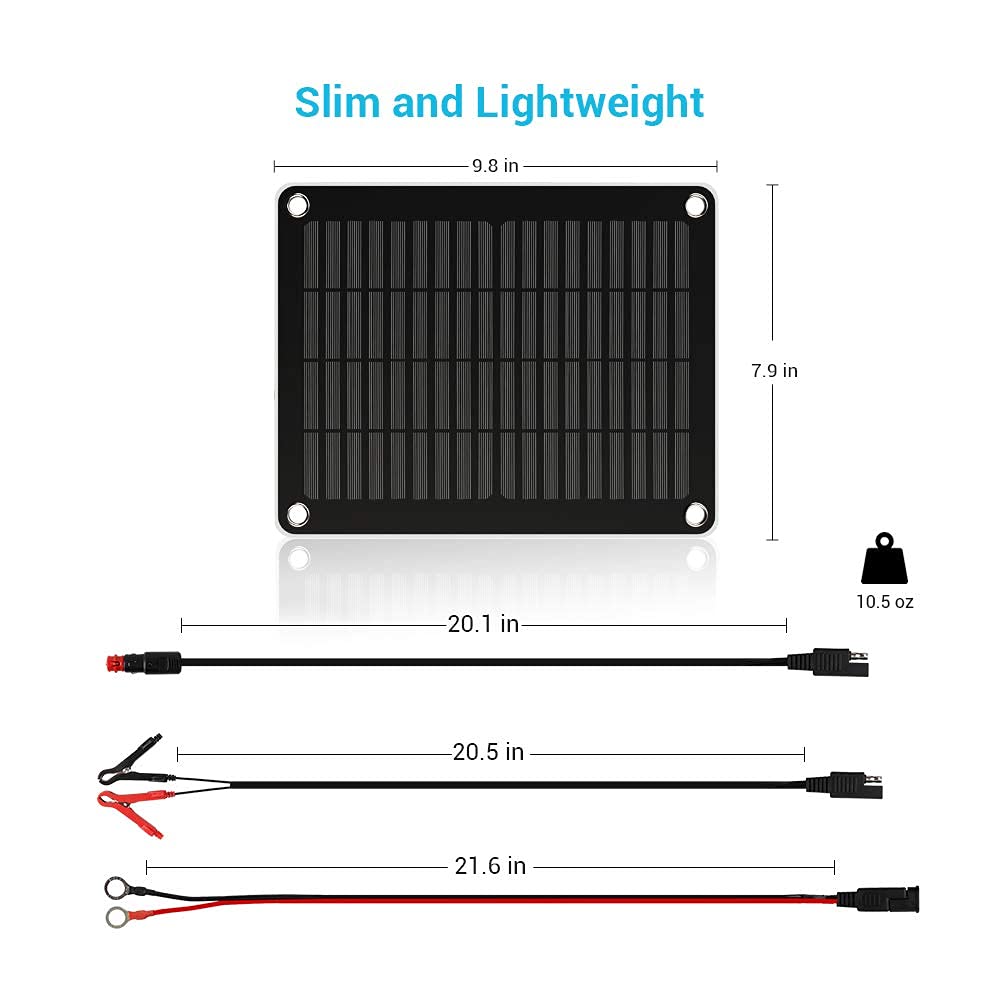 Equipped with premium monocrystalline solar cells, the Renogy 5W Solar Battery Charger and Maintainer manages your 12V lead-acid battery in daylight conditions by converting the sunlight into usable electricity and maintaining a healthy state of charge. The built-in MPPT (Maximum Power Point Tracking) charge controller intelligently manages the charging process and improves the charging efficiency by 10%-20%. The plug-and-play SAE connecter and included adapter cables make the solar battery charger maintainer a versatile fit for most applications. Note: For some makes or models of vehicles, the cigarette lighter port may not operate when the ignition is turned off. In such cases, please connect the solar battery charger maintainer to the battery directly.
