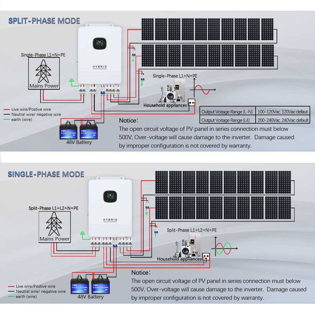 Y&H 10KW Parallel & Split-phase Solar Inverter: This upgraded solar hybrid inverter support parallel connection, rated output power 10000W, max peak power 20000W, rated output voltage AC120V/240V (split-phase/single-phase), battery voltage:48Vdc, built-in 200A Mppt solar charging, max PV input power:11000W, voltage range:125-425Vdc, max open circuit voltage VOC:500VDC, start-up voltage >130V; PV cable specification: 10AWG, max charging current:200A; nominal input frequency: 50/60Hz; supports CAN, USB and RS485 communication. Protection level: IP20 (indoor only)