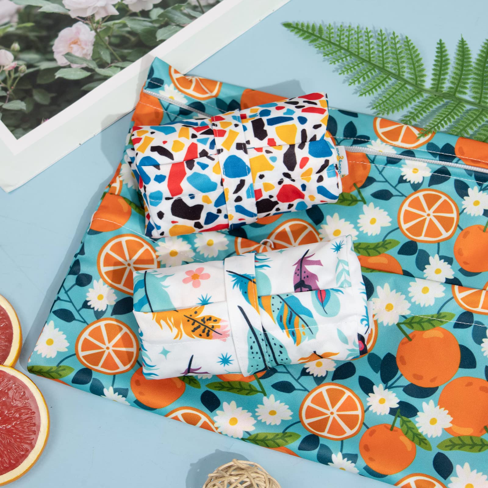 Double-Pocket Design with Snap Handle: Each wet bag contains two pockets, which comes with two zip closures to ensure that nothing will drop out of the bag and better to keep the clean and dirty items separately. With the snap handle design, you can unbutton the haddle and easily hang the bag on the stroller or door knobs, towel rod ect. anywhere you want.