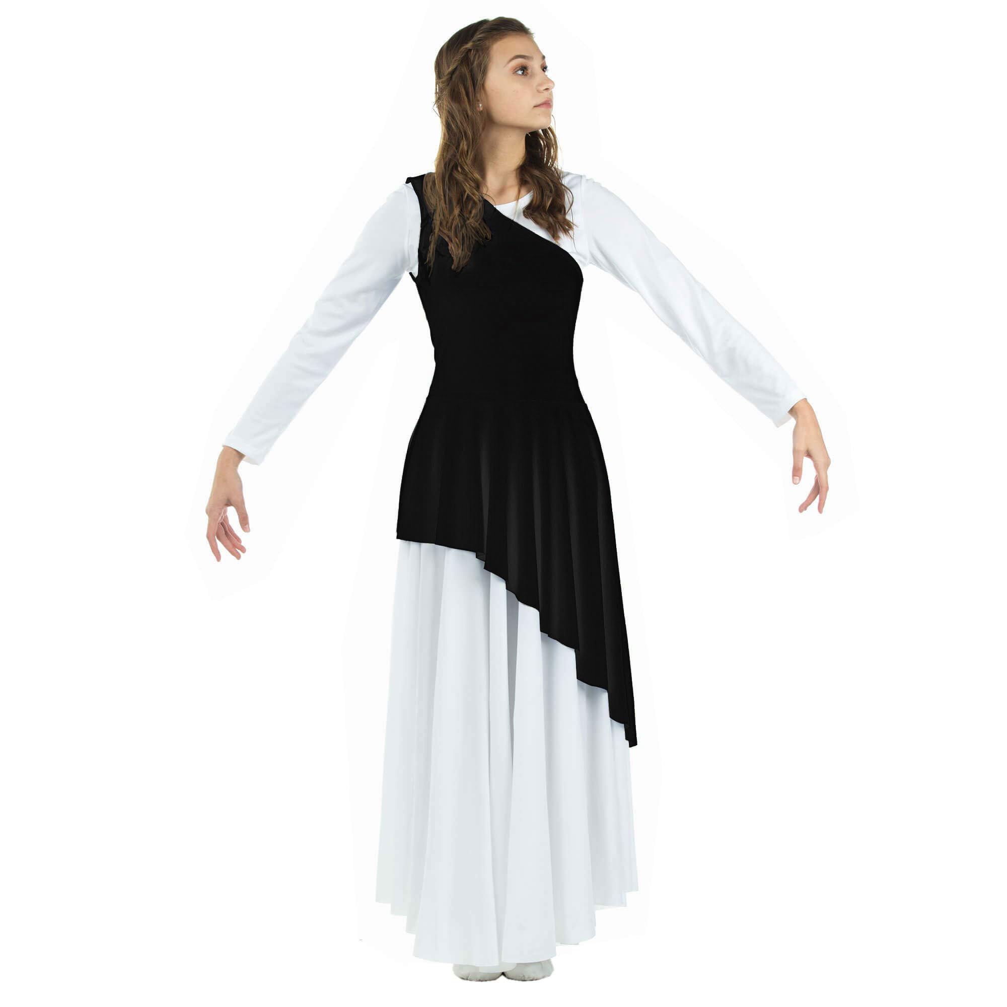 Dance Overlays for Worship Women Design Features: The unique asymmetrical design makes this praise dance tunic perfect for any praise dance dress for a layered look or to add different colors to an outfit. The side slit design not only facilitates your dance moves and allows your legs to move freely, but also adds to the overall dexterity and layering.
