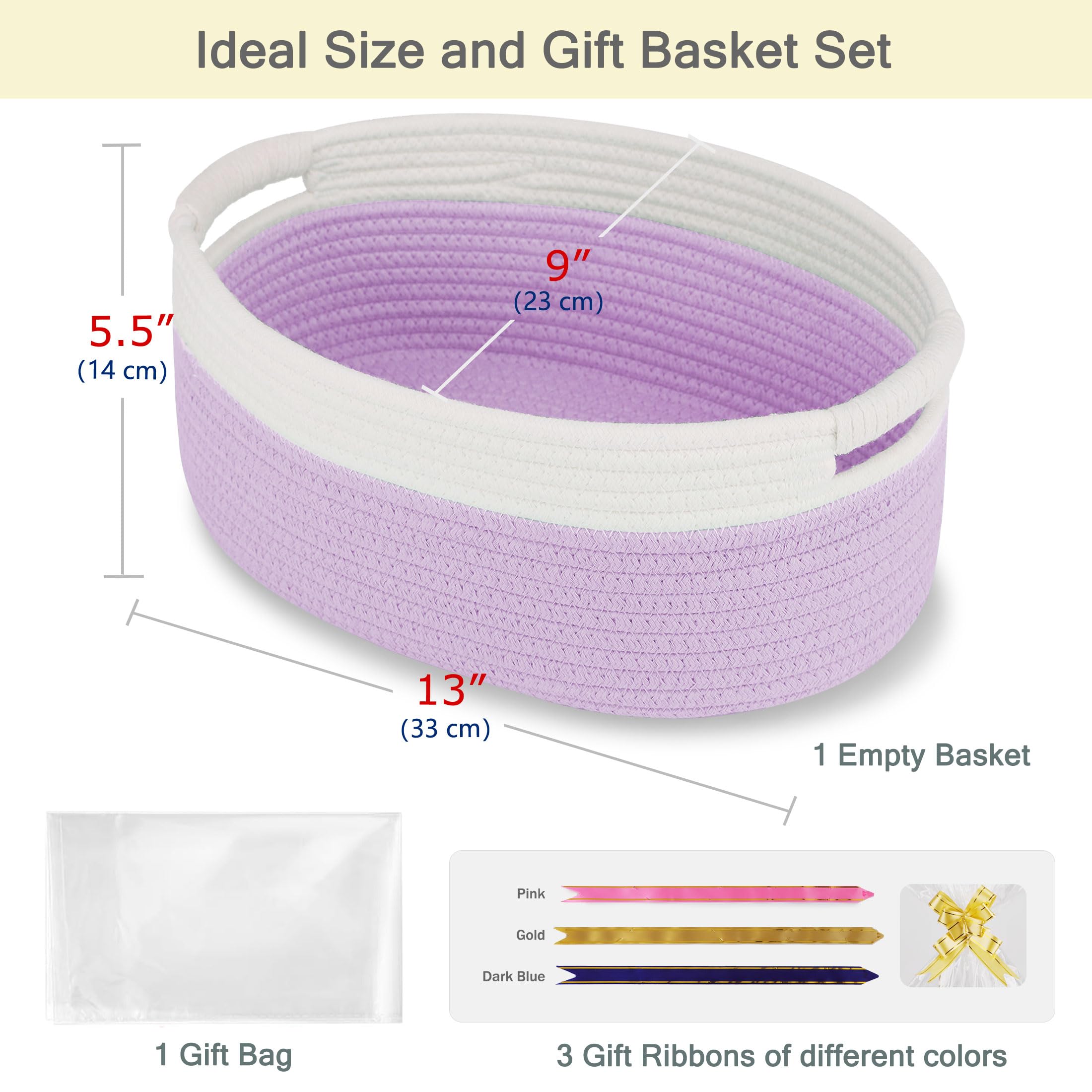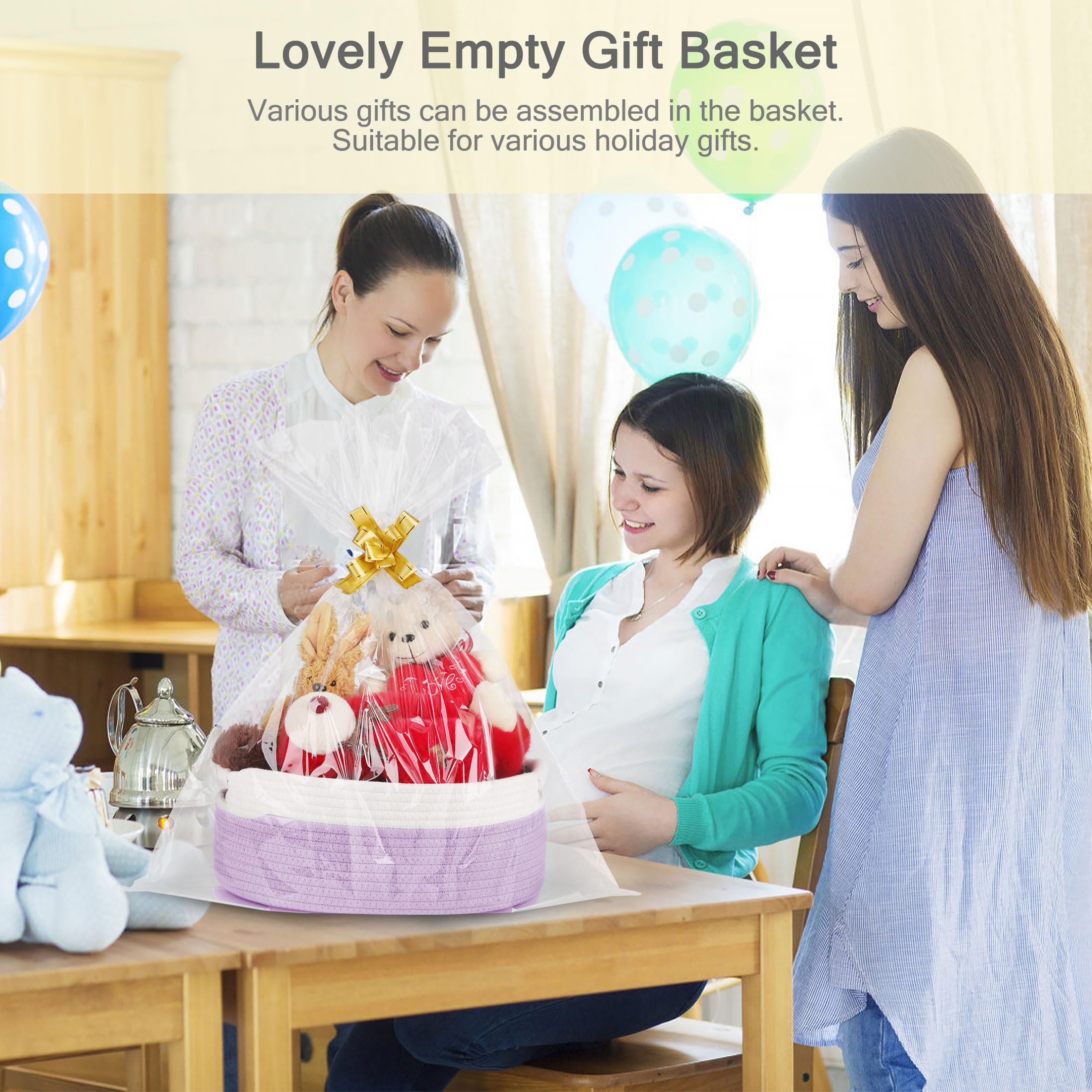【Ideal Size and Material】Our lovely empty gift basket measures 13“ x 9” x 5.5". It is made of high quality natural cotton rope, soft and skin-friendly, chemical free, and won't scratch clothes or furniture. It's a perfect storage basket for families with babies or pets.