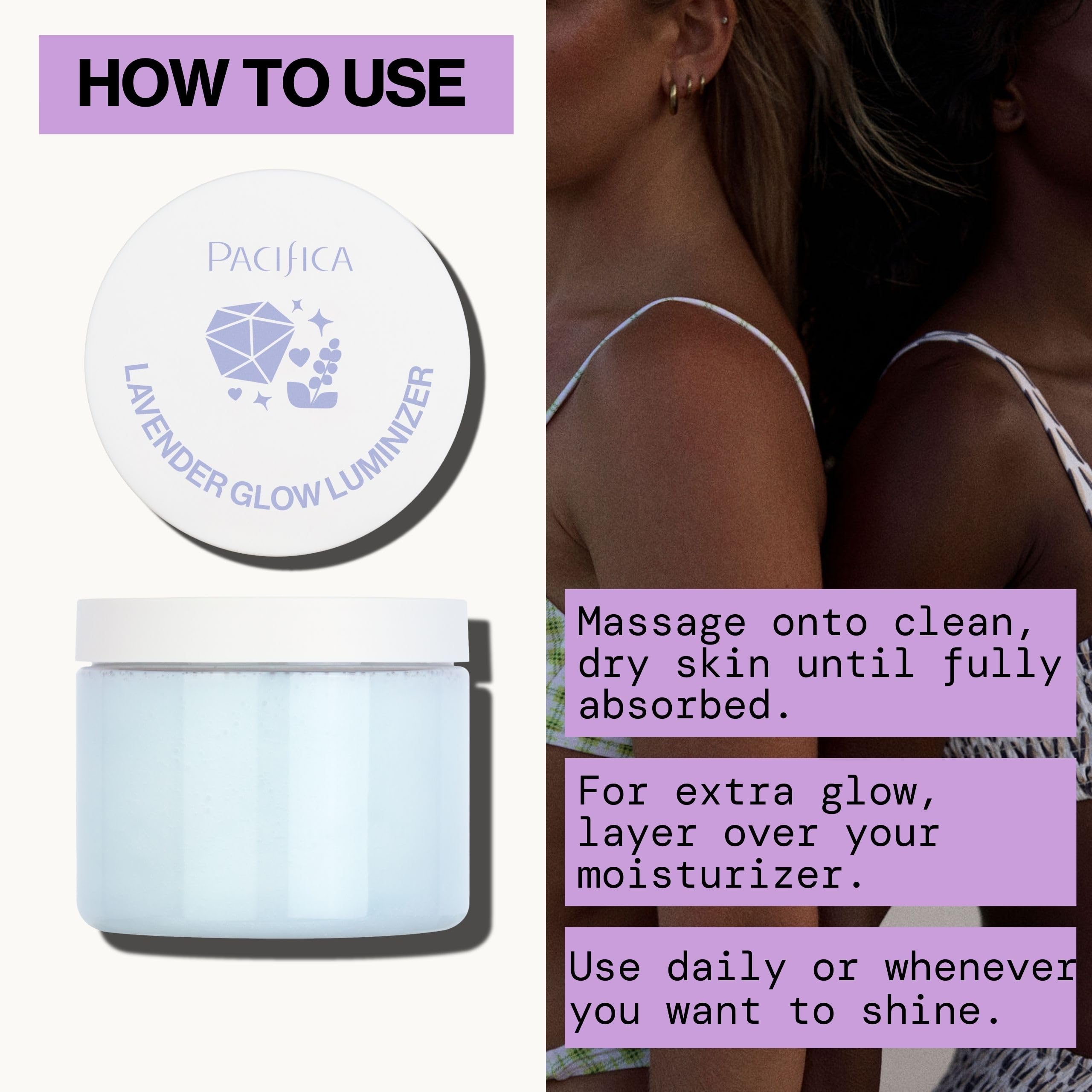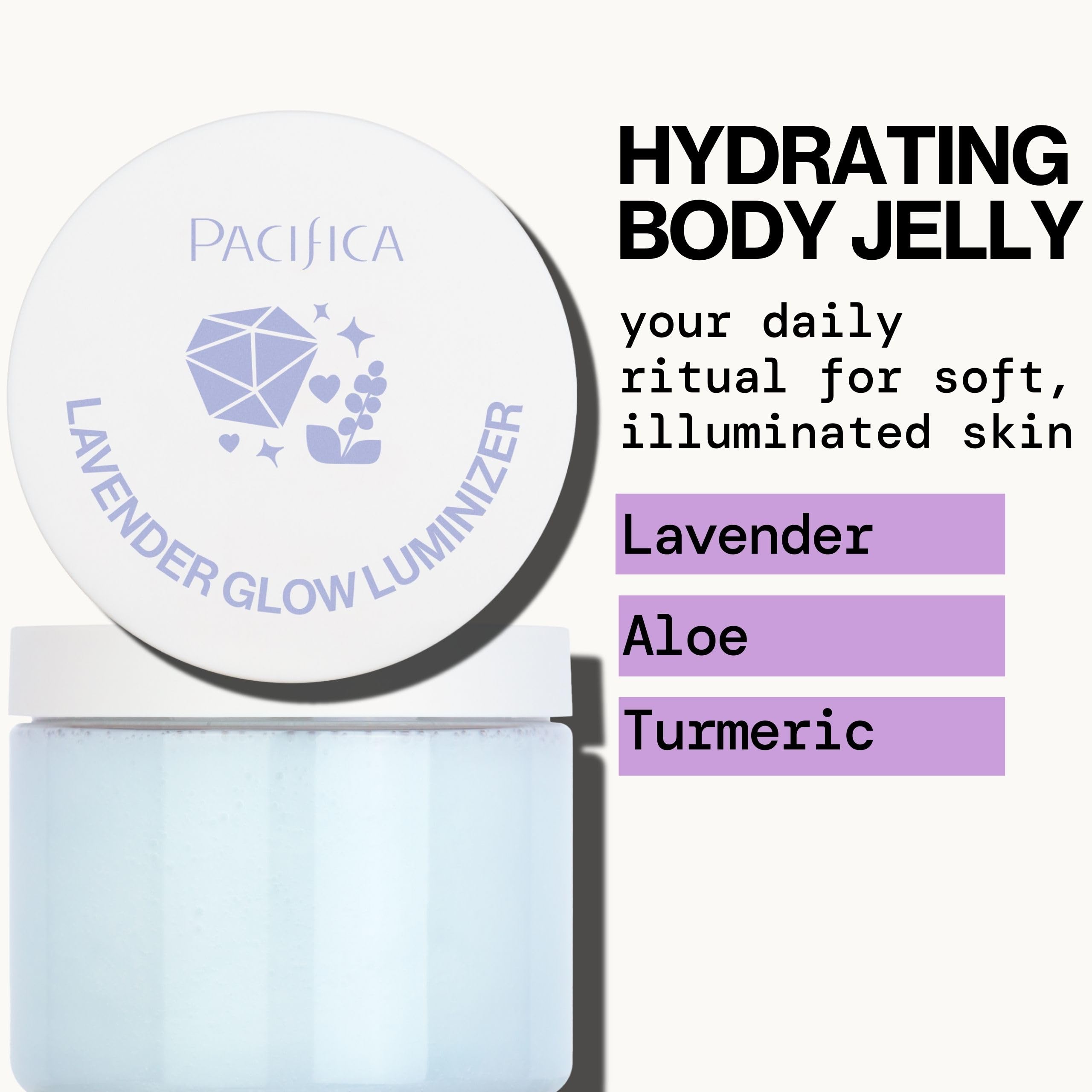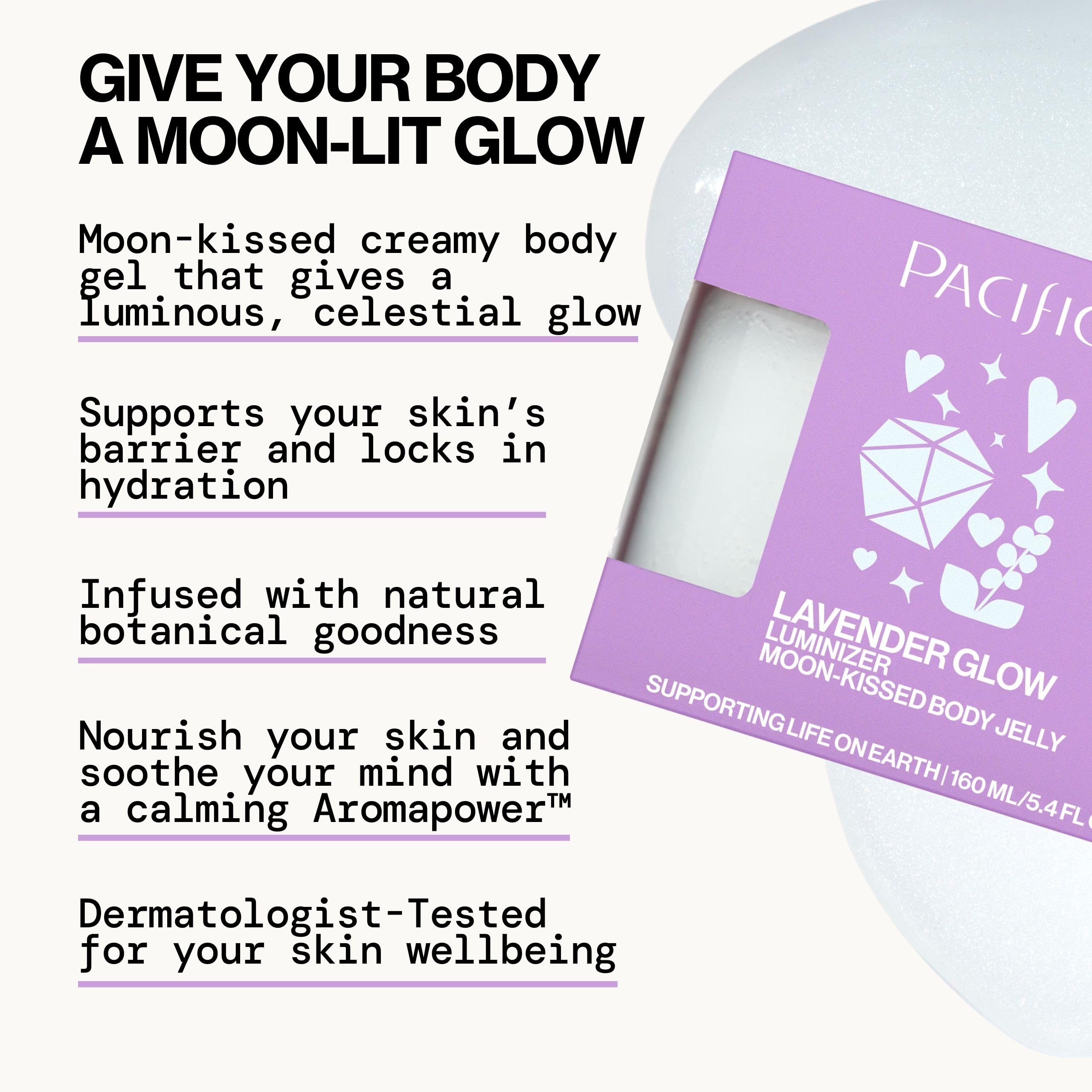 LUMINOUS BODY ILLUMINATOR: Achieve a luminous, moon-kissed glow instantly with Pacifica Lavender Glow Luminizer Body Jelly. This shimmering, lightweight body gel hydrates while delivering subtle, dewy radiance to your skin, leaving a naturally beautiful finish. Ideal for highlighting shoulders, arms, legs, collarbone, and anywhere you desire extra glow—perfect for special occasions, everyday radiance, or enhancing sun-kissed skin without sun exposure.