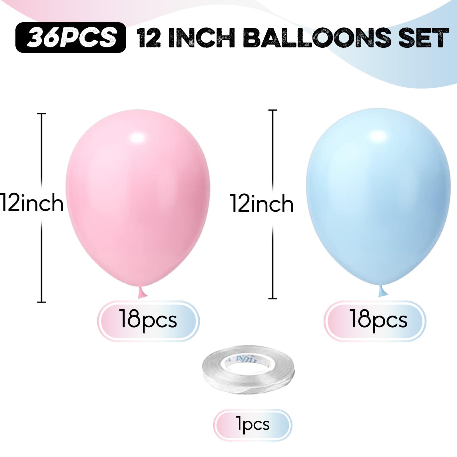 Blue Pink Balloons: 36pcs 12 inch balloons set, include 18pcs light blue balloons and 18pcs light pink balloons and 1pc white ribbon. The dreamy macaron blue pink themed balloons, featuring soft and pink tones, infuse vitality and liveliness into the party.