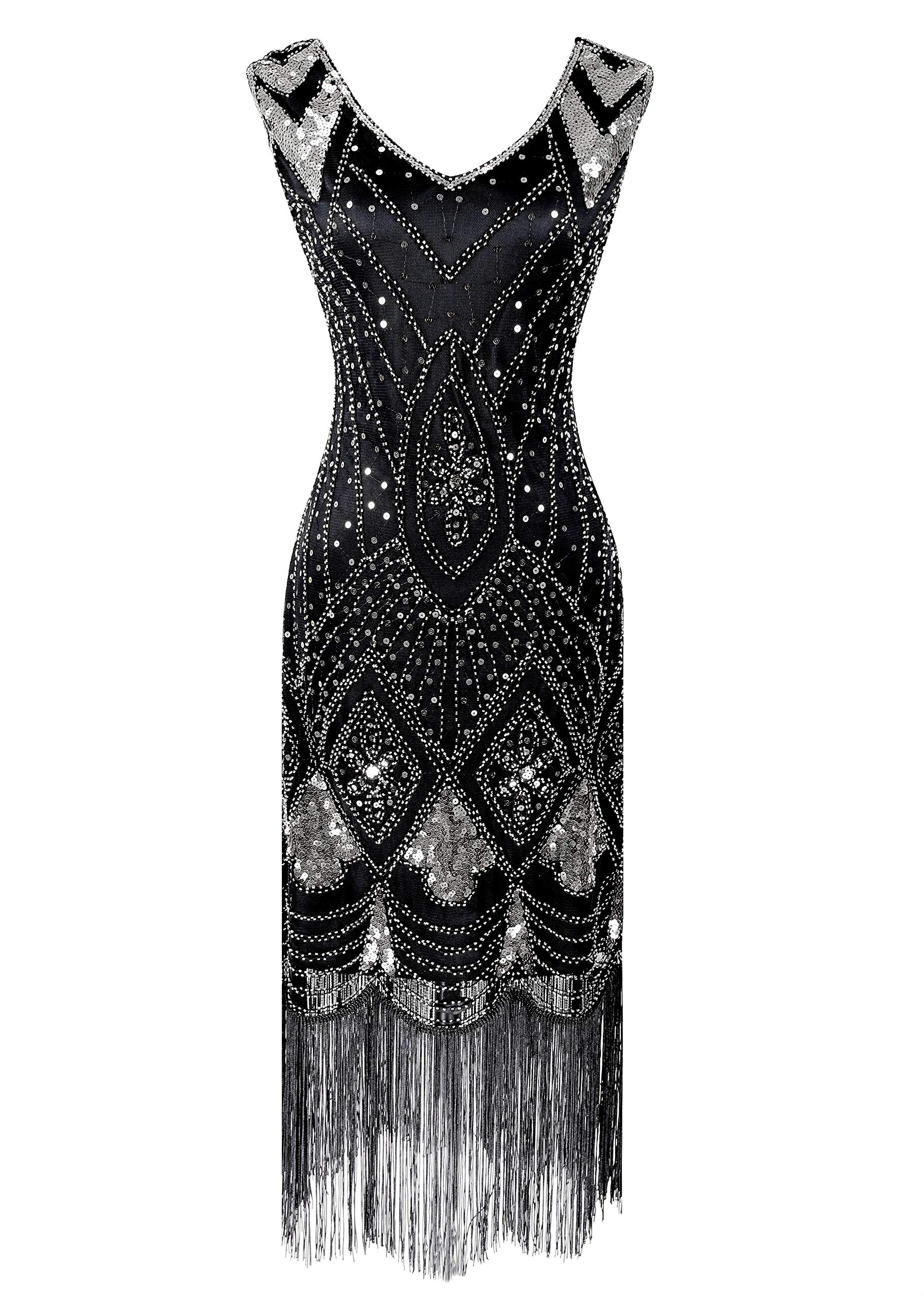 Package include: 1 x 1920S Sequin Tassel Flapper Dress , 2 x Pearl Necklace ; 1 x Long Satin Gloves; 1 x Black Cigarette Holder ; 1 x Headband ; 2 x Earrings ; 1 x Pearl Bracelet ; 1 X Pearl Brooch ; 1 x Pearl Open Ring.