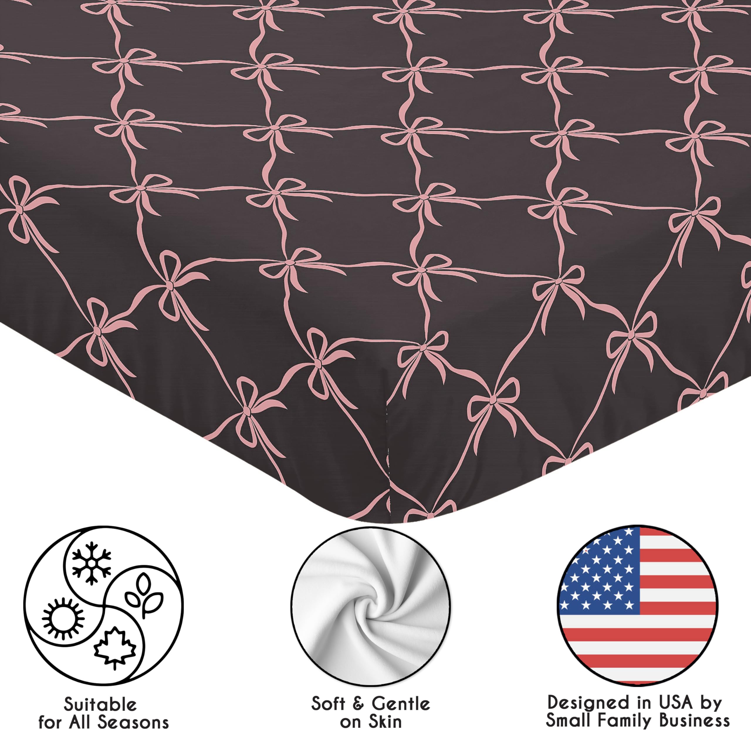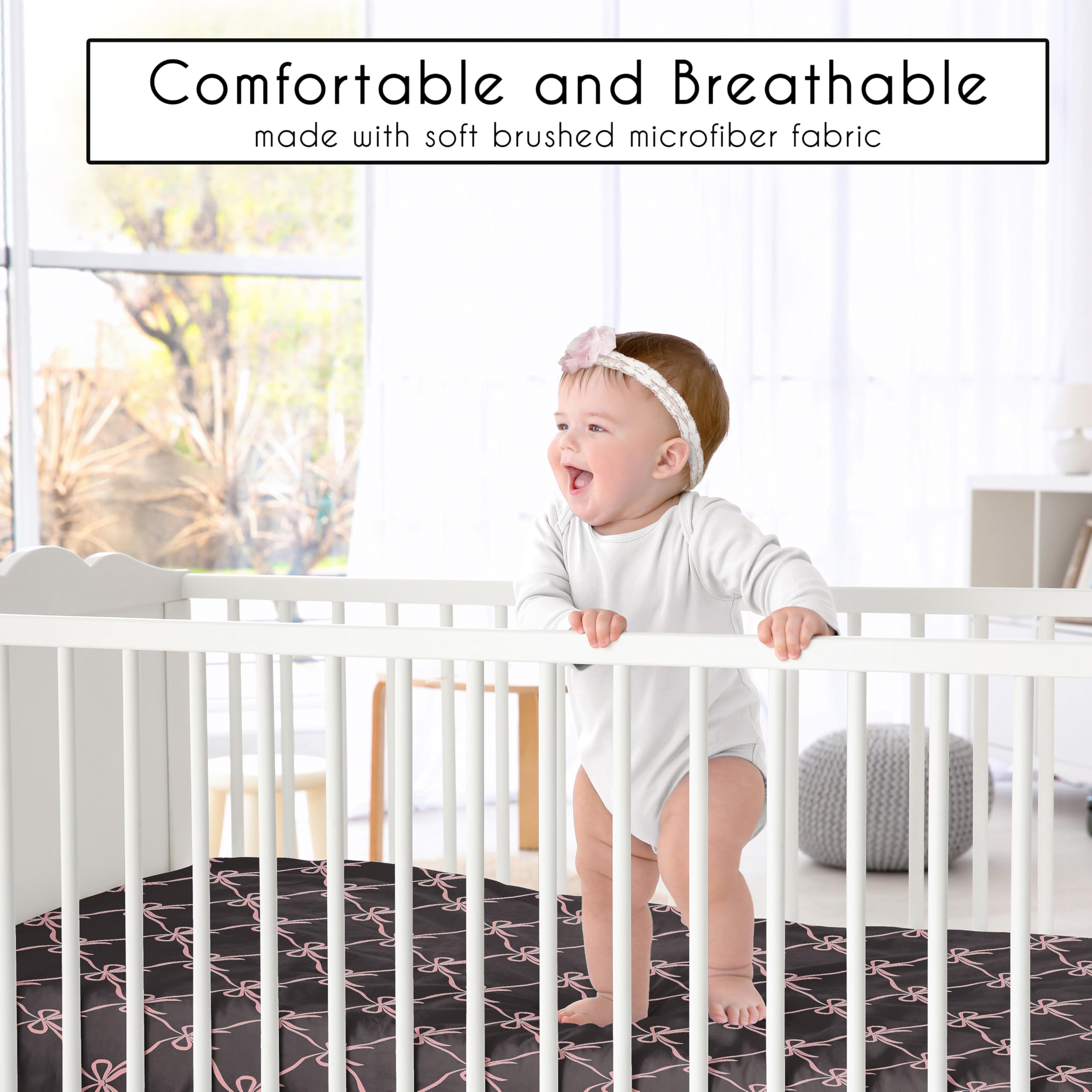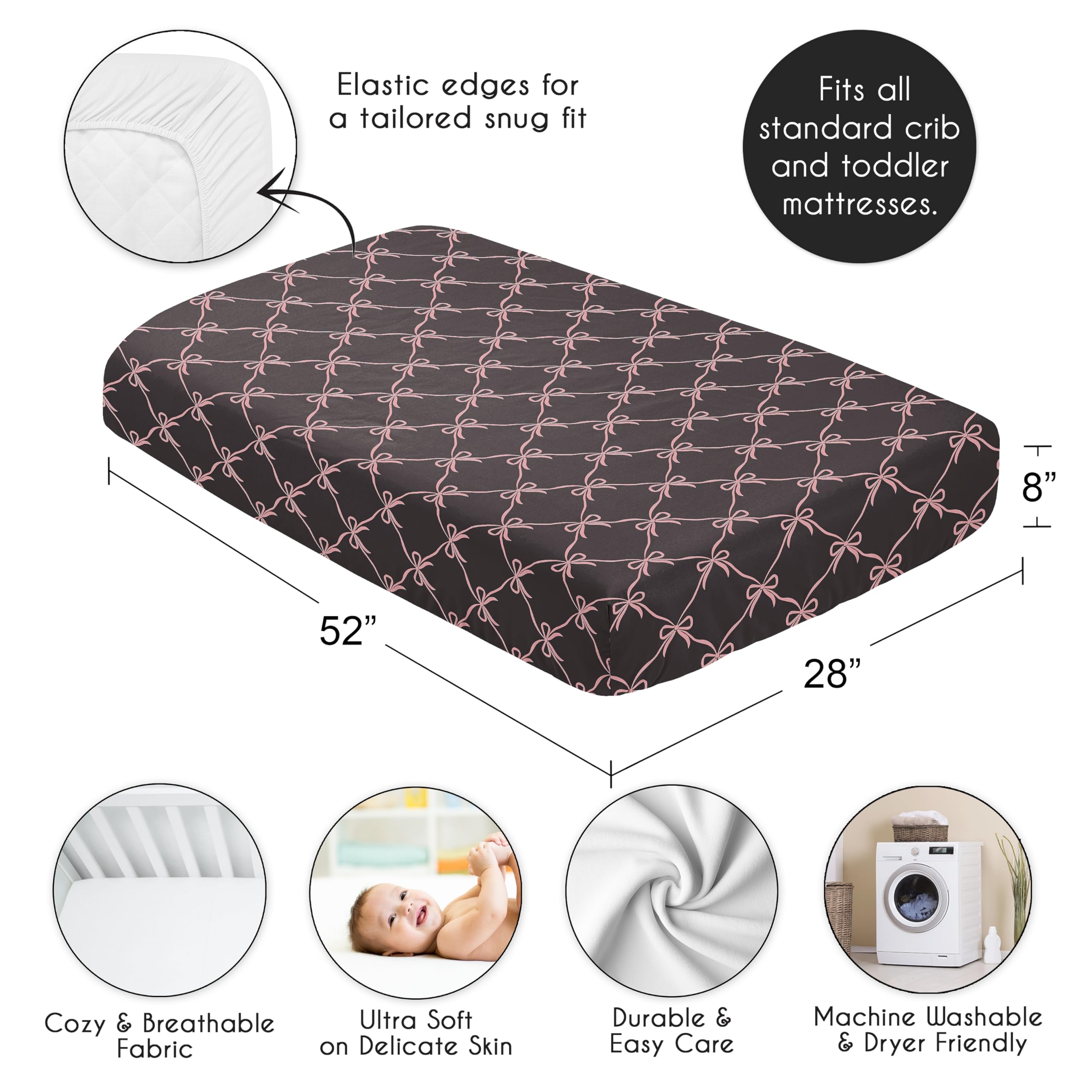 SNUG FIT: Includes (1) Fitted Crib Sheet 52in. x 28in. x 8in. Our newborn standard crib sheets fit snugly, with premium elastic sewn around the entire bottom edge for a secure fit on most standard sized cribs and toddler beds, to reduce shifting and bunching. This vintage, coquette brushed microfiber crib sheet features an exclusive design of black and blush pink bows print for the Ballerina, Bow, Dancer, Ballet Collection and is gentle on delicate skin to foster a soothing sleep environment.