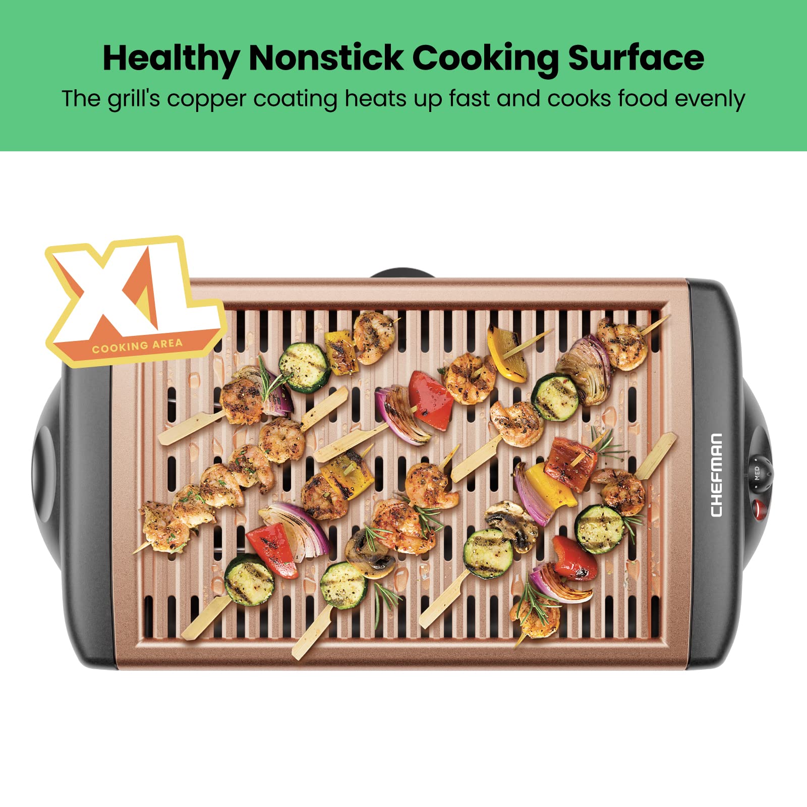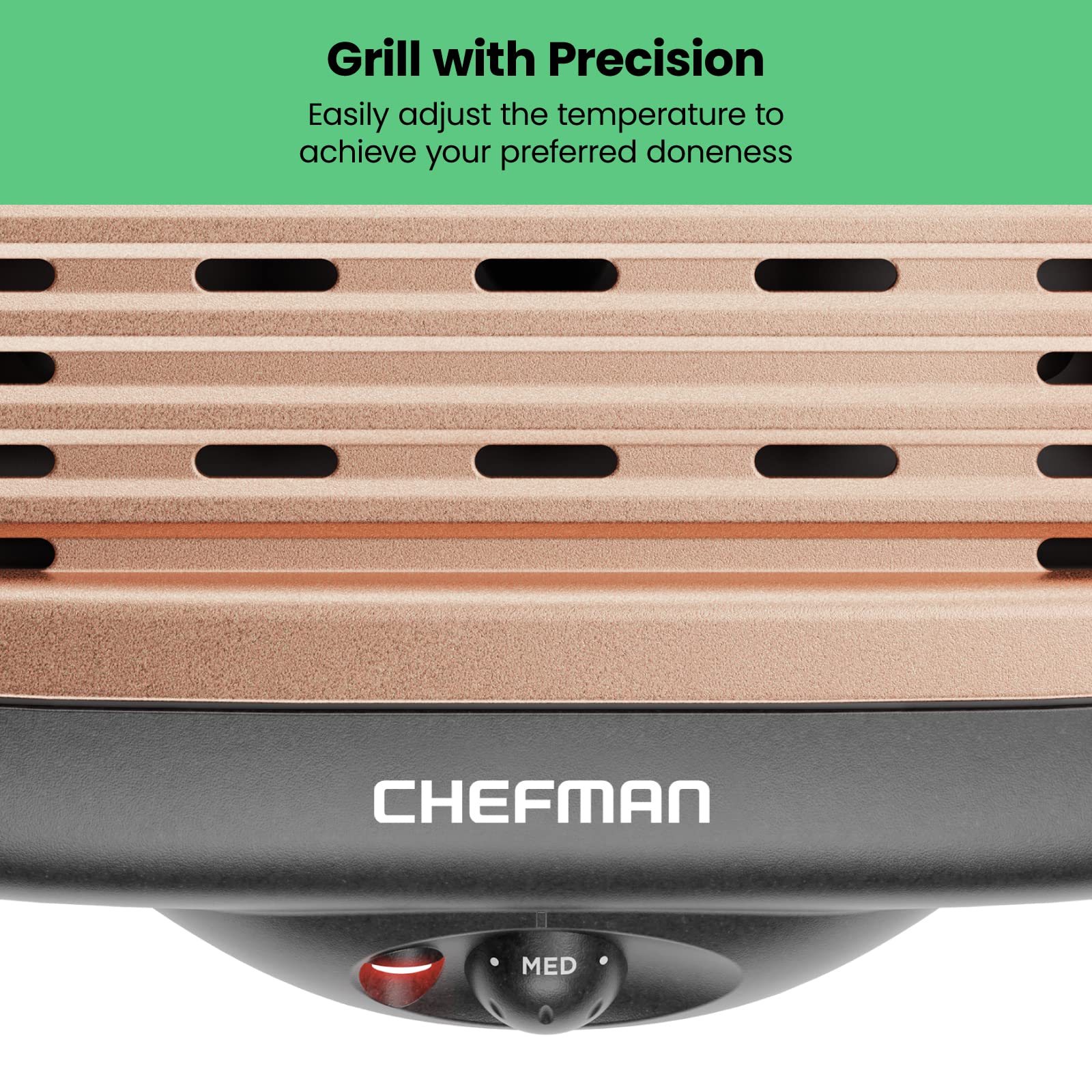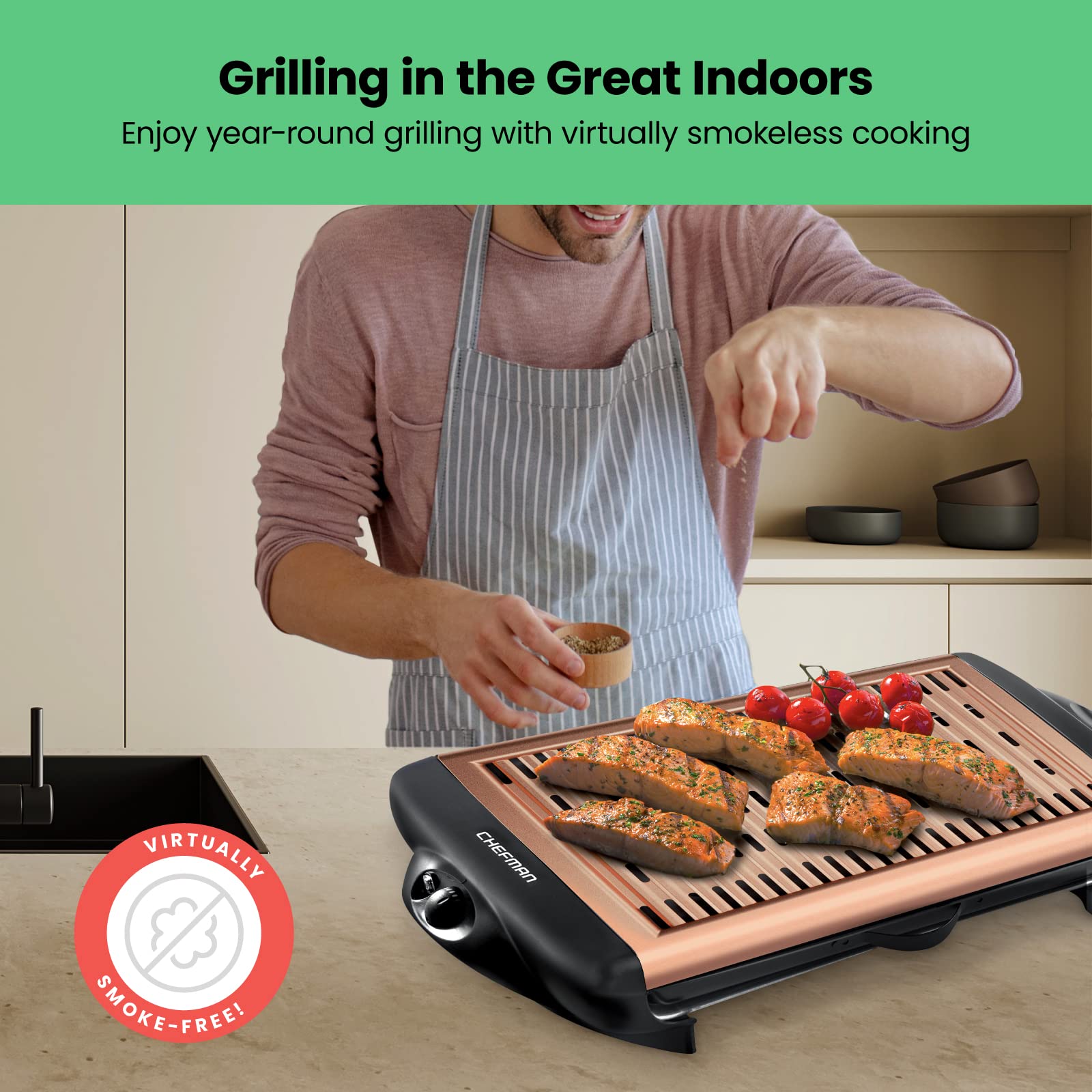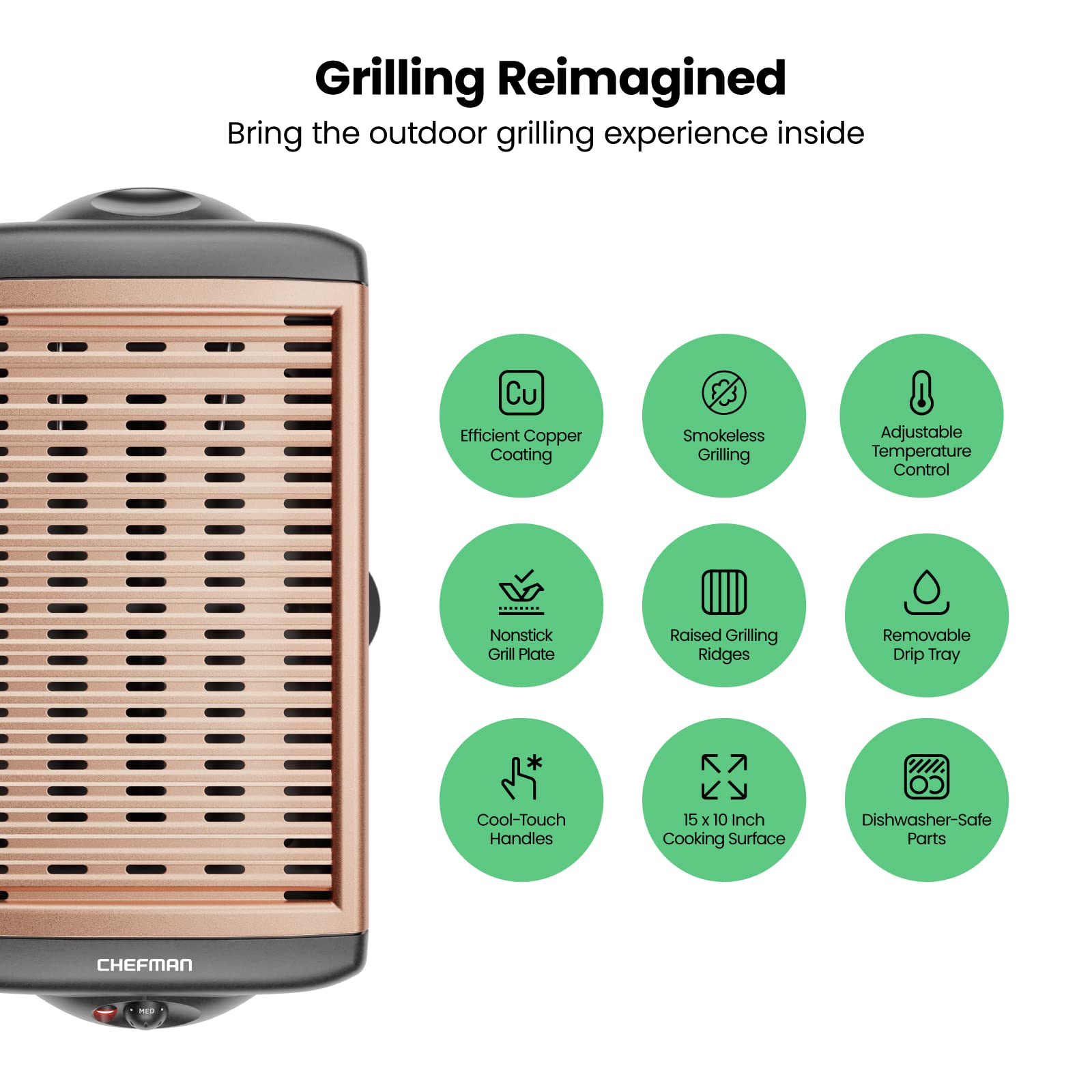The Chefman Smokeless Indoor Grill with copper coating takes backyard grilling inside and turns it into high-end kitchen cooking. The water-filled tray allows for virtually smoke-free grilling inside and the temperature-controlled heat gets dinner done just the way you like it. Make meals for a crowd with the extra-large cooking area and the dishwasher-safe grate and drip trays keep cleanup simple. Purchase includes a 1-year assurance from Chefman. For information on how to use your product, scroll down for a PDF User Guide.1120 Watts/120Volts–RJ23-SG-COPPER • Copper Coating • Smokeless Grilling • Adjustable Temperature Control • Nonstick Grill Plate • Raised Grilling Ridges • Removable Drip Tray • Cool-Touch Handles • 15 x 10 Inch Cooking Surface • Dishwasher-Safe Parts.