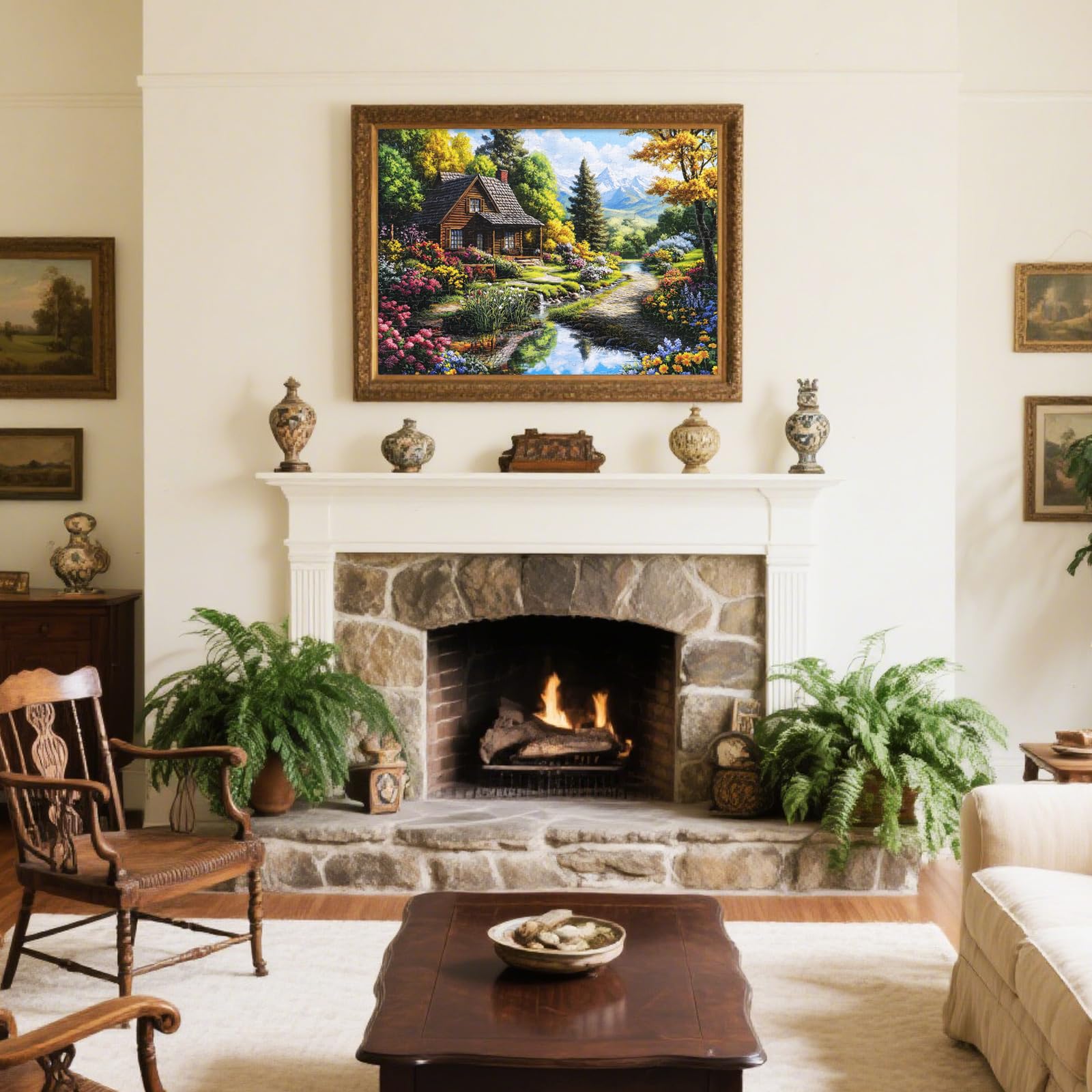 【Country Puzzle Design】The stunning artwork showcases a rustic wooden cottage with a shingled roof and welcoming porch, surrounded by vibrant wildflowers in pink, yellow, and purple hues. A gentle stream winds through the landscape, reflecting the golden autumn foliage and majestic snow-capped mountains in the distance. Rich colors and sharp imagery showcase seasonal flowers, rustic architecture, and natural elements in stunning detail.