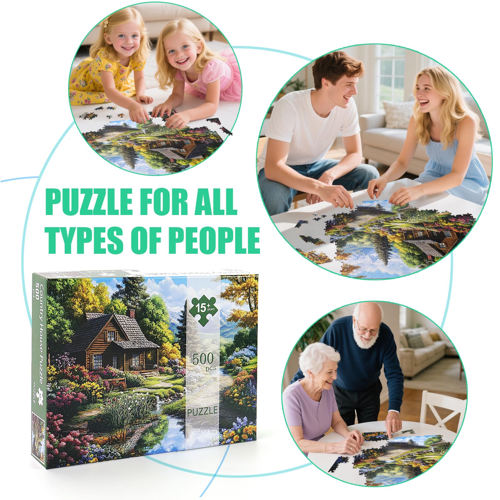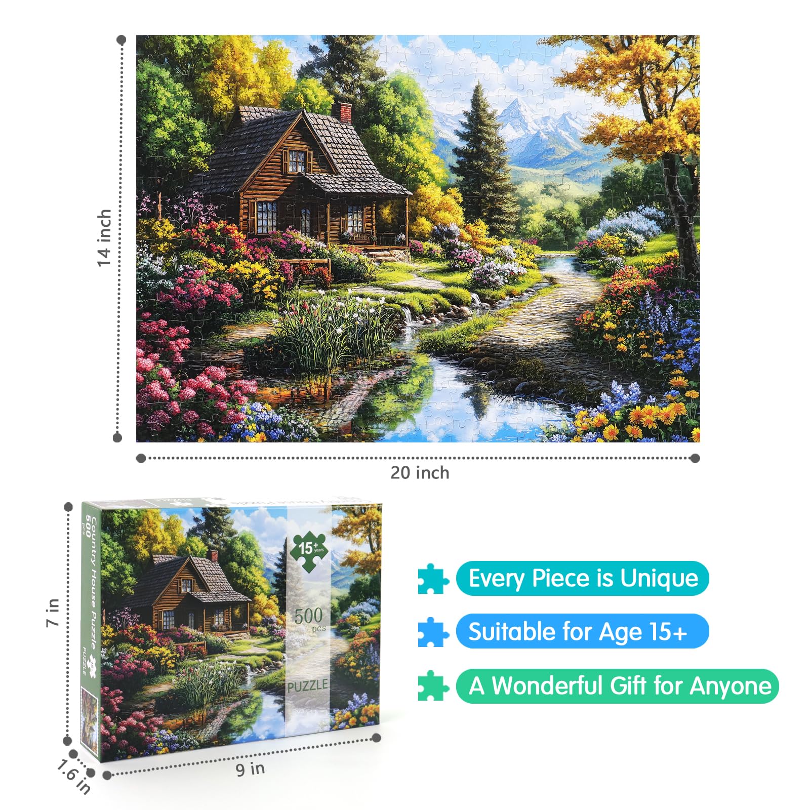 【500 Piece Puzzle】Escape into a tranquil mountain scene with this enchanting 500-piece jigsaw puzzle featuring a charming log cabin nestled in nature's embrace. Perfect for intermediate puzzlers. Once finished, the large size of 20 x 14 inches makes for a beautiful display piece in any room.