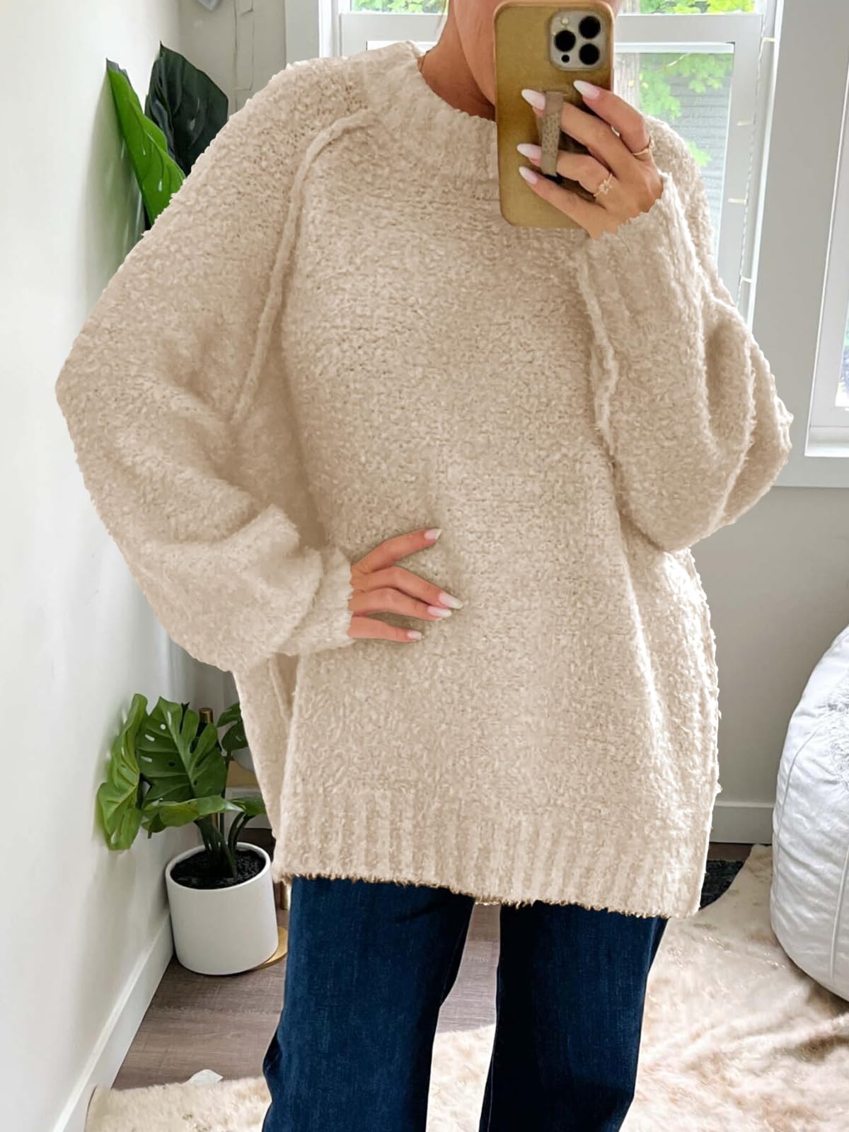 Features: Fuzzy fabric, oversized, long sleeve, ribbed knit hem, crew neck, drop shoulder, casual slouchy style, loose fit, solid color. The fuzzy sweater for women is good for early spring, fall and winter days.