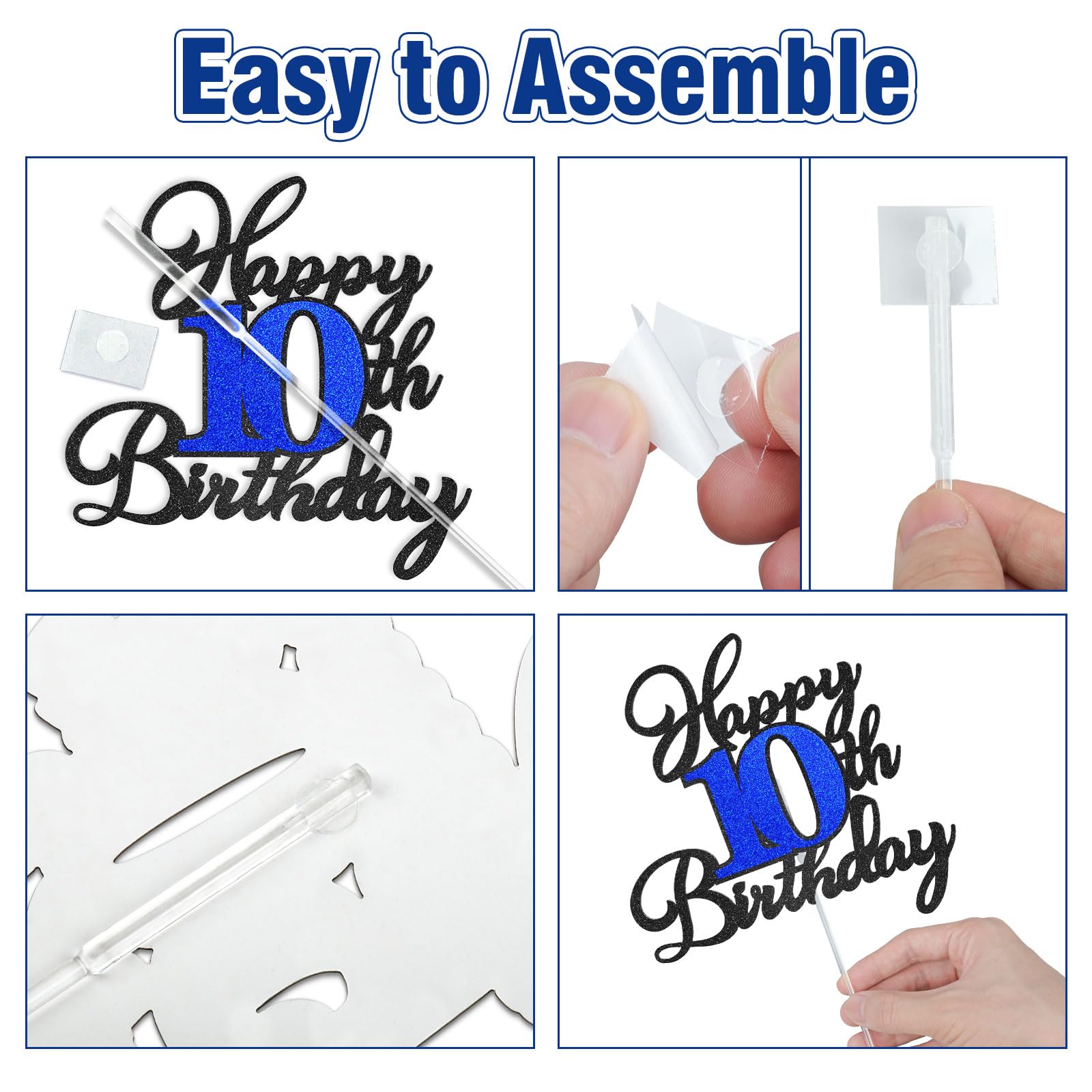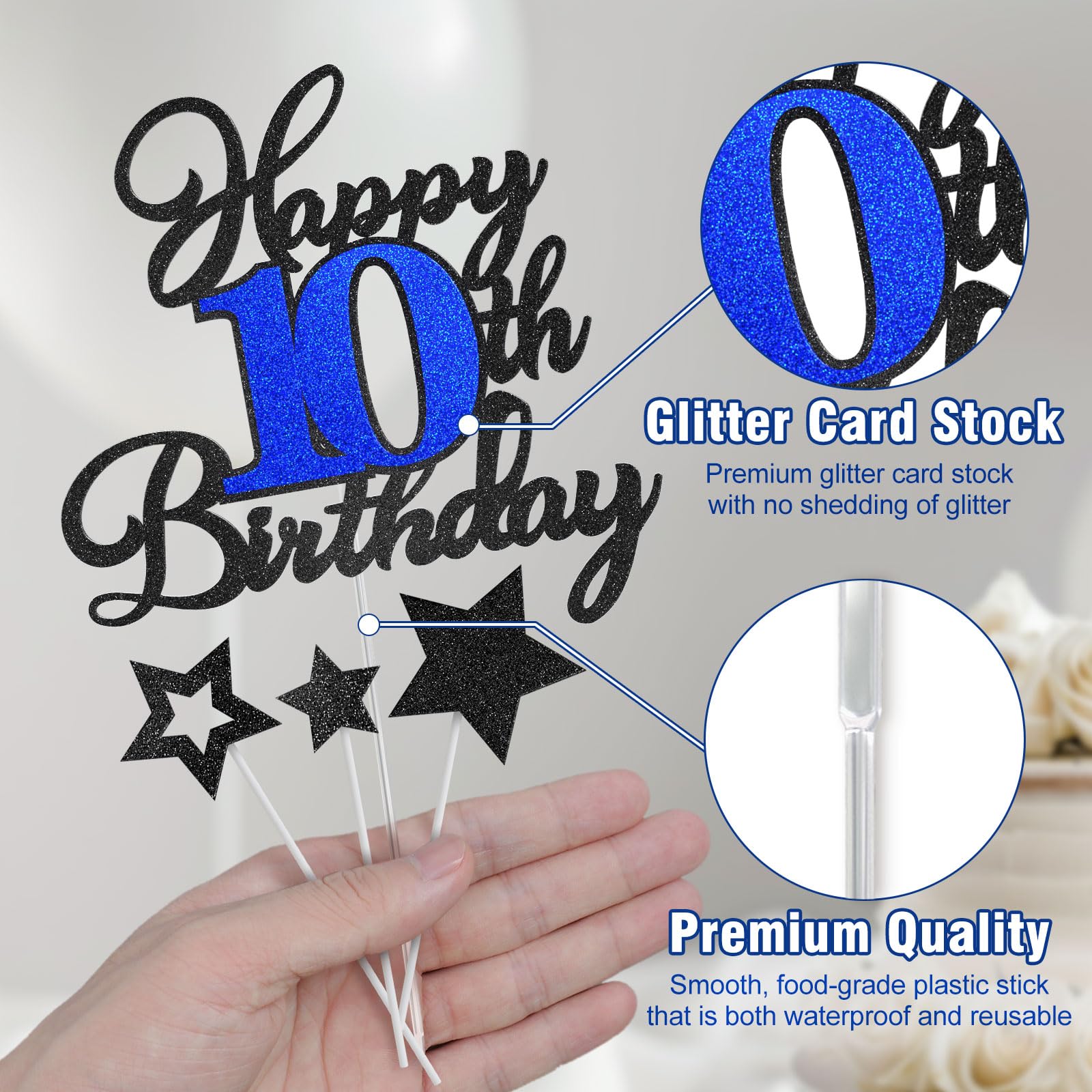 【Premium Quality Glitter Cake Decorations】The "Happy 10th Birthday" cake topper will be shiny under the light. The cake topper includes a smooth, food-grade plastic support stick, it's waterproof and reusable. It is protected by cardboard and can effectively avoid the product being damaged, give you nice using experience.