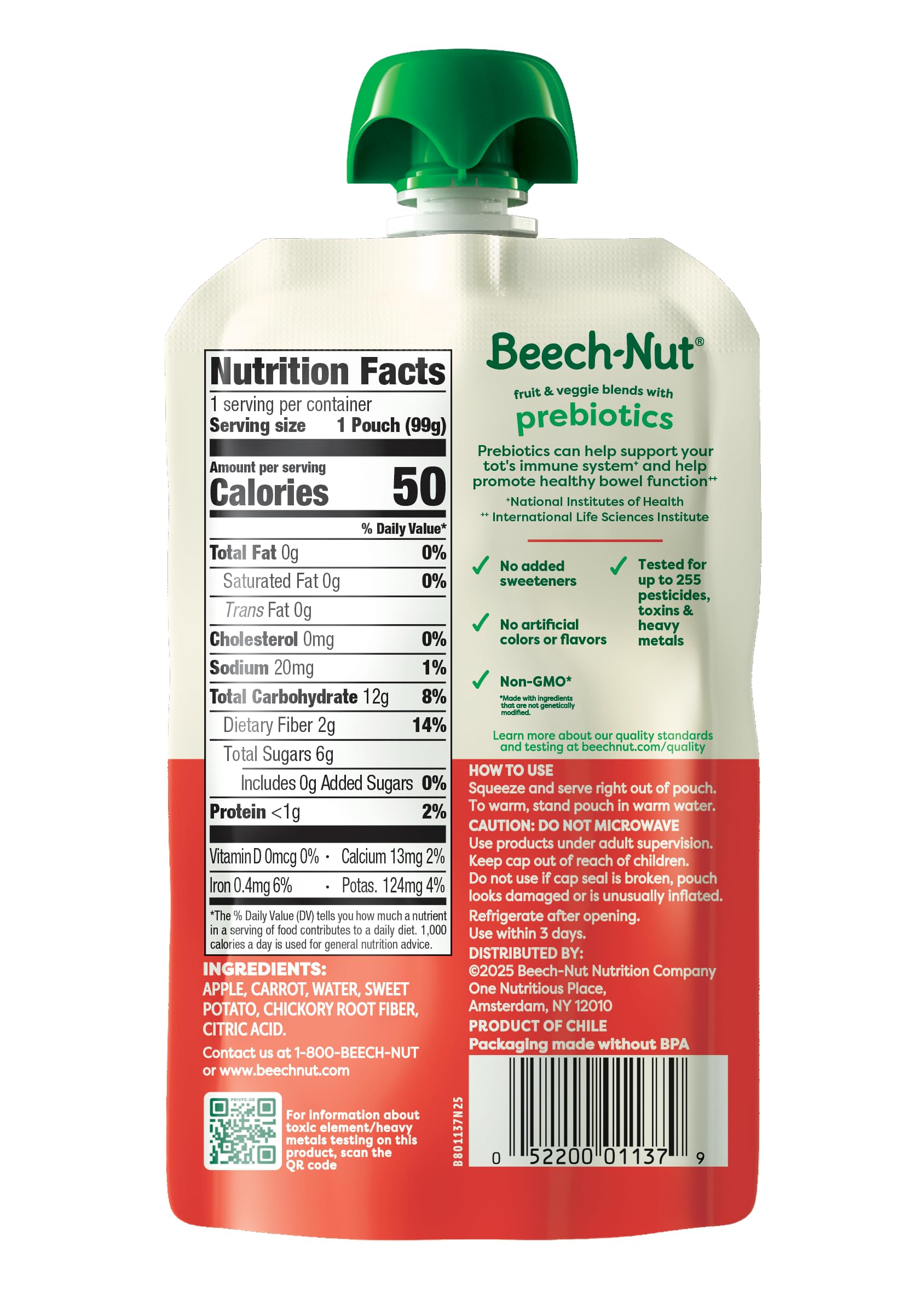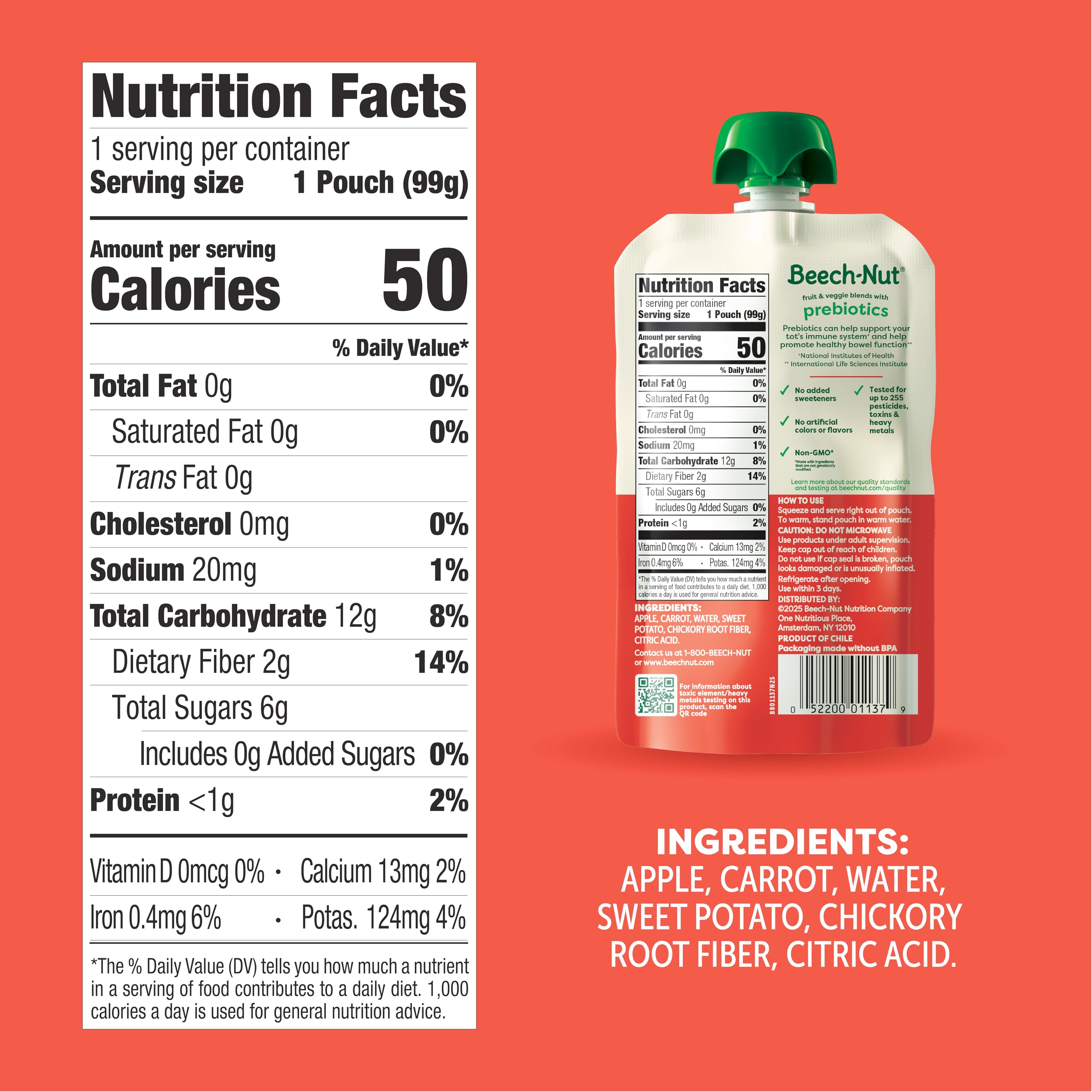 Beech-Nut Baby and Toddler Food Pouches are made with real ingredients and packed in convenient pouches for on-the-go feeding. Our Prebiotic Fiber fruit & veggie blend pouch contains a puree of carrot, apple & sweet potato. This blend also includes 2g of prebiotic fiber to help promote healthy bowel movement and help support immune system functions*. This Stage 4 Beech-Nut pouch is ideal for your 12+ months old toddler. *Source: International Life Sciences Institute, National Institutes of Health.
