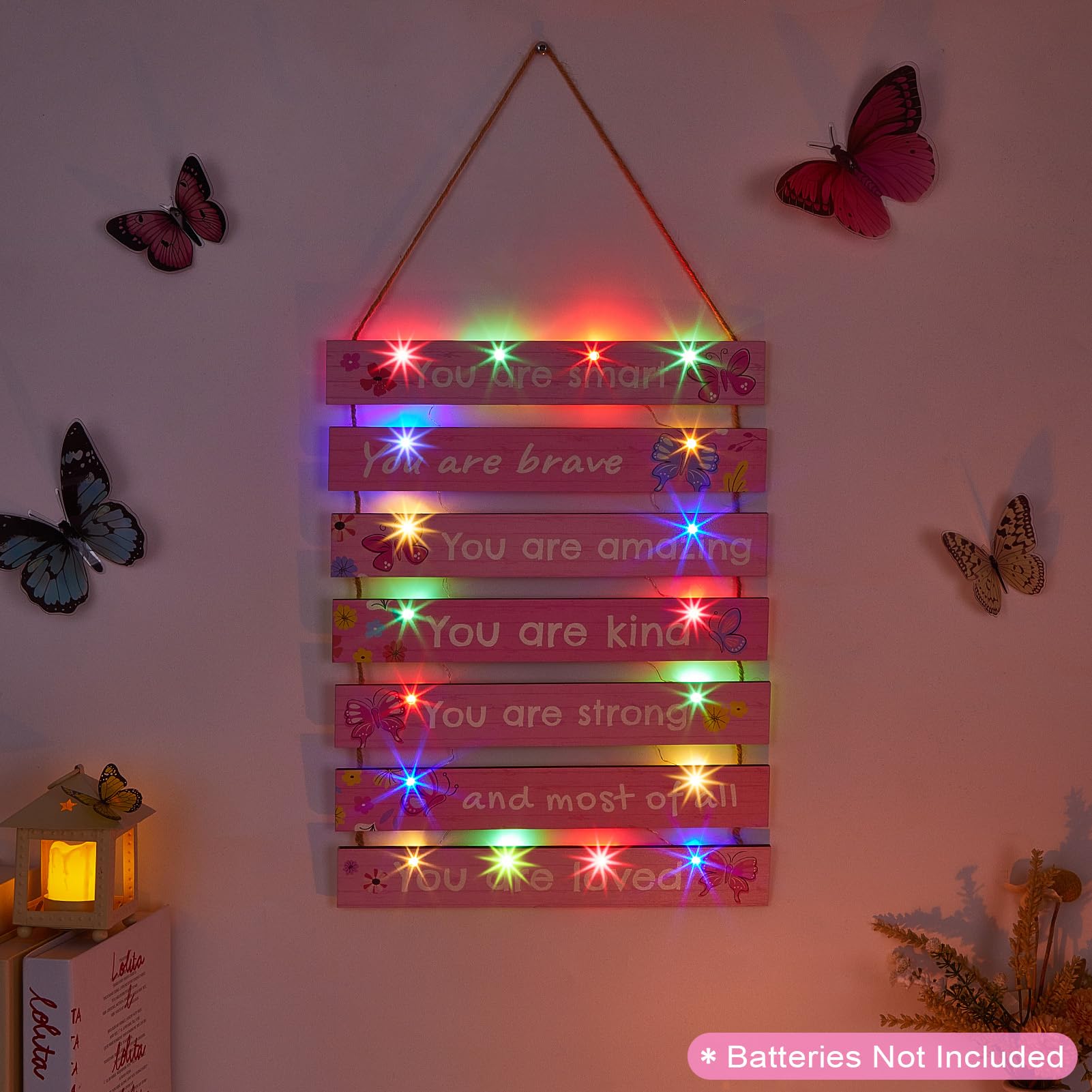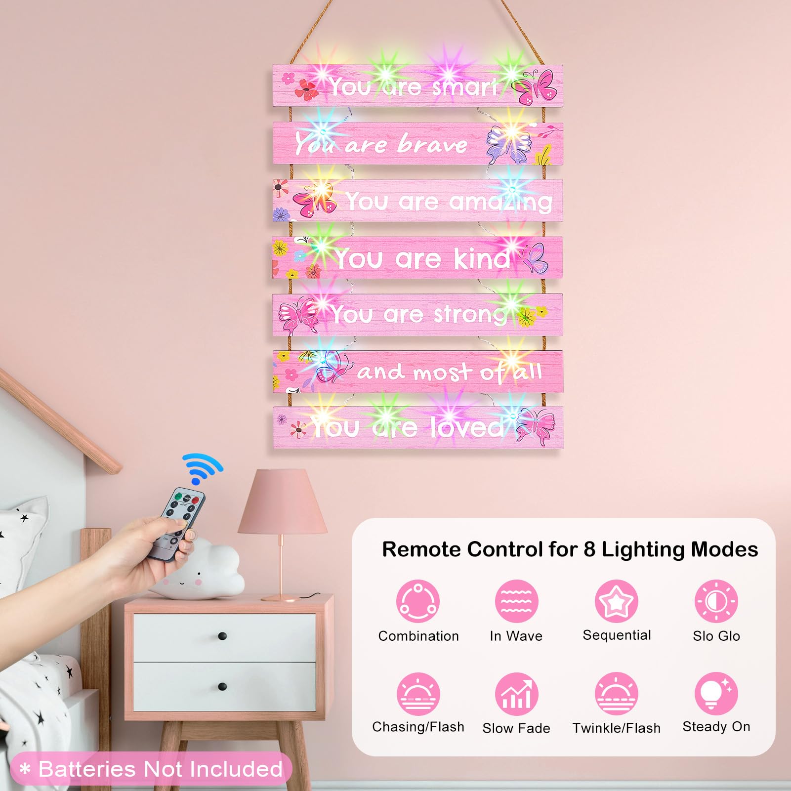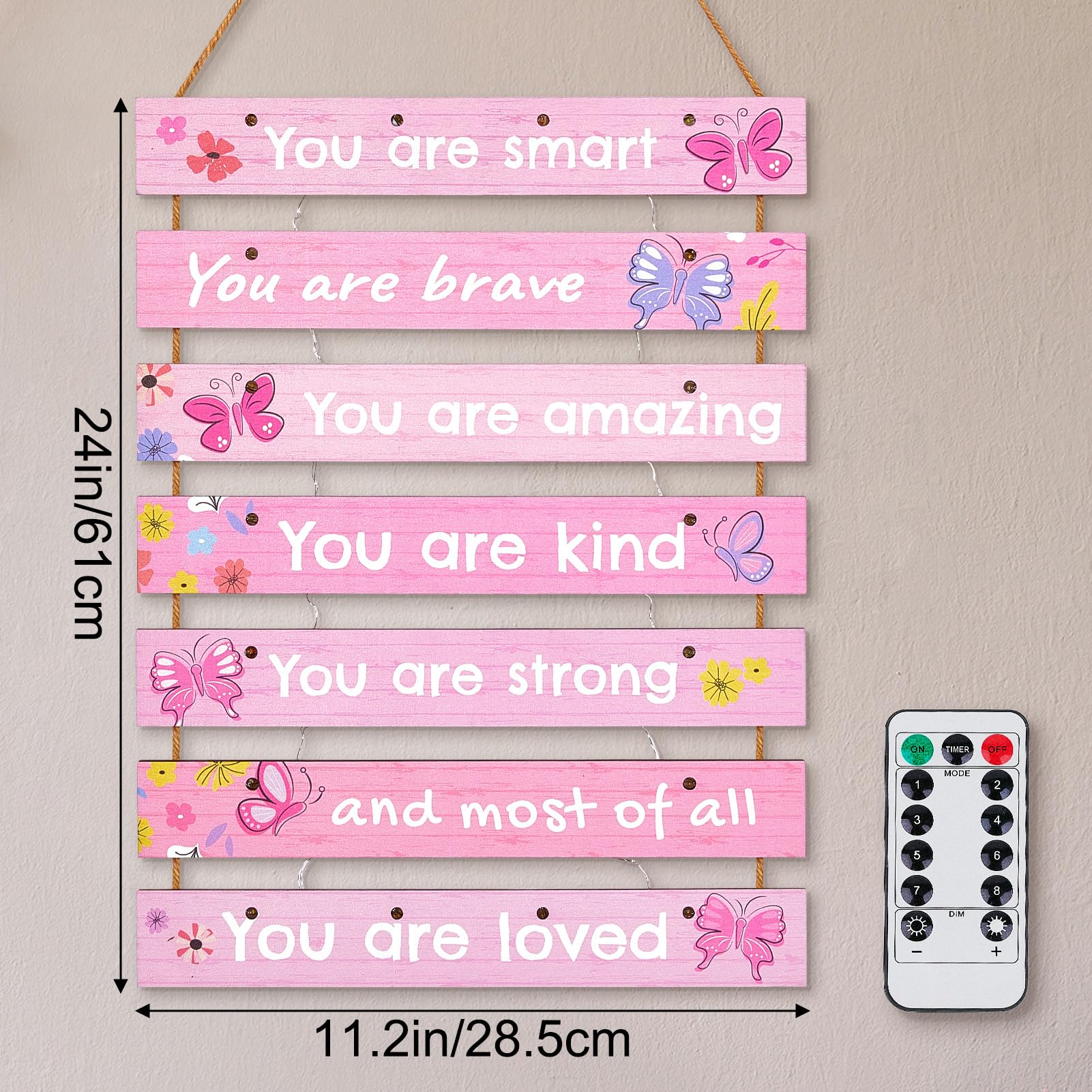 Package: The play room decor for kids package includeds 1 pcs girls room decor board, 1 pcs LED light with empty battery box (not including batteries), 1 pcs remote control (not including batteries), both do not including batteries, need to be purchased by customers themselves