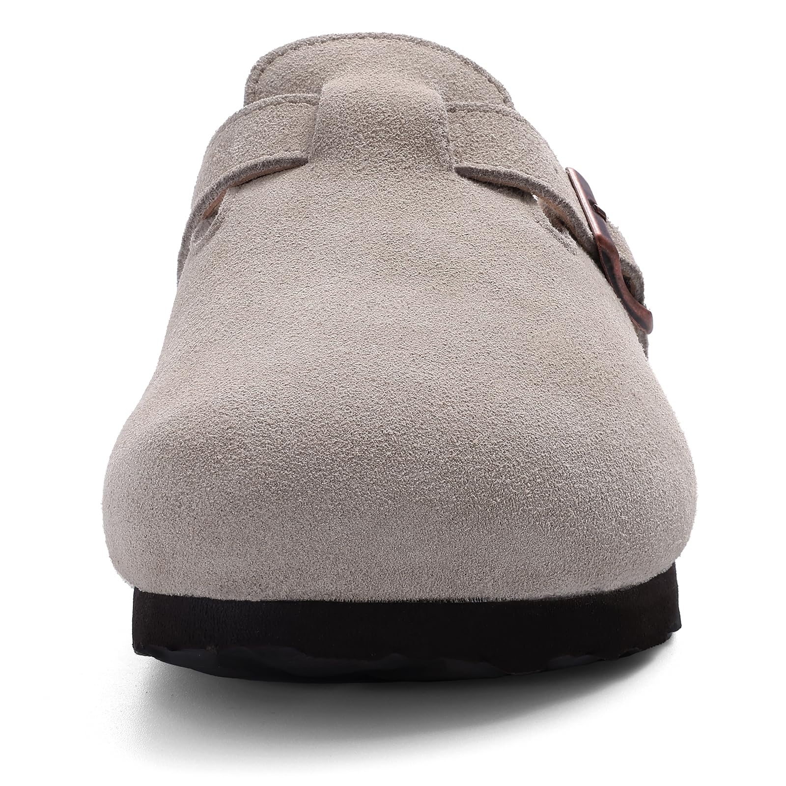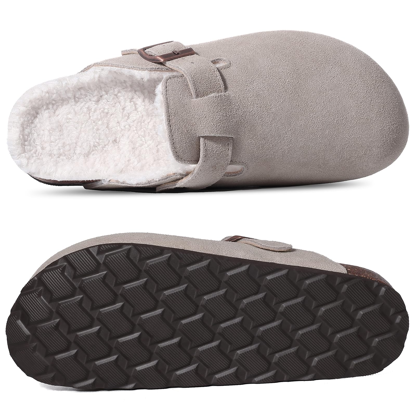 𝗙𝘂𝘇𝘇𝘆 𝗦𝘂𝗲𝗱𝗲 𝗖𝗹𝗼𝗴𝘀: Adjustable Metal buckle adds a stylish touch of style, the 100% genuine leather upper is pretty classy and footbed is covered with luxurious plush. You can paired them with your wardrobe for that put together but effortless look.