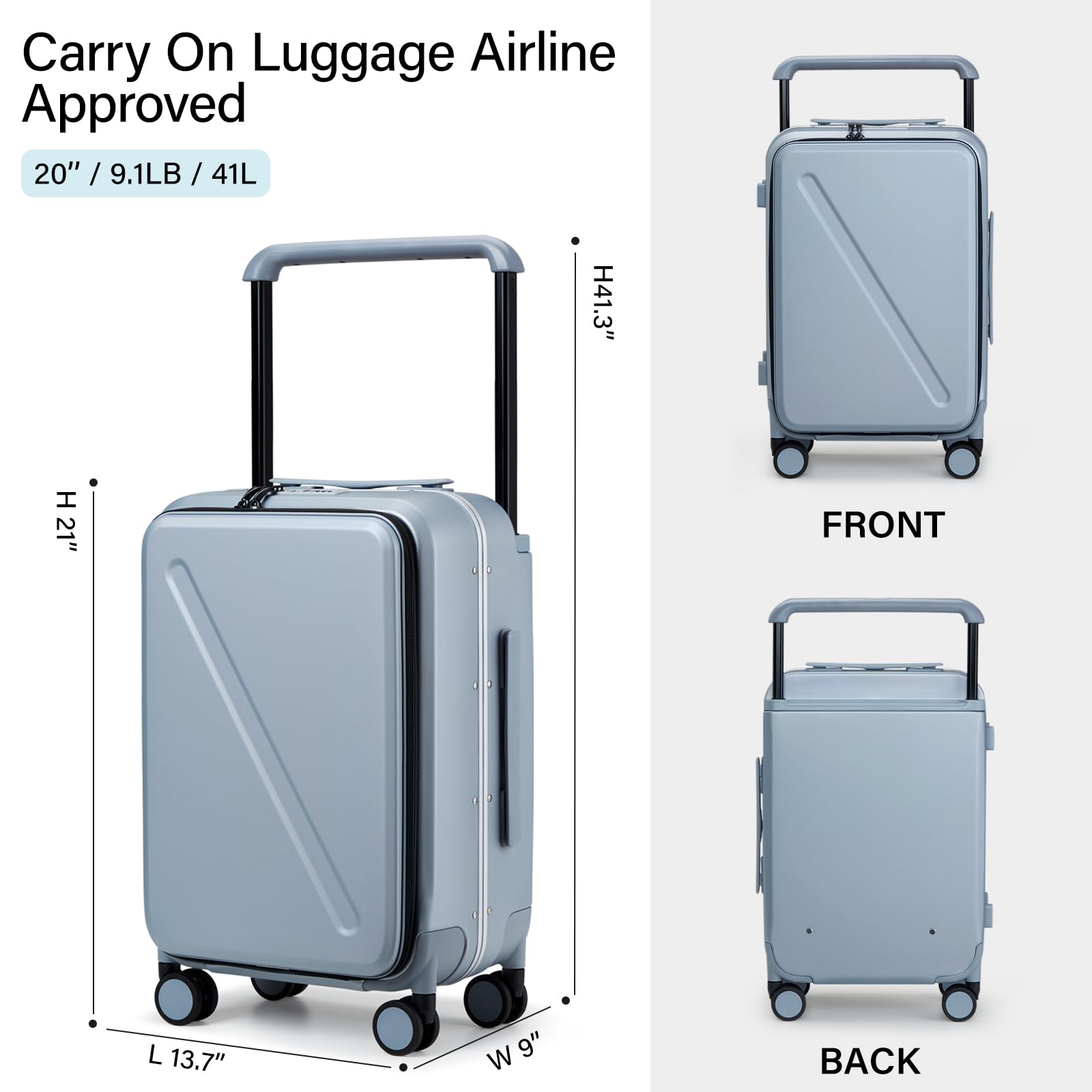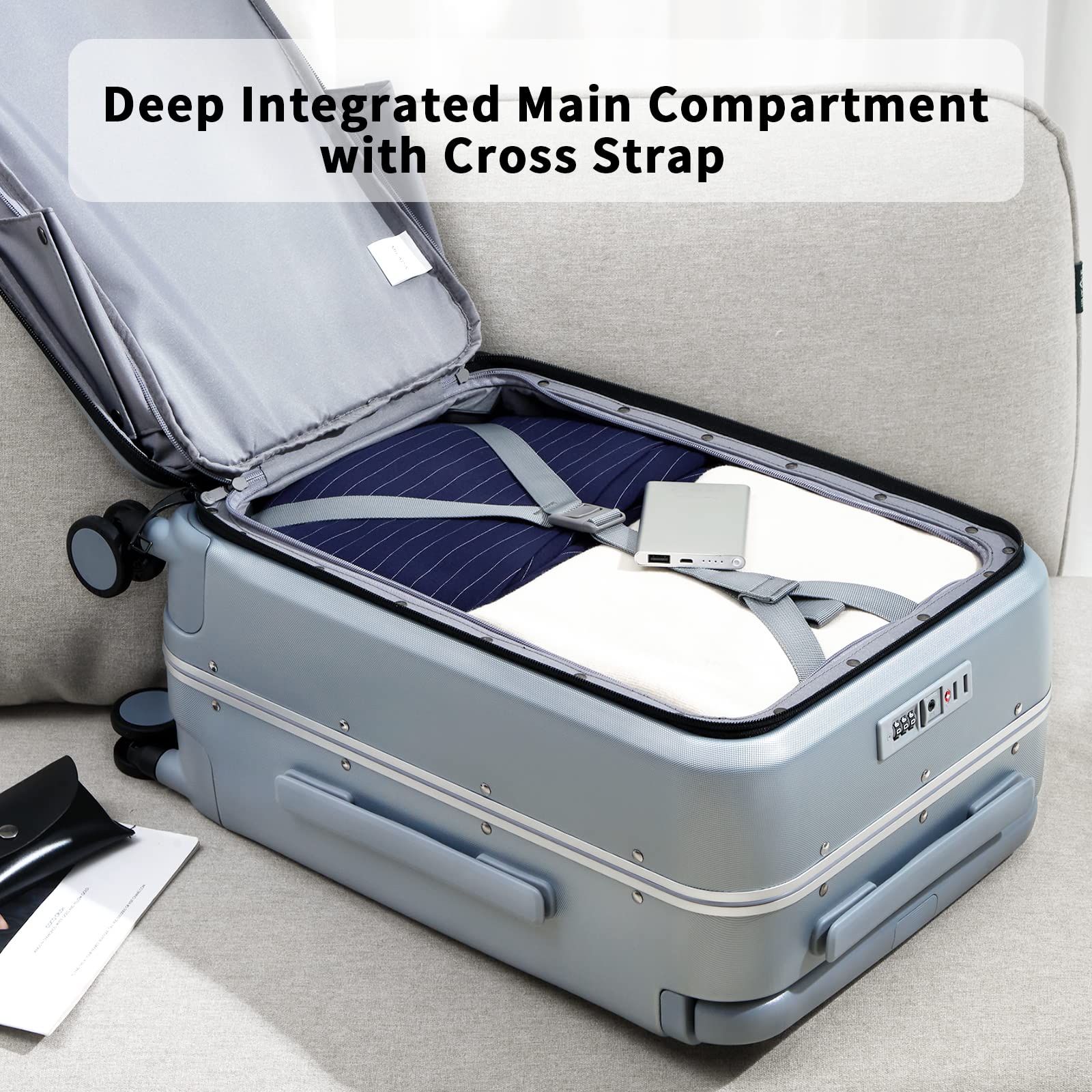 【Convenient Practical Internal Structure】This 20" carry-on features a strategic front compartment with a dedicated laptop sleeve and multiple organizational pockets. The interior zipper opens to a deep main compartment equipped with a strap to secure clothing and prevent shifting during travel