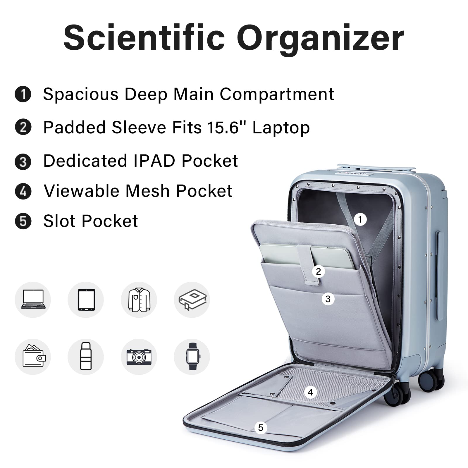 【Fastly Opening Front Compartment】Our suitcase with front pocket choice hard side feature with a front compartment for 15.6" laptop, so it would be easier to go through security at the airport. And you can zipper it open quickly to get your laptop or electronics in and out at any time and where