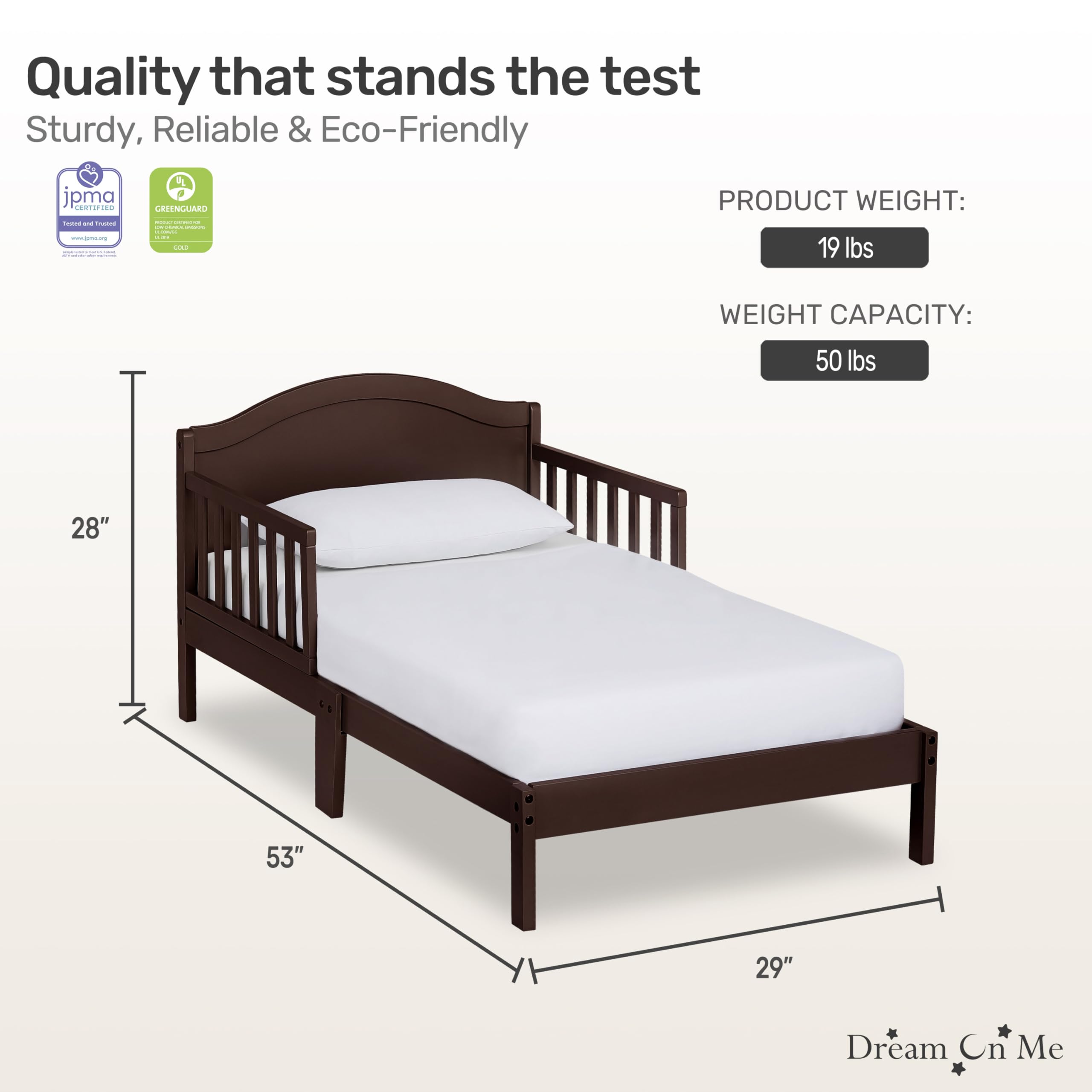 Make the crib-to-toddler transition easy and reassuring with the Dream On Me Sydney Toddler Bed. Sitting low to the floor so little legs can climb in and out confidently, the Sydney includes two side safety rails and center legs for reinforced stability, while sturdy wooden slats provide reliable mattress support. Its chic, modern silhouette with a bell-shaped full panel headboard blends beautifully into any kid’s room, and the elegant, non-toxic finishes complement a wide range of décor. Safety is built in: the Sydney is JPMA certified, meets or exceeds all applicable ASTM and CPSC standards, and is free of phthalates, latex, lead, and BPA. Designed to fit a standard-size crib mattress (for the best fit, pair with a Dream On Me non-toxic, Greenguard certified standard crib mattress), it offers a compact footprint that works in rooms of all sizes. Dimensions: 53" L x 29" W x 28" H; product weight: 19 lbs; maximum weight limit: 50 lbs.