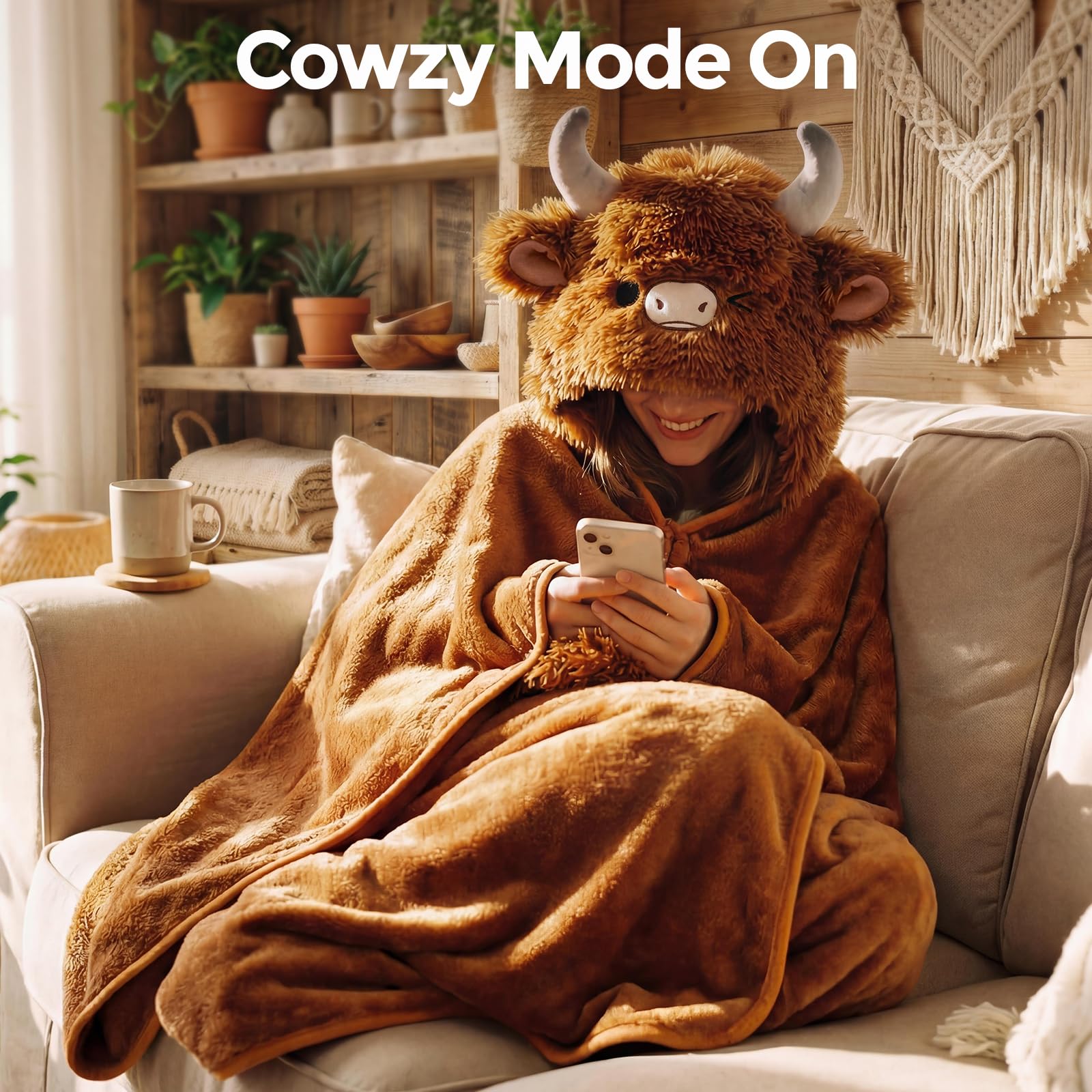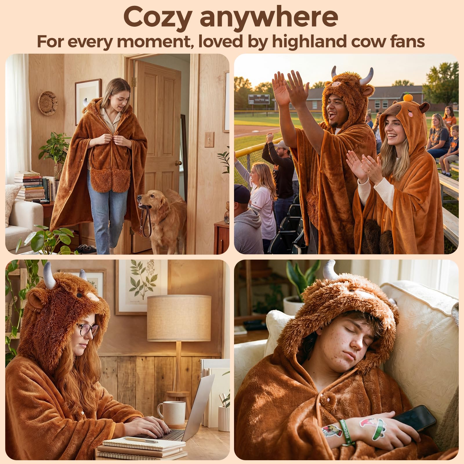 VERSATILE & HANDS-FREE DESIGN: Designed for both lounging and mobility, our oversized hooded highland cow blanket is perfect for any season. Featuring a button-up design, it allows you to move freely while keeping your hands free—ideal for sipping morning coffee, working from home, or enjoying a movie on the couch. It easily transitions from a cozy highland cow costume to a snug sofa blanket, making it an ideal highland cow gift for loved ones.