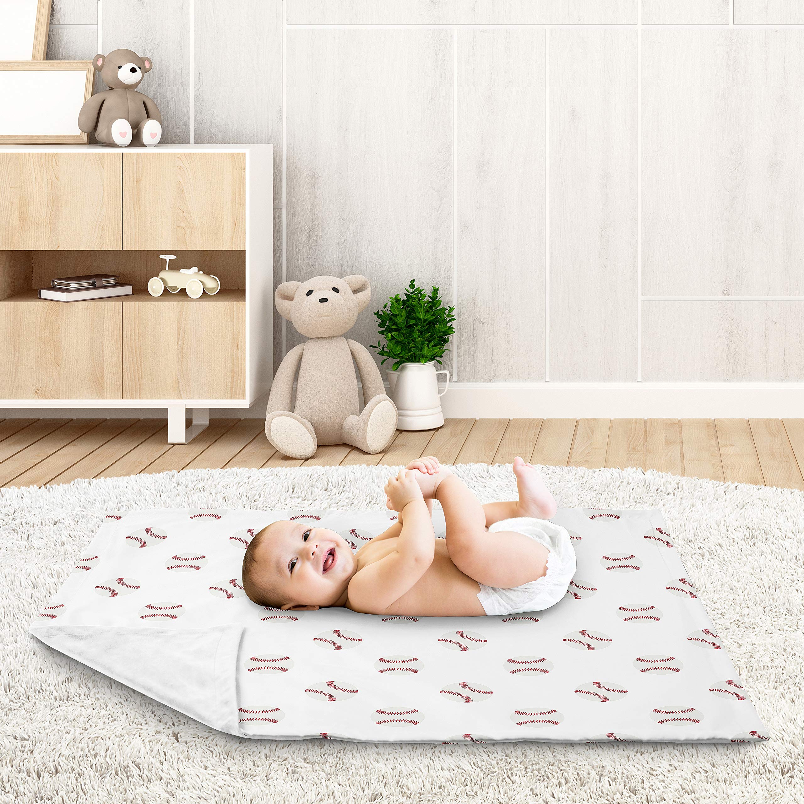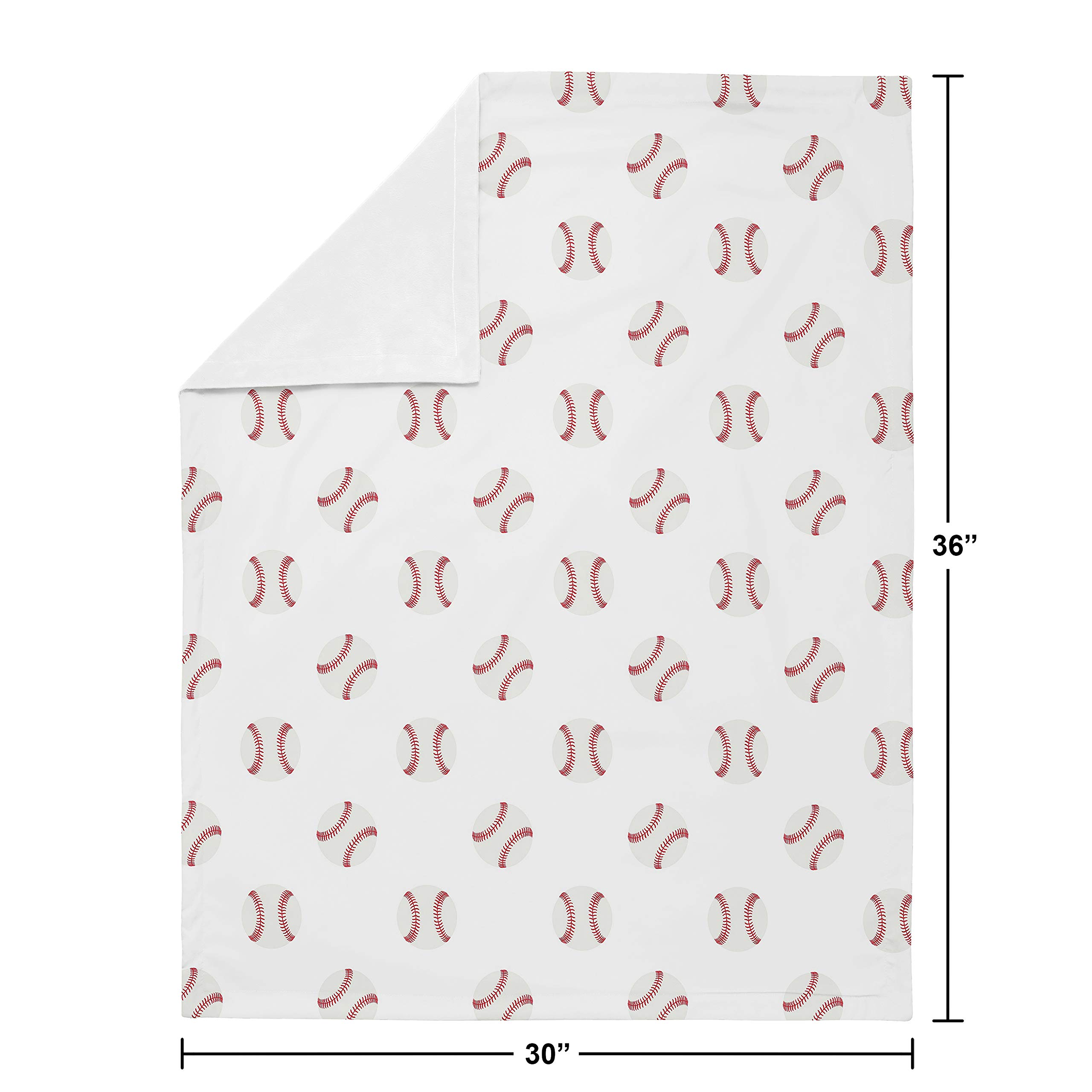 Blanket is designed using a red and white baseball brushed microfiber print and reverses to soft white minky