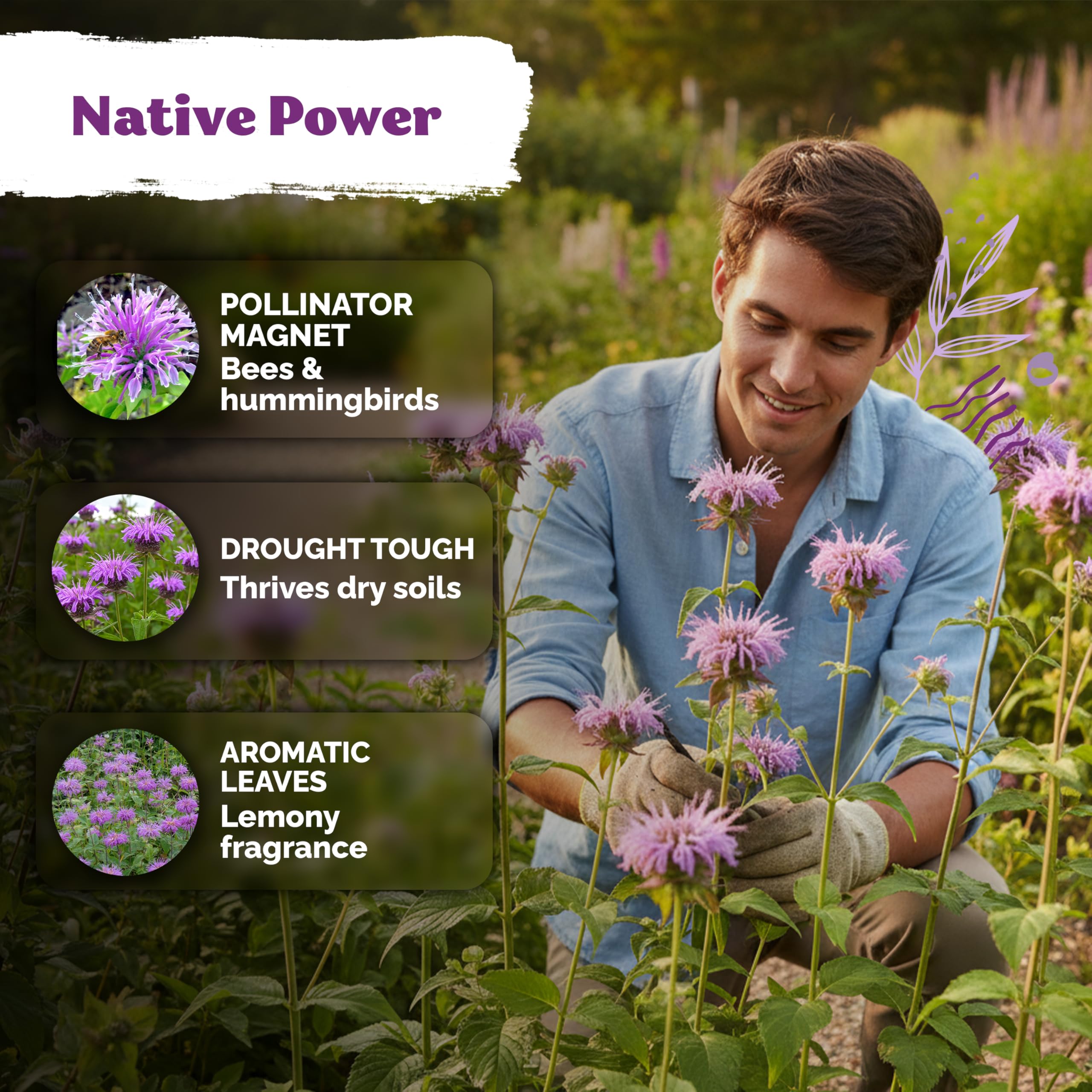 Low‑Water Performer: Drought‑tolerant native bee balm seeds needs rare drinks once rooted; These perennial wildflower seeds grow up to 2-4 ft resist deer & mildew, scenting herb gardens with citrus aroma and bees.