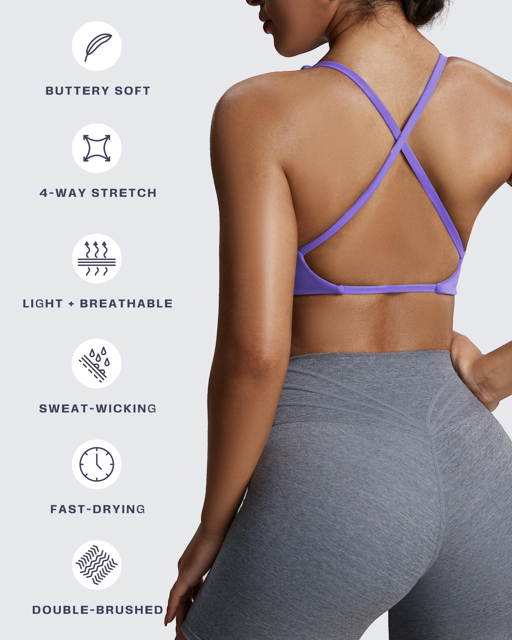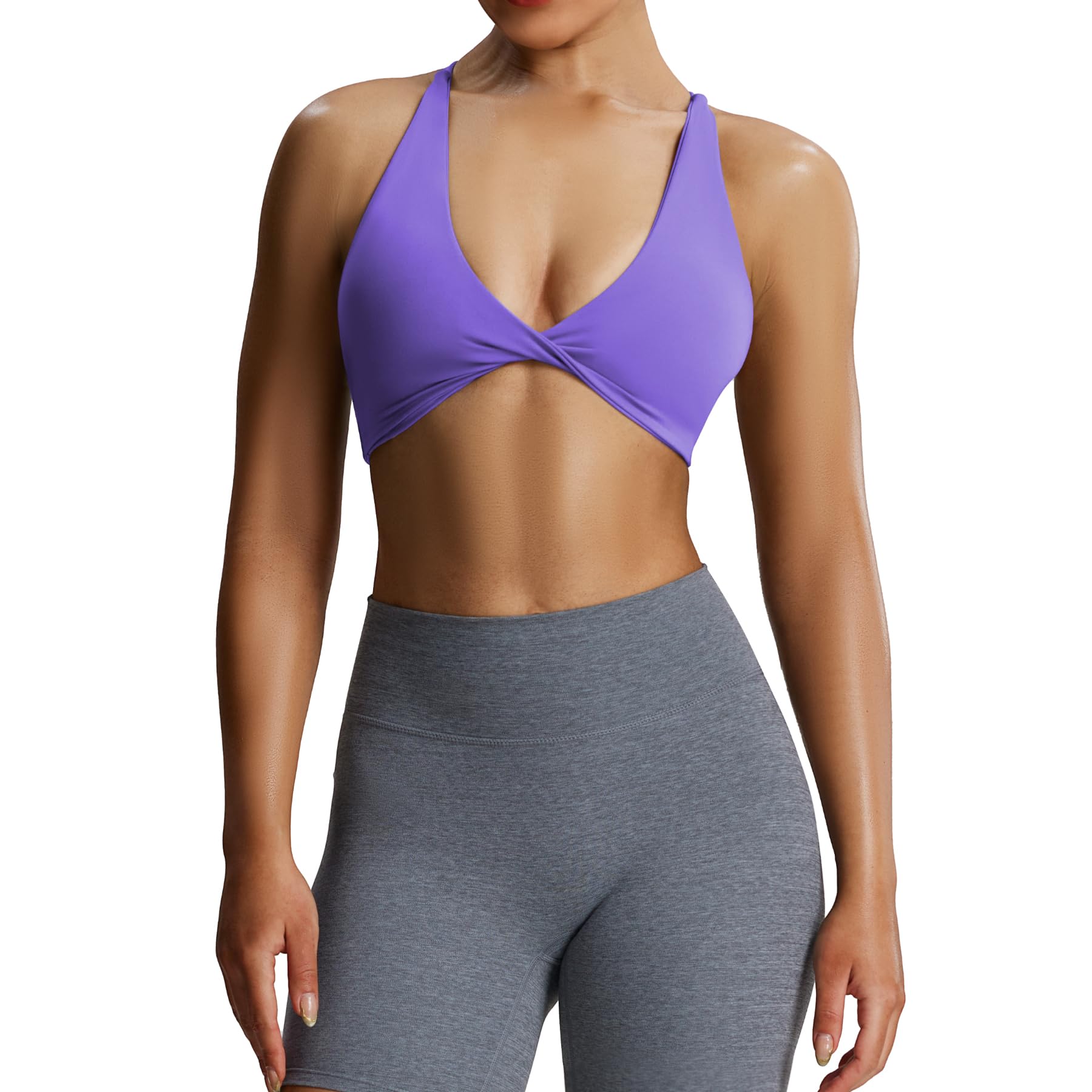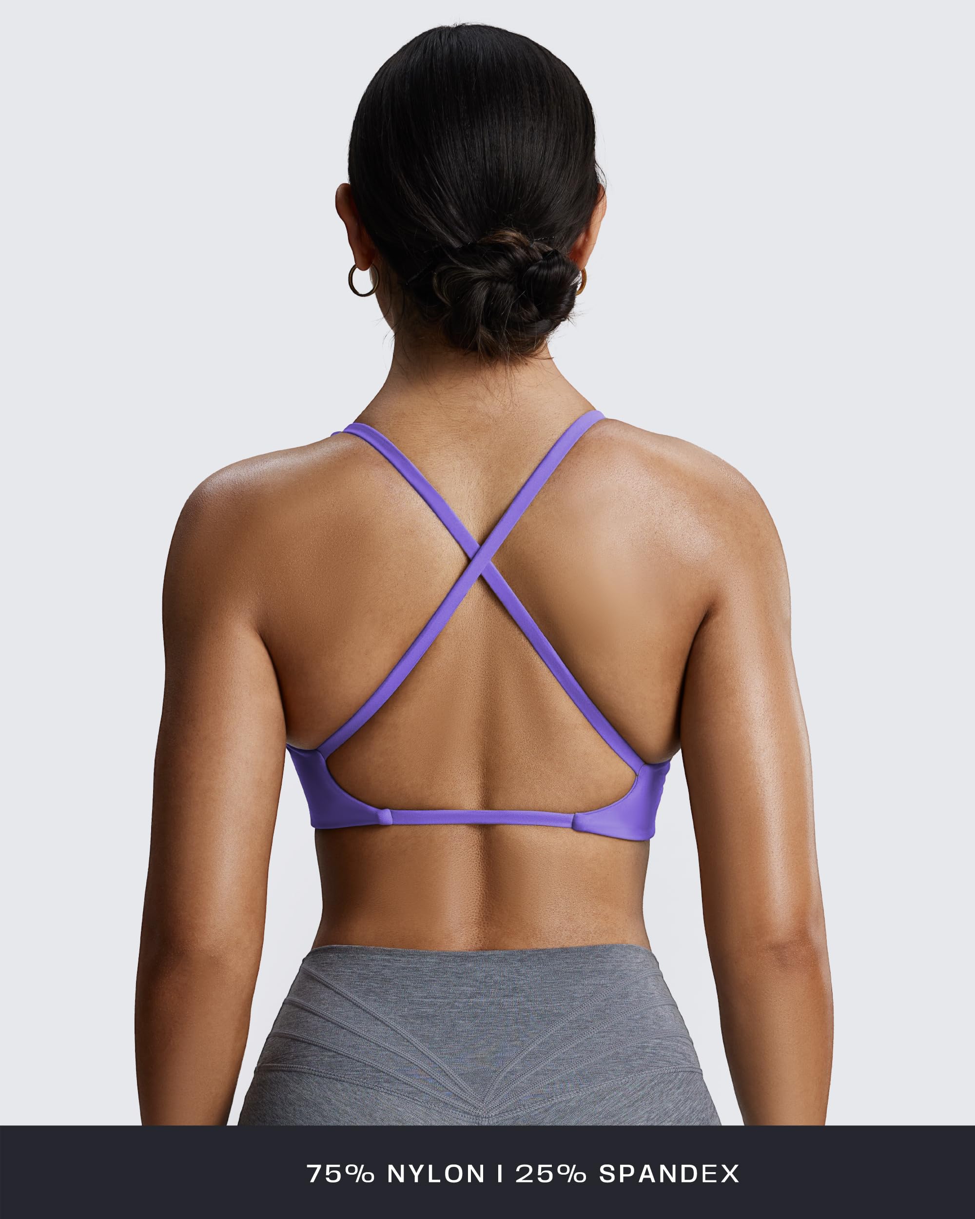 The Sienna twist womens sports bra featuring thin crossed back straps and padding, despite small straps, it doesn’t bite into your traps and cause neck pain