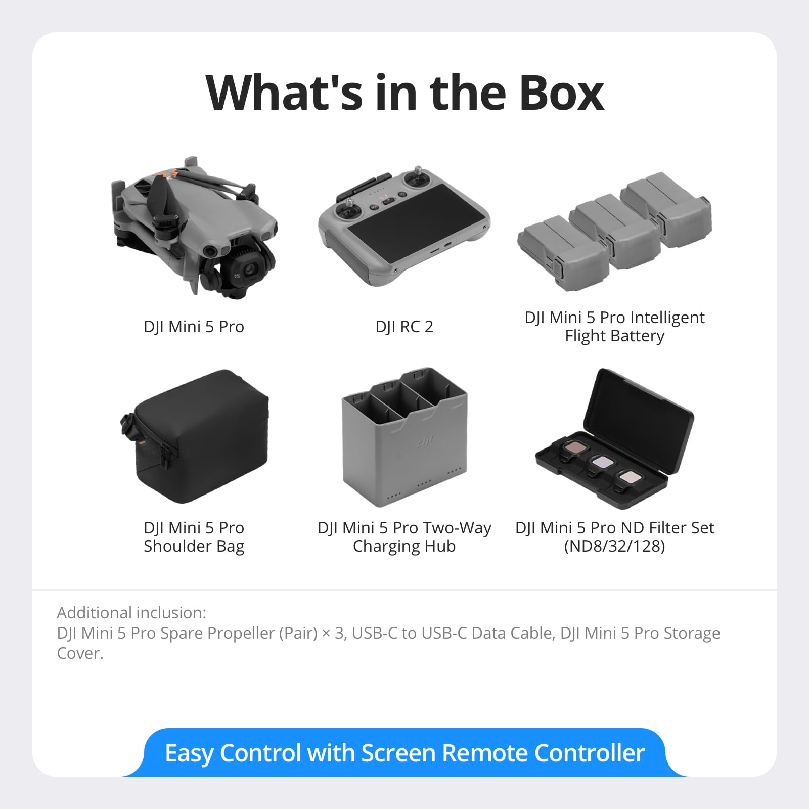 Includes DJI Mini 5 Pro, DJI RC 2, three batteries, spare propellers, a charging hub, ND filters and more for clear vision, confident flying, and beginner-friendly use.