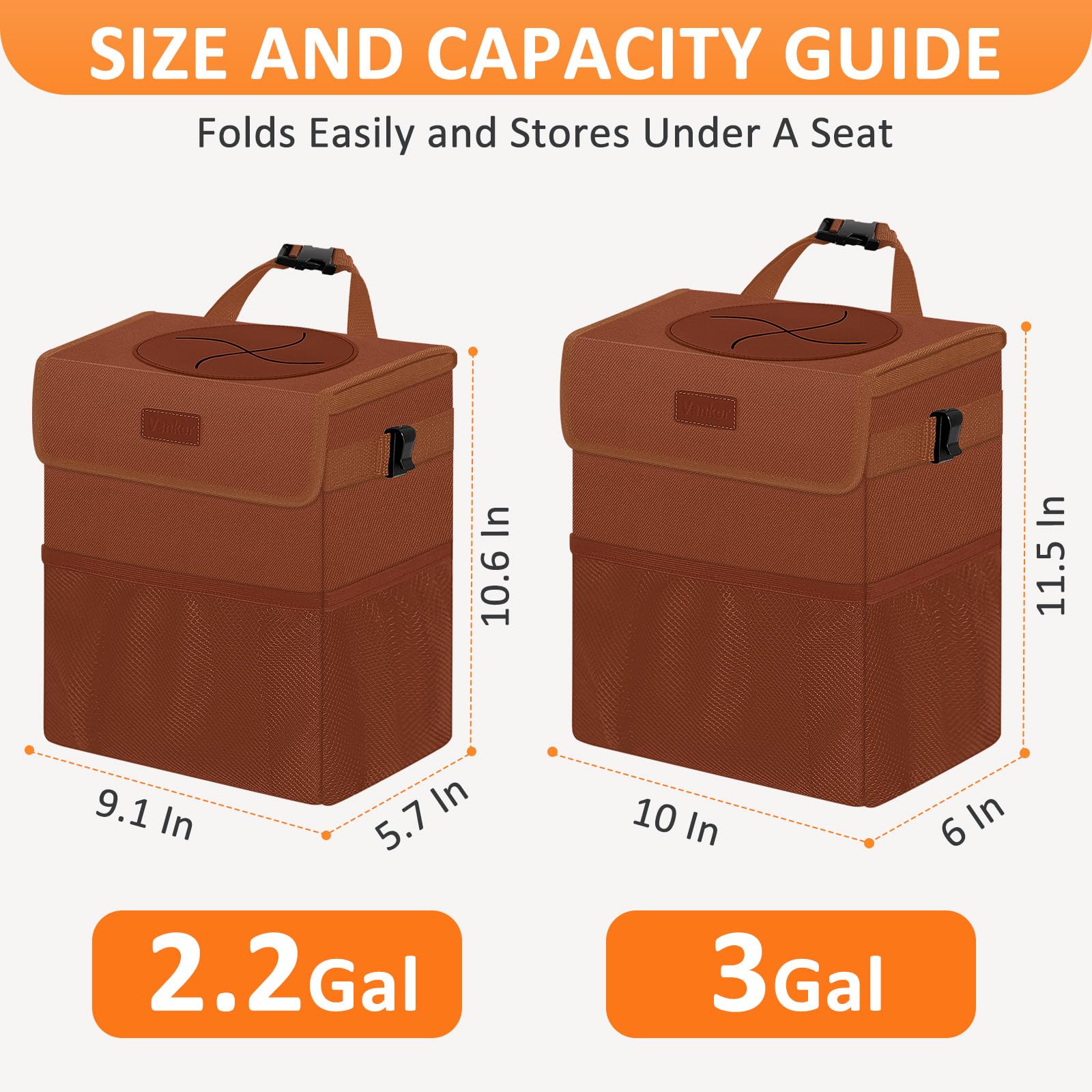 Intimate Design& Capacity: There are 2 side clasps for fixing disposable bags, effectively preventing falling out; Vankor car trash bags have about 2.2 and 3.0 Gallons for storage of car garbage or other stuff; Car trash bin has 100% leak-proof PEVA thick lining, no spillages will happen and is easy to be cleaned; The extra-large opening is made of elastic soft rubber, very roomy and easier to put litter into the bag, and helps to keep trash from spilling