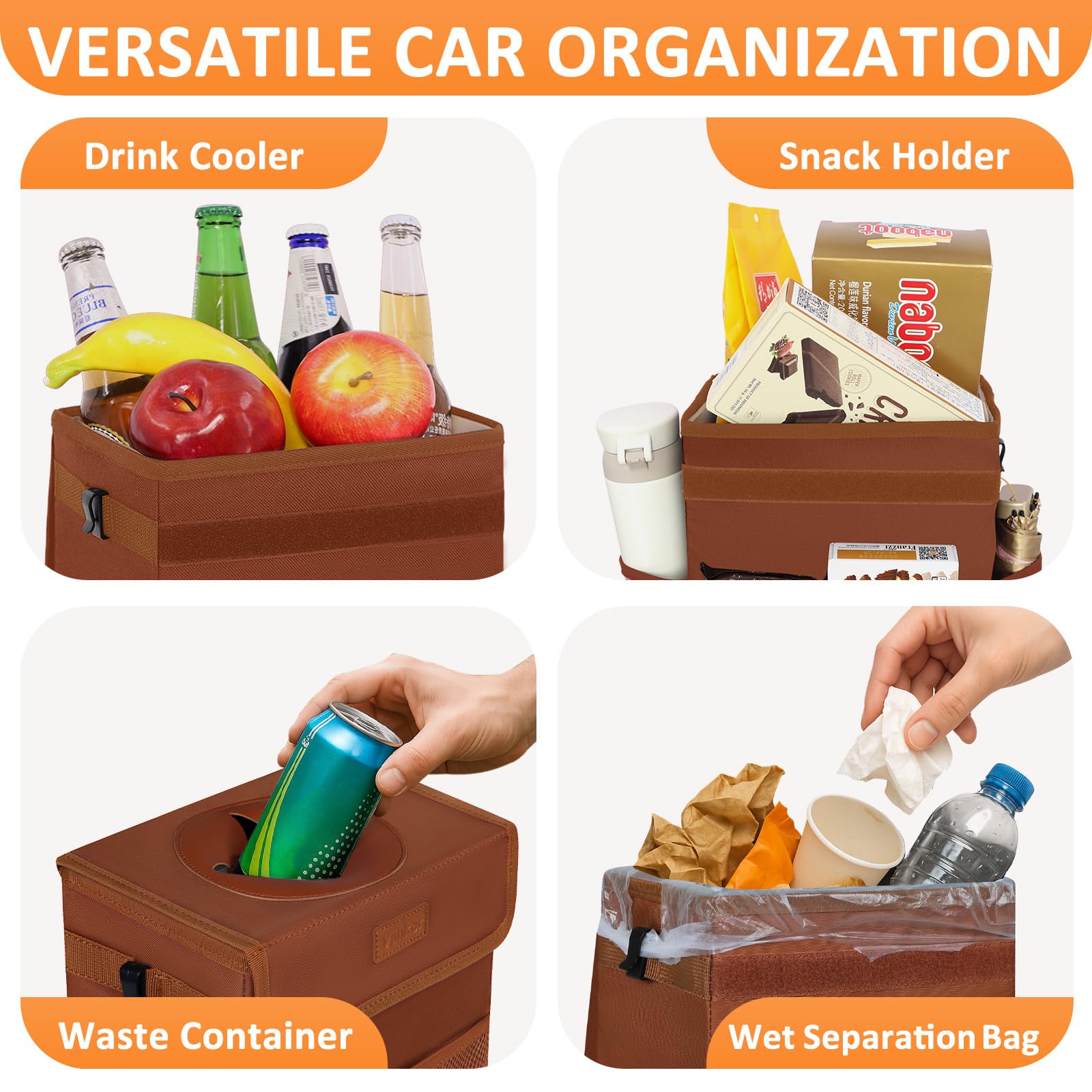 Wide Compatibility: An thoughtful solution for people who have the need for car neat and car interior storage; Perfectly fits varieties of types of vehicles including sedans, SUVs, RVs, trucks, vans, minivans, boats, campers, taxis, buses, etc; Auto trash can for car is very sturdy , has a long service life, and is very convenient to carry; The car trash can for the back seat is foldable, when you don't need it, just fold it up without taking up any space