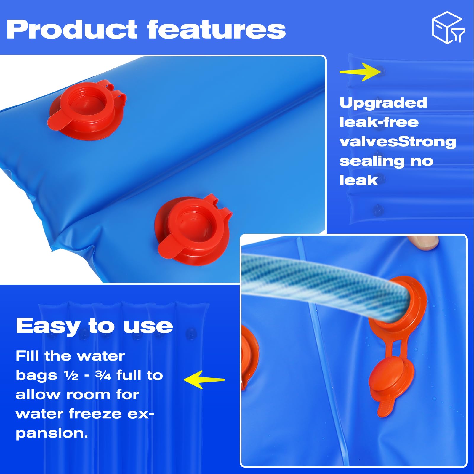 【Premium Material】- Each of our water tubes are made of heavy duty 25 Gauge thick vinyl material thicker than 90% of pool water bags on the market. Upgraded leak-free valves keep water tubes from leaking and breaking in the winter. Double water tube has extra weight capacity,40% heavier than other water bags, making it super durable.