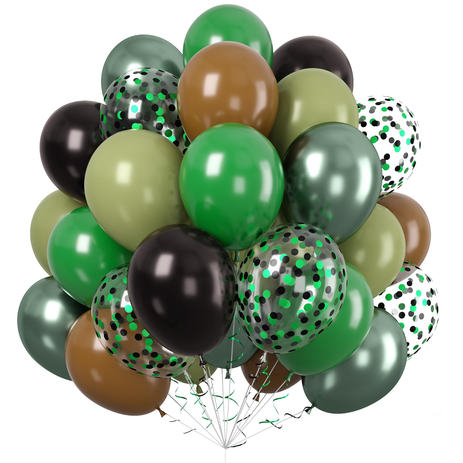 【WHAT YOU WILL GET】Our Camo Camping Theme Birthday Party Balloons include 50pcs latex balloons, designed to help you create stunning decoration: 15 x dark green balloons, 15 x black balloons, 15 x brown balloons, 5 x metallic avocado green balloons, 5 x retro avocado green balloons, 5 x confetti black green balloons, 1 x green ribbon and 1 x black ribbon. The size of the balloon is about 12 inches after inflation.coration.
