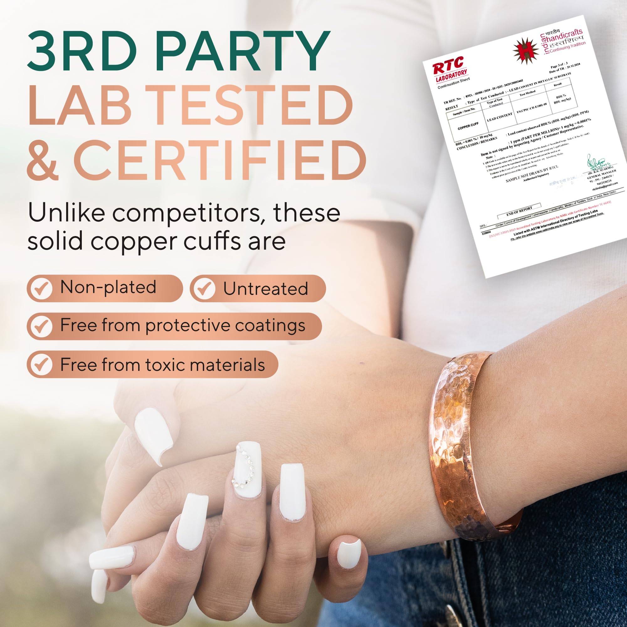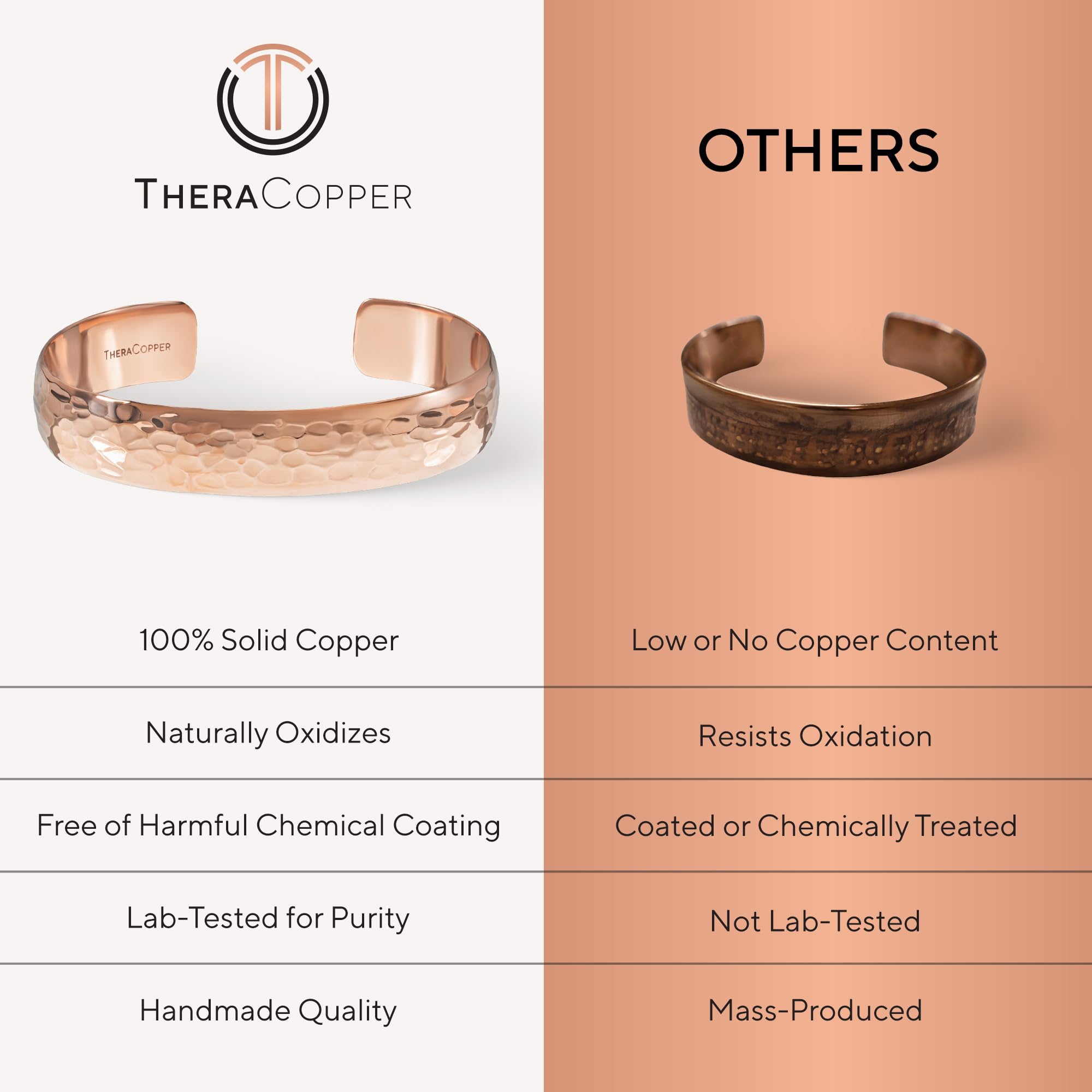 THE PUREST COPPER: Handcrafted with 100% pure copper, our real copper bracelet is lab-tested and certified free from harmful metals like lead, nickel, cadmium, and PFAS. Many alternatives use cheap, mixed copper or plated bracelets with toxic coatings—TheraCopper is completely natural, untreated, and safe. Over time, your pure copper cuff bracelet will develop a natural patina, a hallmark of authentic, untreated copper—not a defect. Simply restore its original shine with salt and lemon juice or any copper cleaner.