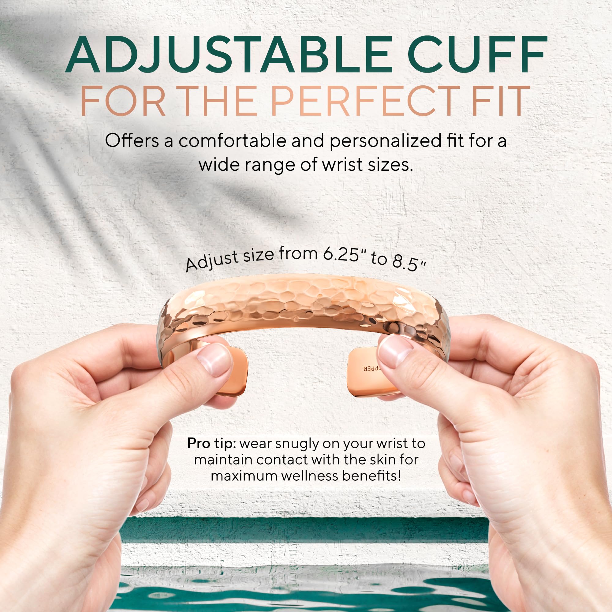 ADJUSTABLE FIT: Designed for all-day comfort, our open-cuff hammered copper bracelet easily adjusts to fit wrist sizes 6.25" to 8.5" (SMALL to X-LARGE). Whether it's a womens or mens copper bracelet, the customizable fit ensures a secure yet comfortable feel without compromising style. A perfect choice for those who appreciate the timeless charm and wellness benefits of real copper jewelry for women and men.