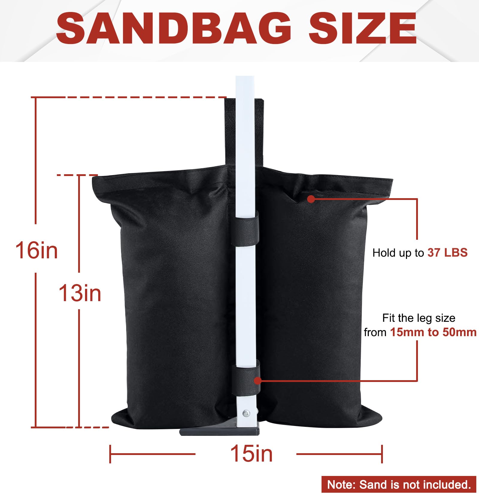 Multiple Versatile Uses: Perfect for securing tents, gazebos, camping shelters, sports umbrellas, and trampolines, these weight bags fit leg sizes ranging from 15mm to 50mm. A must-have for outdoor enthusiasts and event organizers.