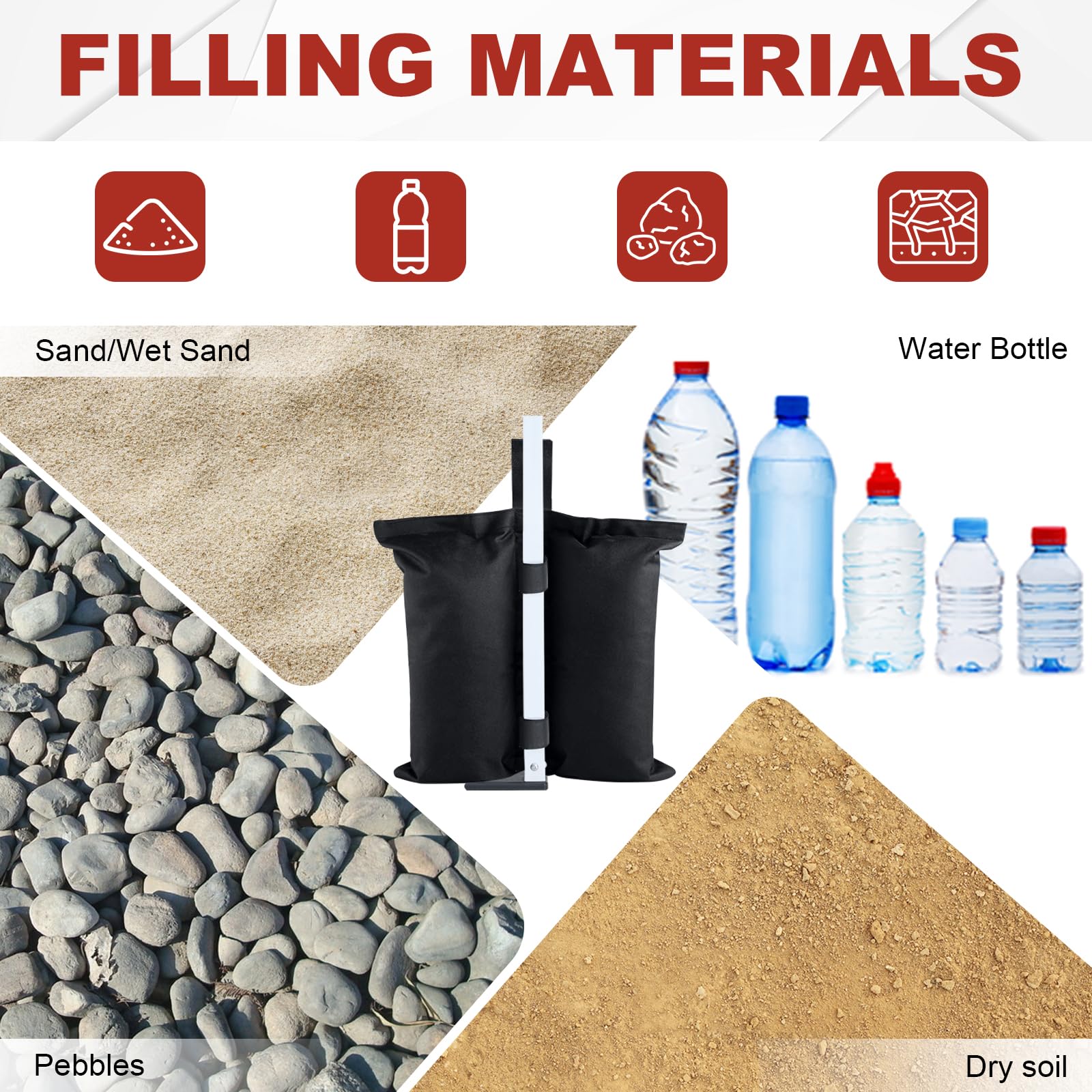 Flexible & Heavy-Duty Design: Each weight bag can hold sand, rocks, or dirt, offering reliable anchoring on any surface—grass, sand, or uneven terrain—for maximum stability.