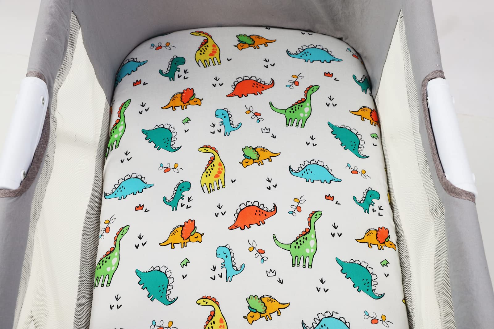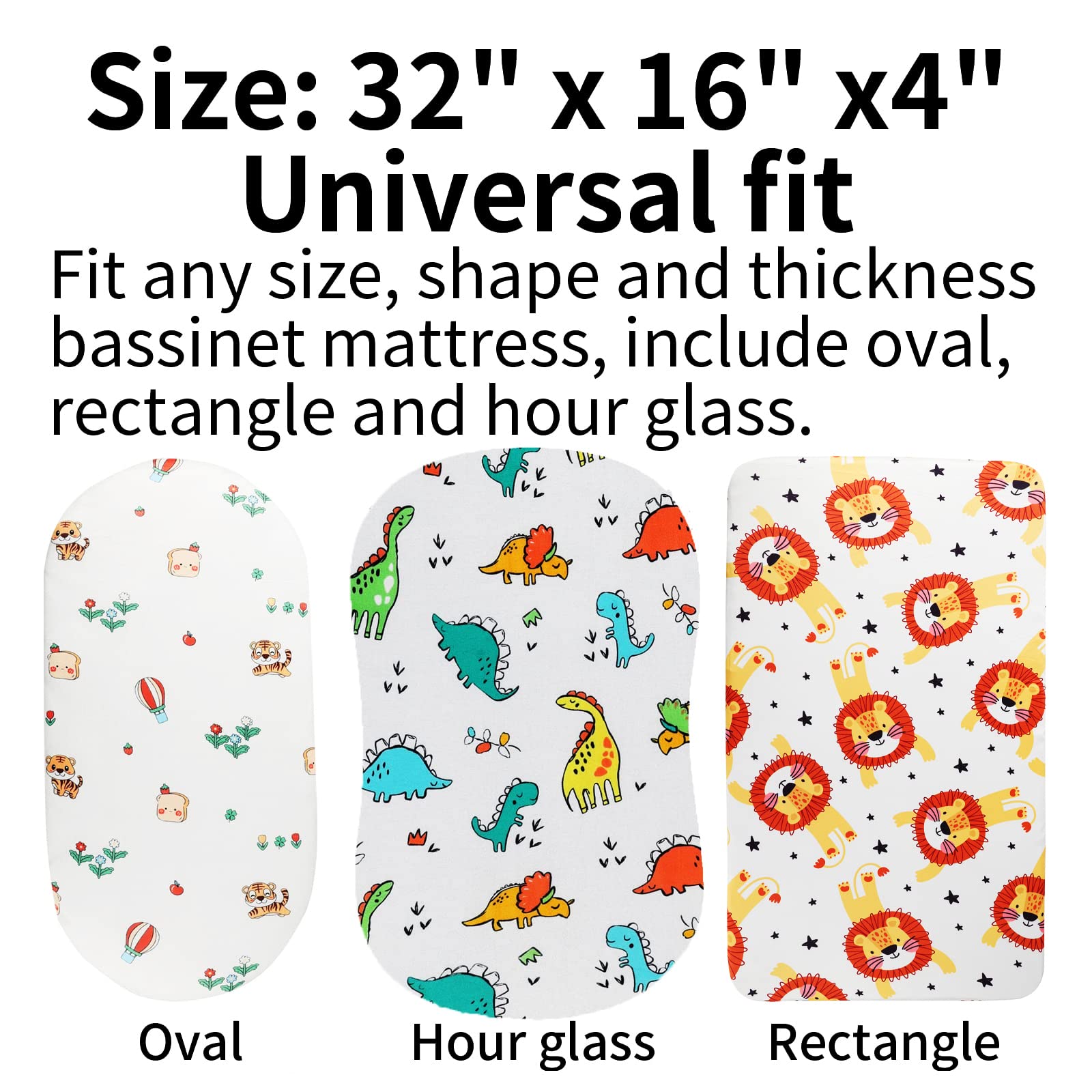 Bassinet Fitted Sheet Set 3 Pack for Baby Boy and Girl UNIVERSAL SIZE Each sheet measures 16"x32"x4", this size allows you to fit our sheets on almost rectangle, hour glass and oval bassinet mattresses. Example: 31 x 15 x 1 inch oval bassinet mattresses; 29.5 x 18 x 1 inch hourglass bassinet mattresses; 32 x 16 x 2 inch rectangle bassinet mattresses and 29 x 14 x 2 inch rectangle bassinet mattresses. 360Β°ELASTIC BAND With elastic band around the edge provides a secure and snug fit, say goodbye to those sheets which are ill-fitting or bunched up because too loose or too tight. CUTE ANIMAL PRINTING Printed with neutral animal and plant patterns including dinosaur, tiger and lion, our bassinet sheets match any style child's room decoration. SOFT, SKIN-FRIENDLY FABRIC Our bassinet sheets are made of premium quality jersey material, hypoallergenic and breathable, gentle to touch, safe for baby delicate skin. It will help your little one sleep comfortably and peacefully! GREAT VALUE Our 3 pack sheets allows you to always have a clean sheet on hand. CARE TIPS: Warm gentle machine wash separately before use Don't bleach line dry only Warm iron if required Don't dry clean