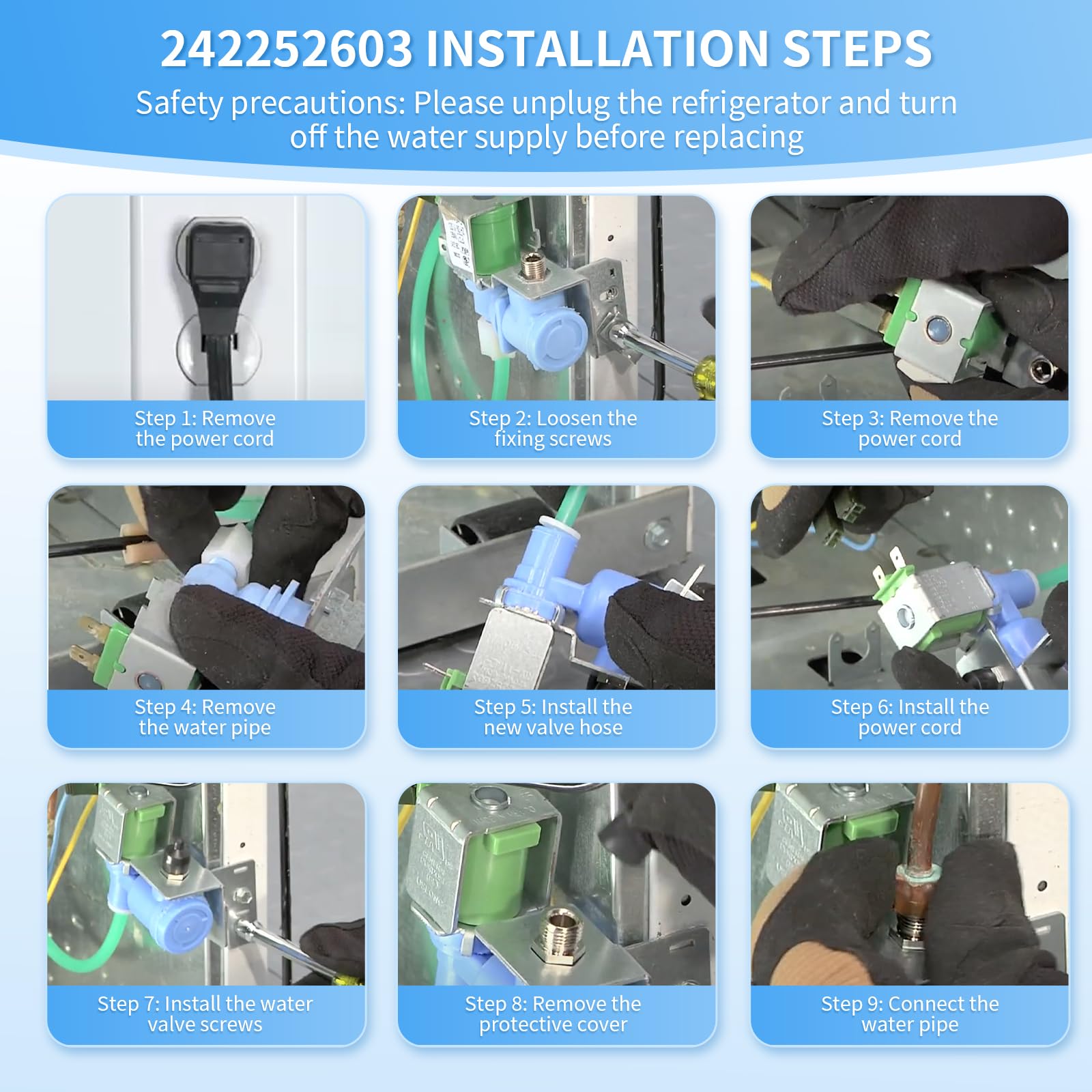 Product function: 242252603 refrigerator water inlet valve is designed to replace the broken or damage valve and ensure a steady and consistent water flow, providing you with refreshing water and ice. resolves various water supply issues in refrigerators like ice-making problems, poor flow, and leakage. Made from high-quality materials to guarantee long-lasting use and prevent leaks or malfunctions