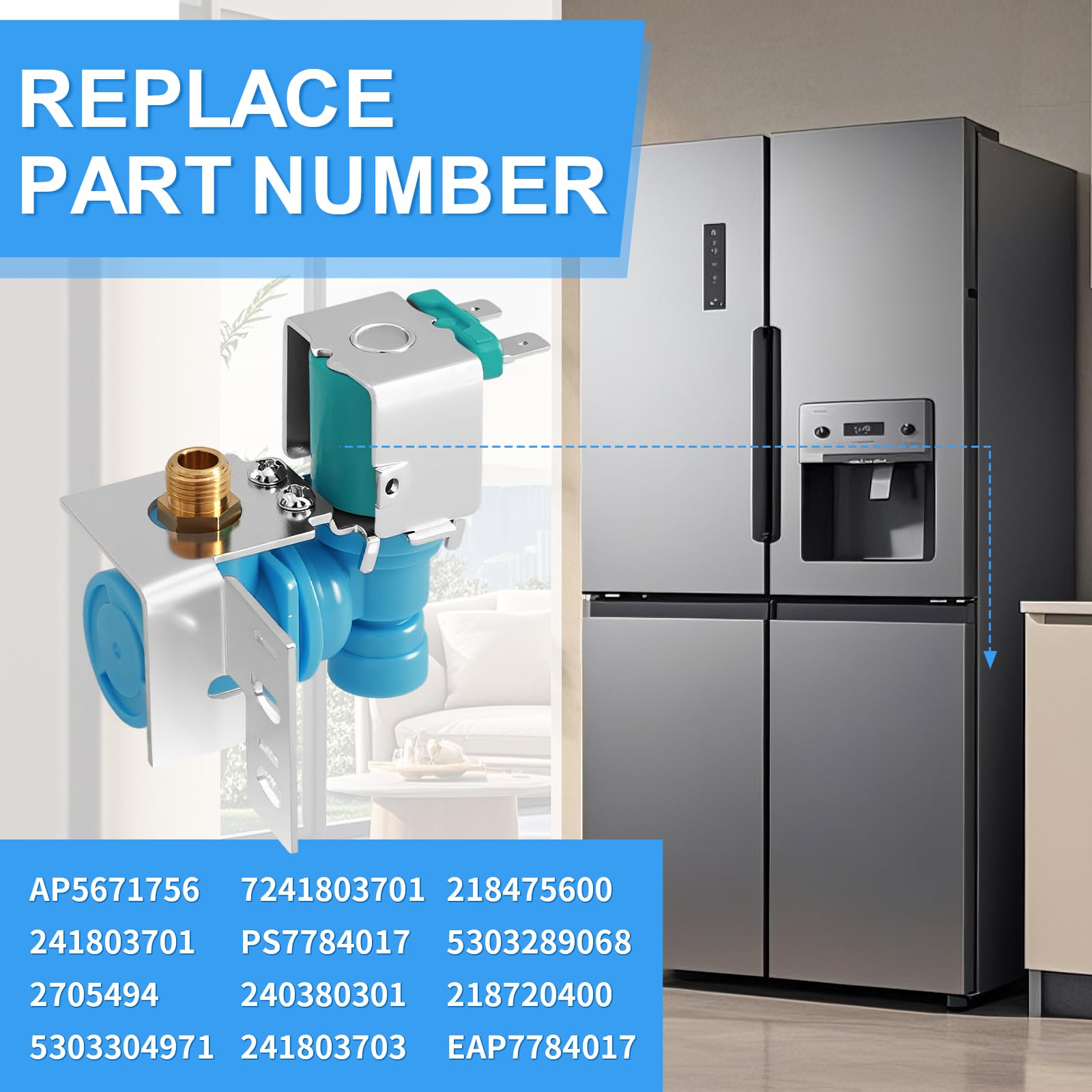Compatible Mode:242252603 241803703 Water Inlet Valve for models AP5671756、241803703、241803701、PS7784017、5303304971、240519601、218720400、EAP7784017、2705494、7241803701、218475600、240380301、5303289068 etc. Ensure this replacement part matches your refrigerator's model number (found on the nameplate or sticker) for proper fit for more models, please press Ctrl+F to go to A+ search