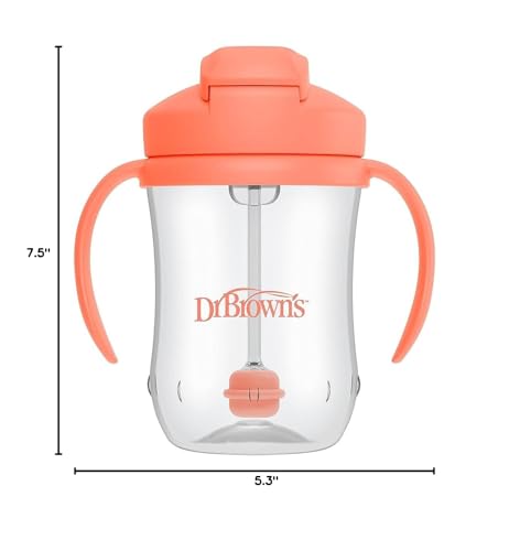 Tip and sip in any direction! Dr. Brown's Baby's First Straw Cup simplifies the bottle-to-cup transition for you and baby. Designed with a soft, weighted straw, baby can drink from any angle – helping them transition from tipping the cup upside-down to sipping upright. Baby's First Straw Cup features handles that lock in place to make it easy for little hands to hold. The cup is contoured, and the handles are removable, so it grows with baby as their cup-holding skills improve. The travel-friendly lid slides open for baby to drink and slides closed to keep the straw clean when not in use – plus it's spill-proof! Comes in lots of fun colors and themes you and baby will love. All parts are removable for easy cleaning. Dishwasher (top rack) and sterilizer safe. Do not put in microwave. Straw cleaning brush included. 9 oz/270 mL. BPA-free. 6m+.