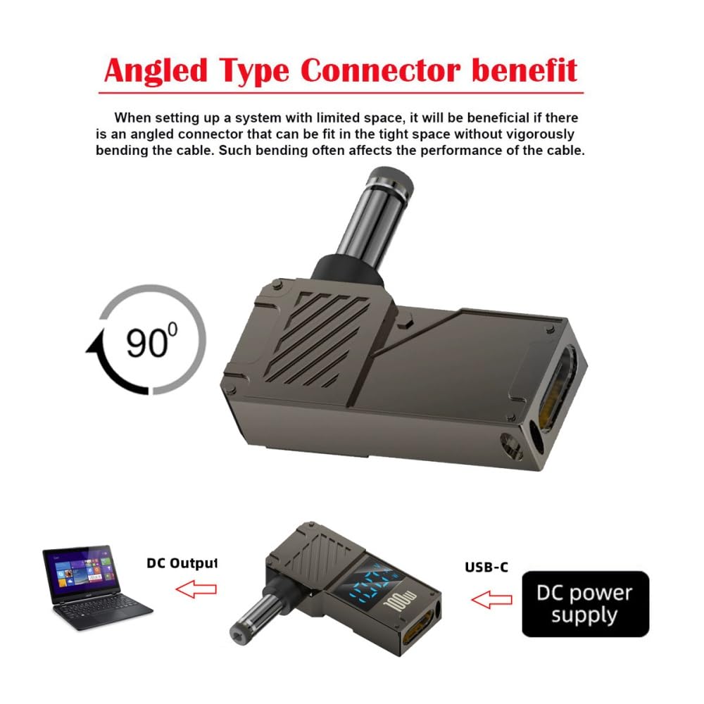 Type-C USB-C Input to DC 5.5x2.1mm Jack Smart LED Display 100W Output Power PD Charge 65W 20V 5A Adapter for Laptop 1) With Volt Current Power Display: LED light making charging visible; The adapter with an LED digital display screen that can display charging voltage, current and power in real time. It has a visual design that allows you to know the charging speed in real time and monitor device status. 2) Fast PD Charging: Support Type-C PD and QC2.0/QC3.0/USB PD,Build-in 100W DC20V 5A PD Emulator Trigger at type-c male end; Practical 100W Power Delivery,This adapter can support Max 100W 20V/5A Charging, It will supply USB-C power when your DC Laptop device is in use. 3) Small size,Fully plug and play. Easy carrying. The alloy shell can better protect the plug, so that the product has better performance. 4)Angled Connector Design: 90 Degree Angled adapter, The angled type Allowing you to connect it to a female port, even if space around the port is limited. 5) Input: Type-C, 100W Charger; Output: DC Male, DC20V 5A 100W Max.(Also support 65w and 18.5V-20.5V). In order to ensure 100W Power output, The charger and cable must use specifications of 100W or higher. 6) Wide Compatibility: This Type-C Adapter is widely compatible with Most of USB-C Charger and DC Devices (Mainly Laptops), Please check your laptop with correct size DC jack.