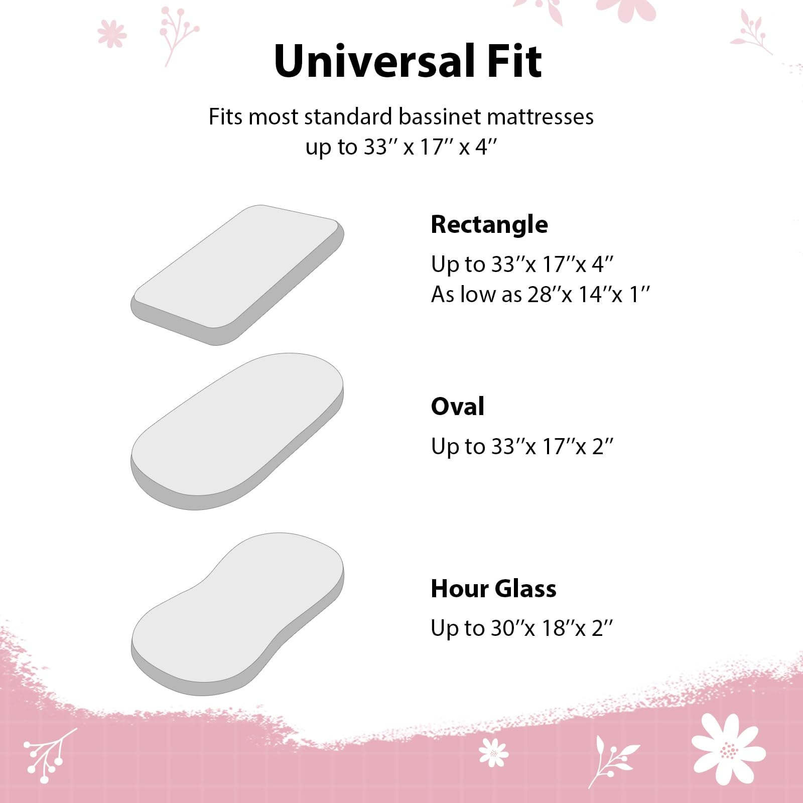Snug Fit: Measuring 32β x 16β, the 3 pack bassinet fitted sheets fit most oval, round, rectangle, hourglass shaped bassinet mattresses. With full elastic edges of the bassinet sheets, a 5-inch deep pocket, and stretchy fabric, they ensure a snug, wrinkle-free fit that stays securely in place, even during your babyβs most active nights.
