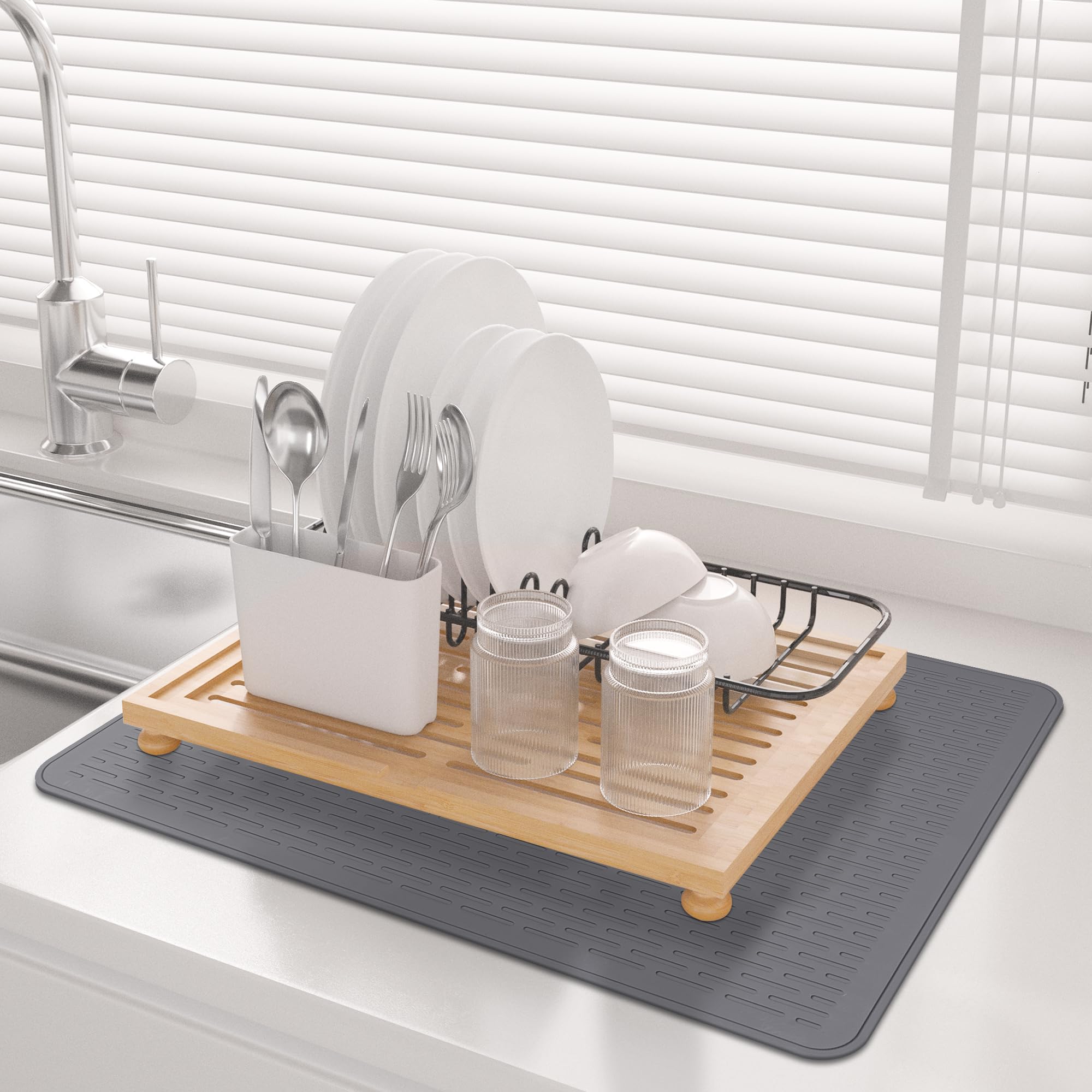 Kitchen Drying Mat:The unique design of wide raised line ridges increases air circulation, improves ventilation, and catches drips from dishes, glasses, fruits, and vegetables. The high edges and waterproof bottom keep the countertop dry and clean, making it an ideal kitchen drying mat.