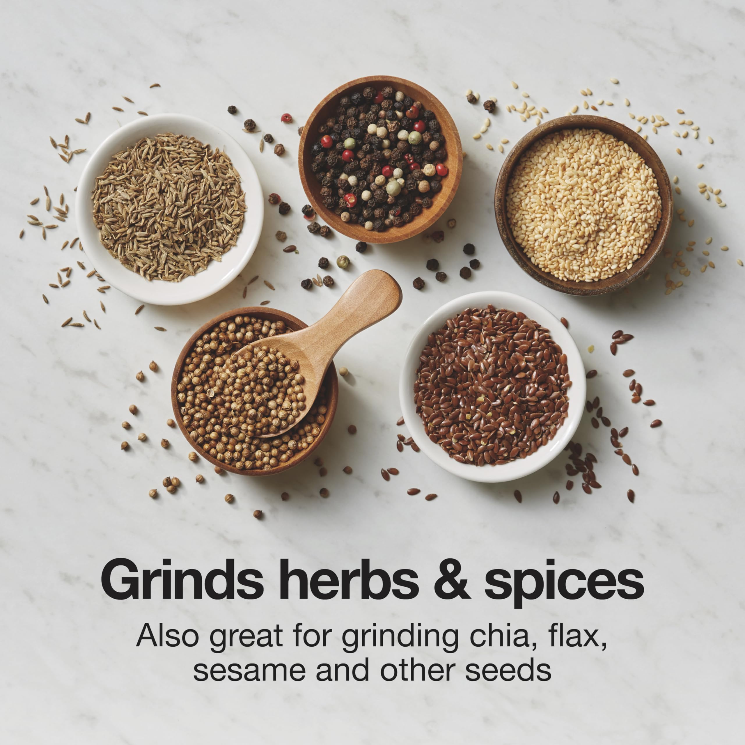 GREAT FOR GRINDING HERBS & SPICES: Conveniently grind peppercorns, fennel and other herbs and spices for recipes or to keep on hand in the kitchen. Also great for grinding sesame, flax, chia and other seeds for smoothies, protein shakes or to add to food.