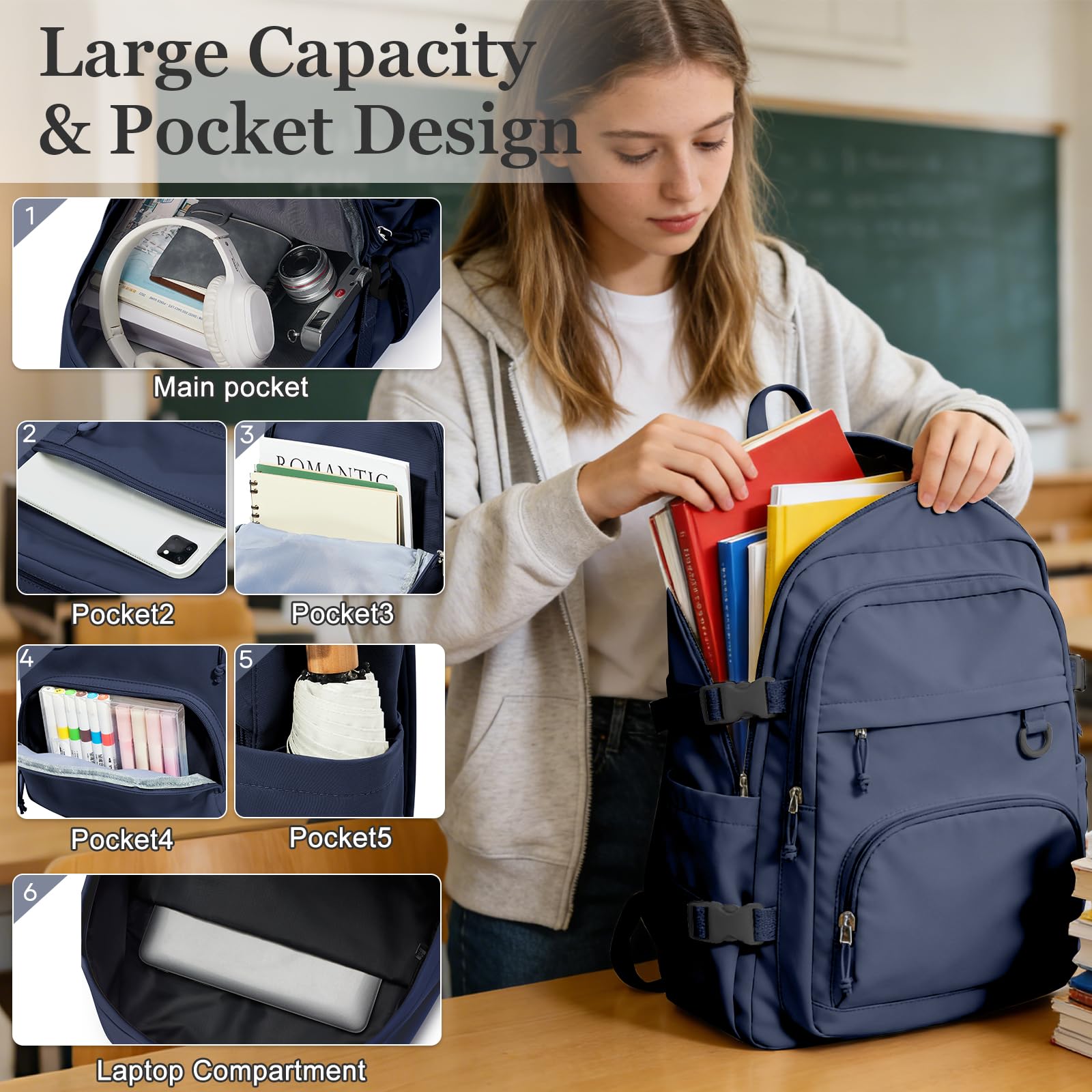EXTRA LARGE CAPACITY】 This backpack offers plenty of storage space, perfect for everyday use. The backpack has four pockets of varying sizes to keep your laptop, iPad, mobile power, camera, books, and anything else you need to keep your belongings organized. In addition, there is a separate computer compartment in the main pocket that can hold up to a 15.6-inch laptop.