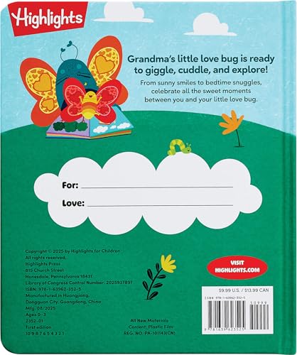 Celebrate Grandma’s unconditional love! This delightful board book captures the special bond between a new grandma and her grandbaby with bright, humorous illustrations and engaging rhyming text. Perfect for reading aloud, it’s designed to be held in one hand while snuggling a baby with the other. With space for a personalized dedication on the back cover, it can double as a keepsake card for a baby shower or birthday. This baby crinkle book will make a cherished gift that’s baby-tested and parent-approved! Nanas, Grammies and Mimis alike will delight in reading this sweet story to their precious grandbabies. Babies will love: - touching (and chewing!) the soft crinkle book material. - simple, rhyming text that keeps them engaged and builds their vocabulary. - sharing a tactile learning experience that encourages curiosity. - cuddles! Reading time is great time for bonding. For over 75 years, Highlights has inspired children to become Curious, Creative, Caring and Confident individuals. With products that encourage thinking, creativity and self-expression, Highlights helps kids build essential skills, all while having fun.