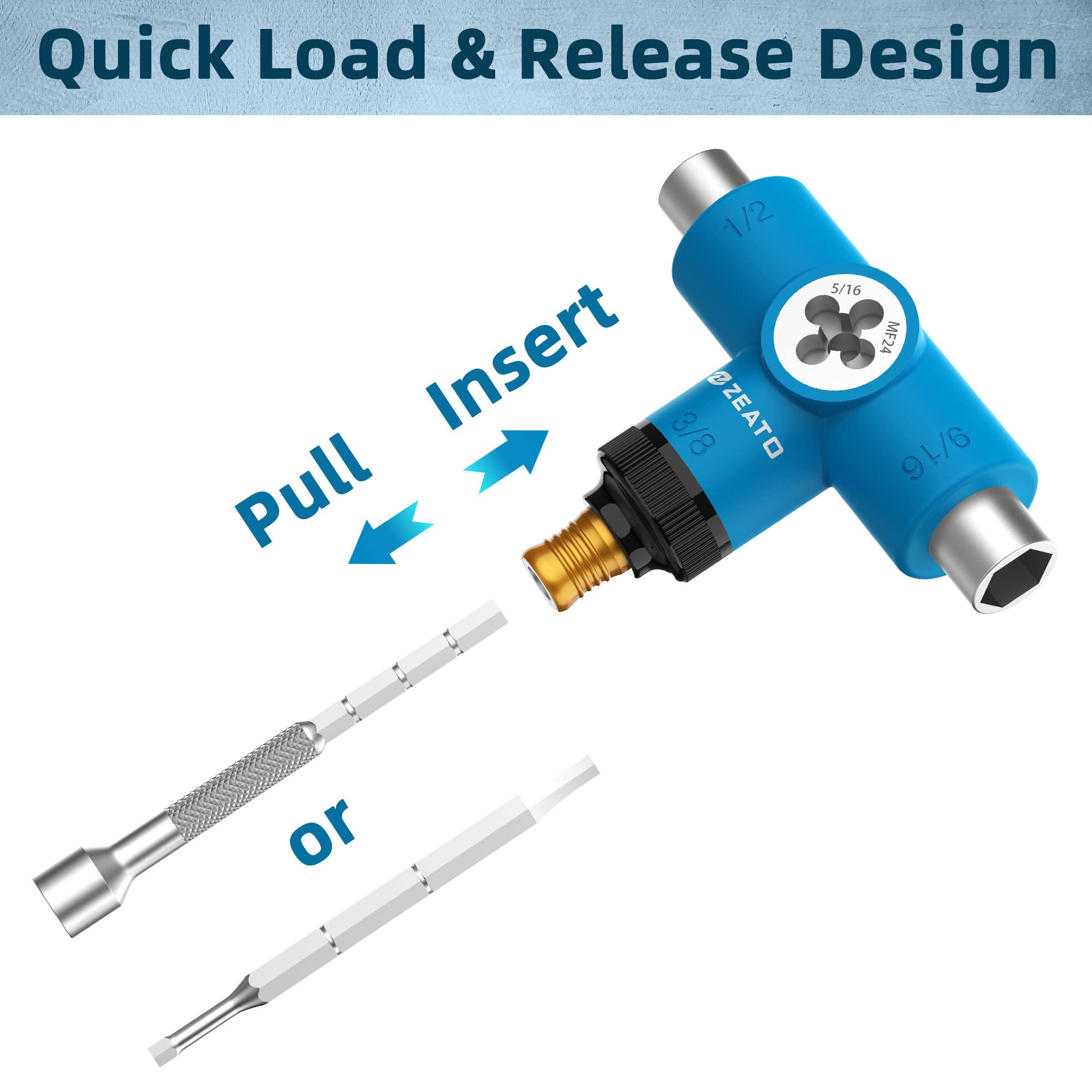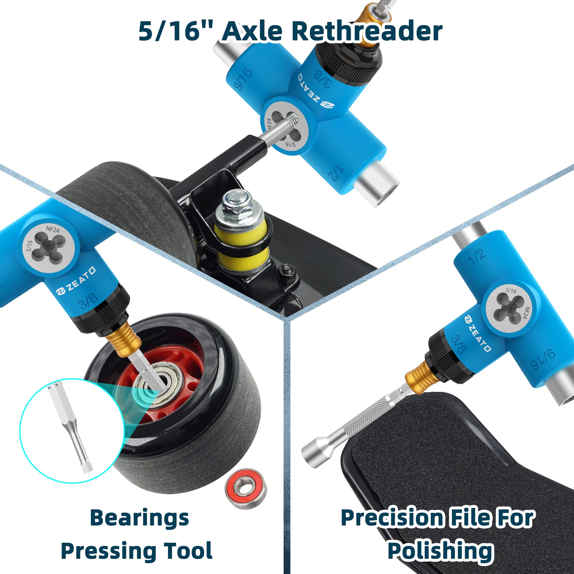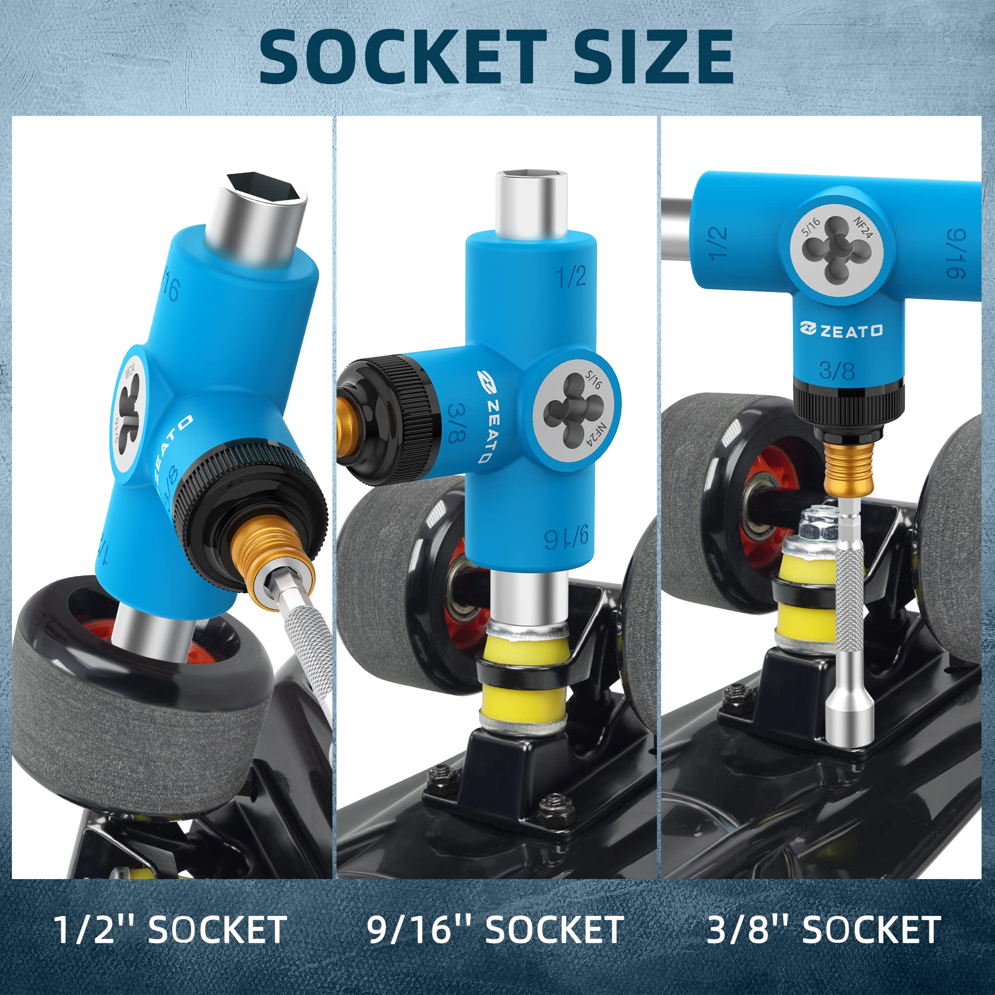 [All-in-One Design]: The skateboard tool includes 3 different of size sockets (1/2'', 3/8'' & 9/16''); A Bearing Press Tool; A Detachable Allen Key (4mm & 5mm); A 1/8 inch Allen Wrench; A Phillips Head Screwdriver; A Precision File and an Axle Rethreader
