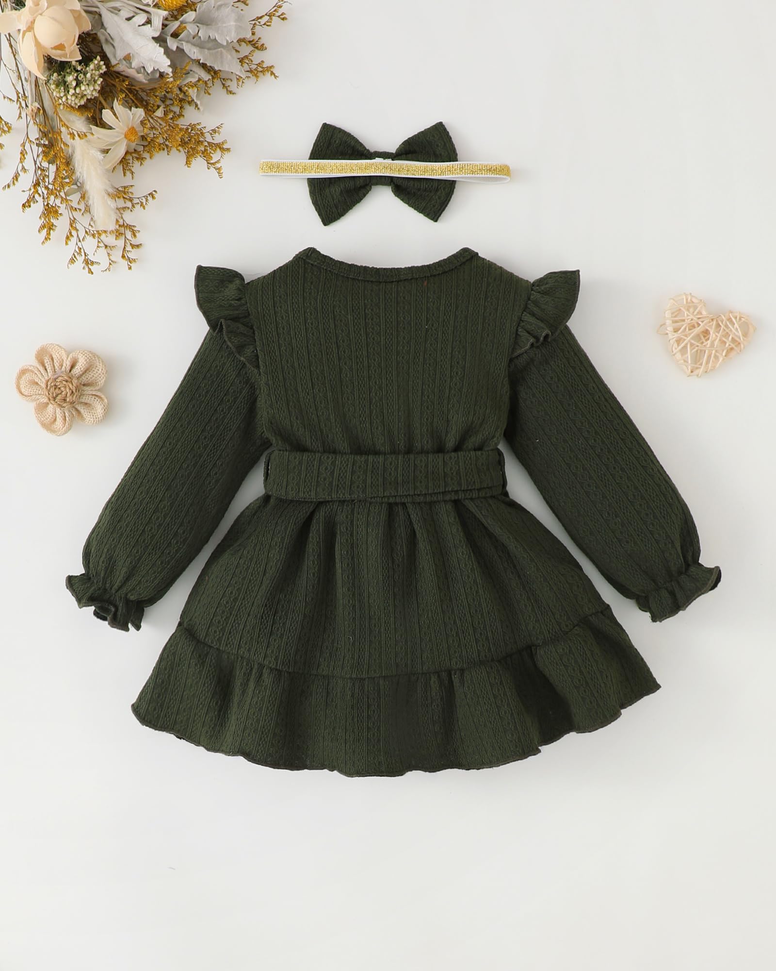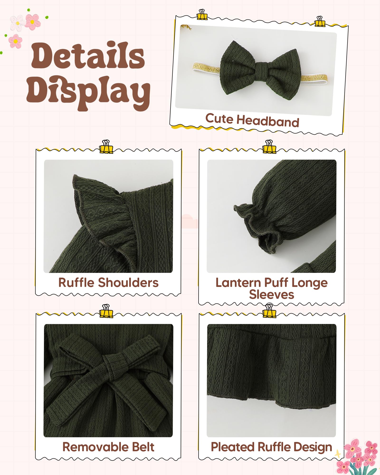 Design: Baby girl dresses design with cute lantern puff sleeves and delicate bowknot decoration cute headband.The baby dress is elastic waist-skimming and matching with belt which will make your baby girl more lovely and fashionable