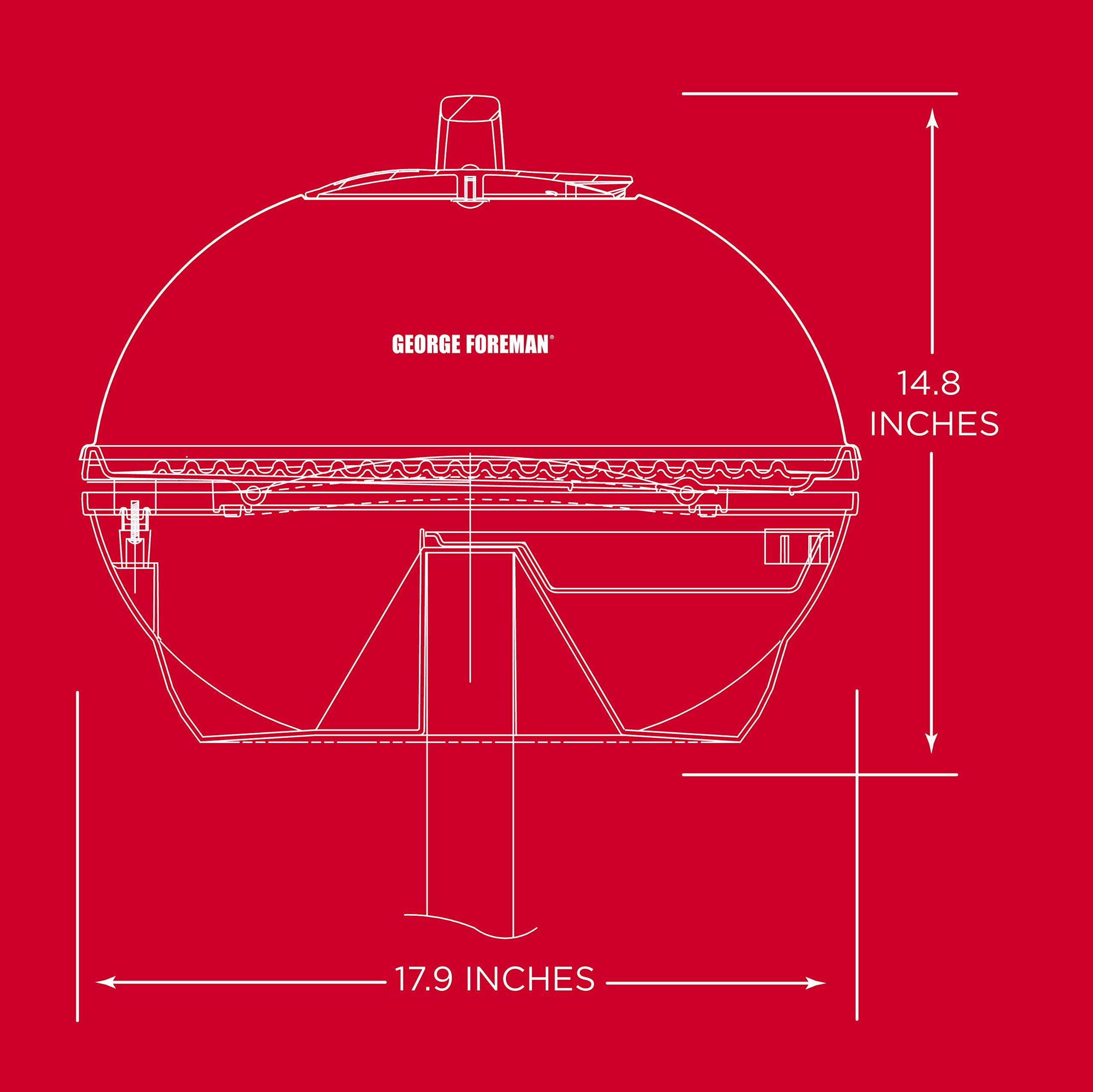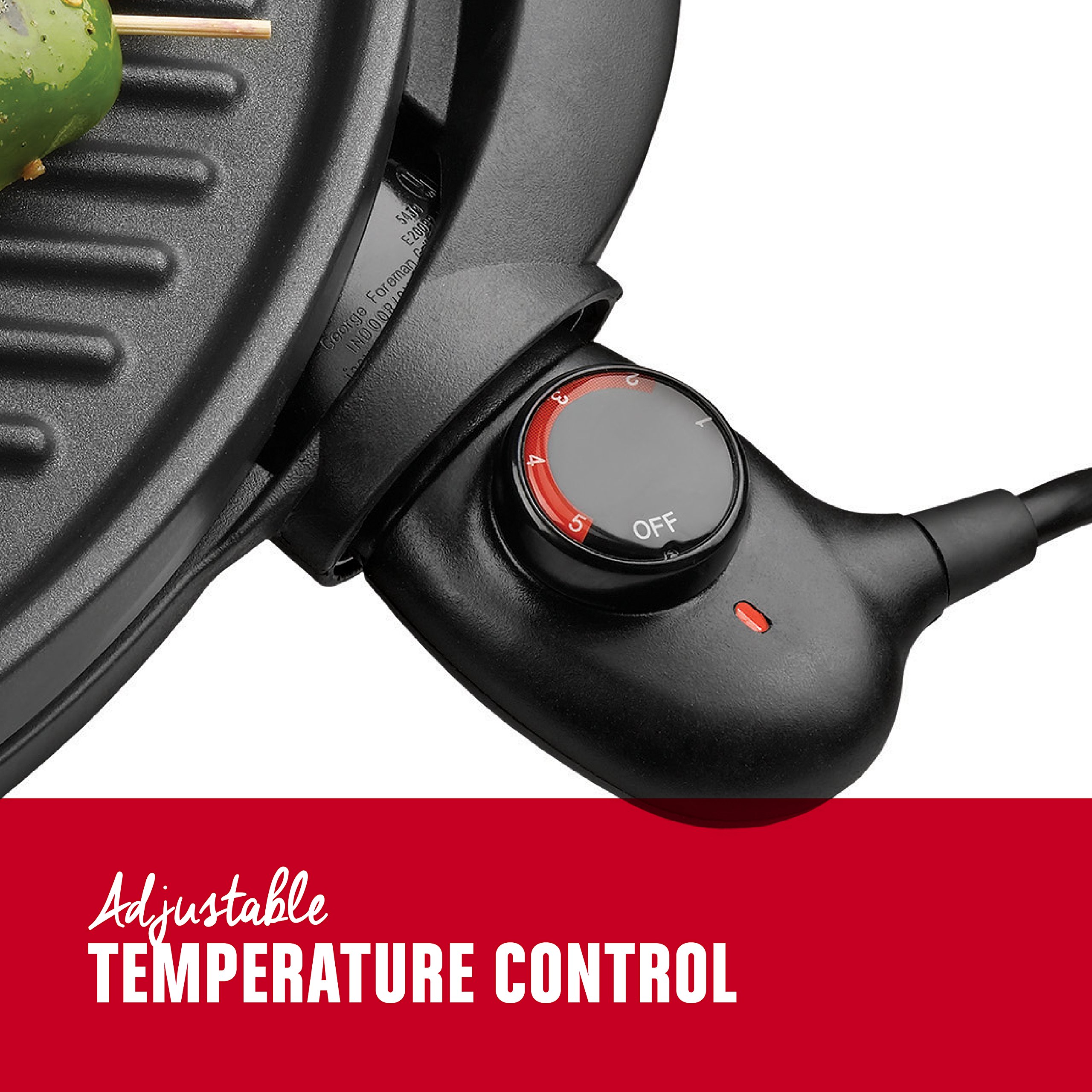 Amazon.com Grilling really can't get much easier than this. After assembling the grill (which takes only a few minutes), simply plug it in and allow about 10 minutes to fully preheat the surface while you gather your steaks, kebabs, or whatever's to be grilled. The electric heat has an adjustable range from low (for keeping food warm) to high (for searing steaks). The nonstick grill surface not only means you can use a minimum of added fat, but it also makes cleanup a cinch. The surface has a subtle slope, with channels that draw accumulated fat or other liquids into a tray just below the surface. The high domed and vented lid helps create a circular flow of hot air to ensure even cooking--particularly important for a large roast or whole chicken. The grill can be placed either directly on a tabletop or atop its pedestal. On its own, the grill surface stands about 6 inches high; with the pedestal, it stands about 2-1/2 feet high, not counting the domed lid. The pedestal is plenty sturdy for cooking, but the grill still seems a bit top-heavy, so pay special attention if grilling in a high-traffic area or near kids. Because of the easy electric heat, this grill can be used outdoors or indoors--when using it indoors, though, be prepared for potential spattering, steam, or other side effects of cooking. --Cynthia Nims Product Description This is how real fast food is made. The George Foreman 4-Serving Removable Plate Grill and Panini heats up 35% faster* to deliver hot, tasty food that’s made your way. Cleanup is just as fast thanks to the dishwasher-safe removable plates. They come with the George Tough nonstick coating that holds up through cooking and cleaning, alike. This is the must-have grill for couples or small families who want easy, delicious meals. *compared to current removable plate grill, GRP0004 **from 1/4lb. uncooked 80/20 ground chuck ***compared to standard George Tough non-stick coating.