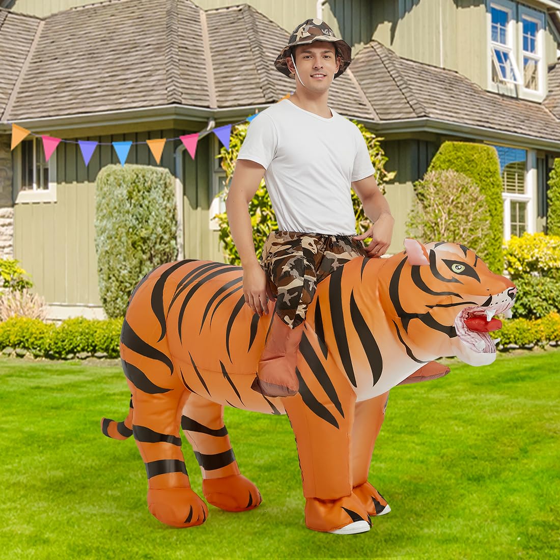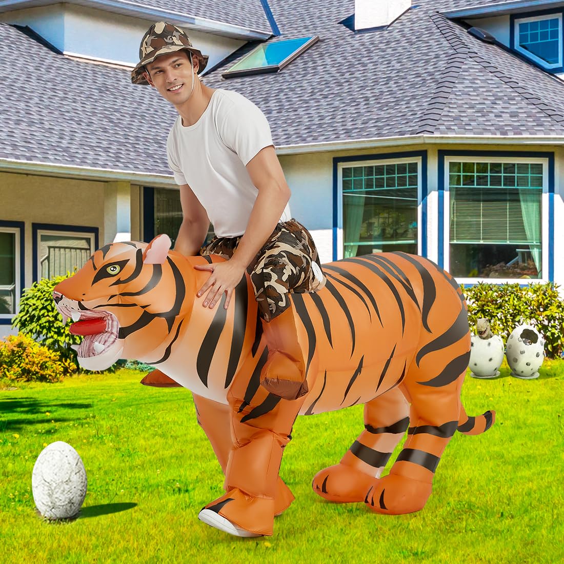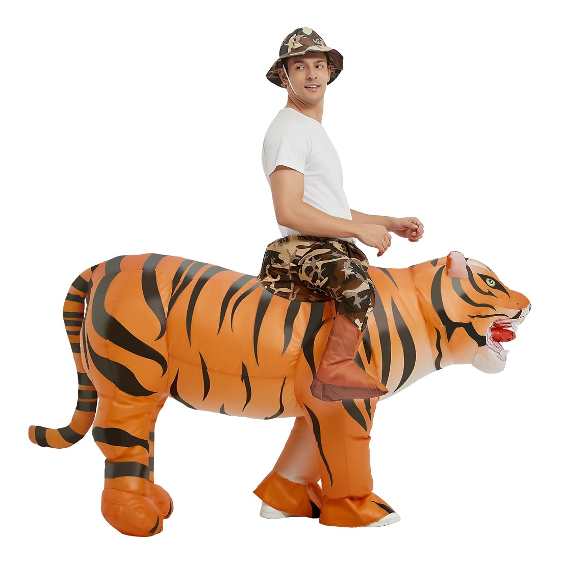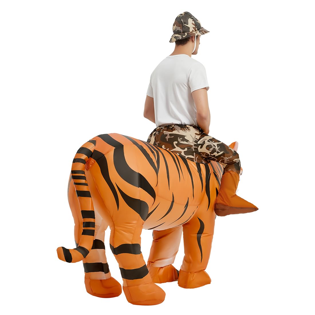 Funny Tiger Costume: This GOOSH inflatable costume was designed by our professional American designers. We believe that cute tiger rider costume made your love at first sight. Wear it at Halloween, parties, or family events and you'll get lots of compliments and leave great memories.