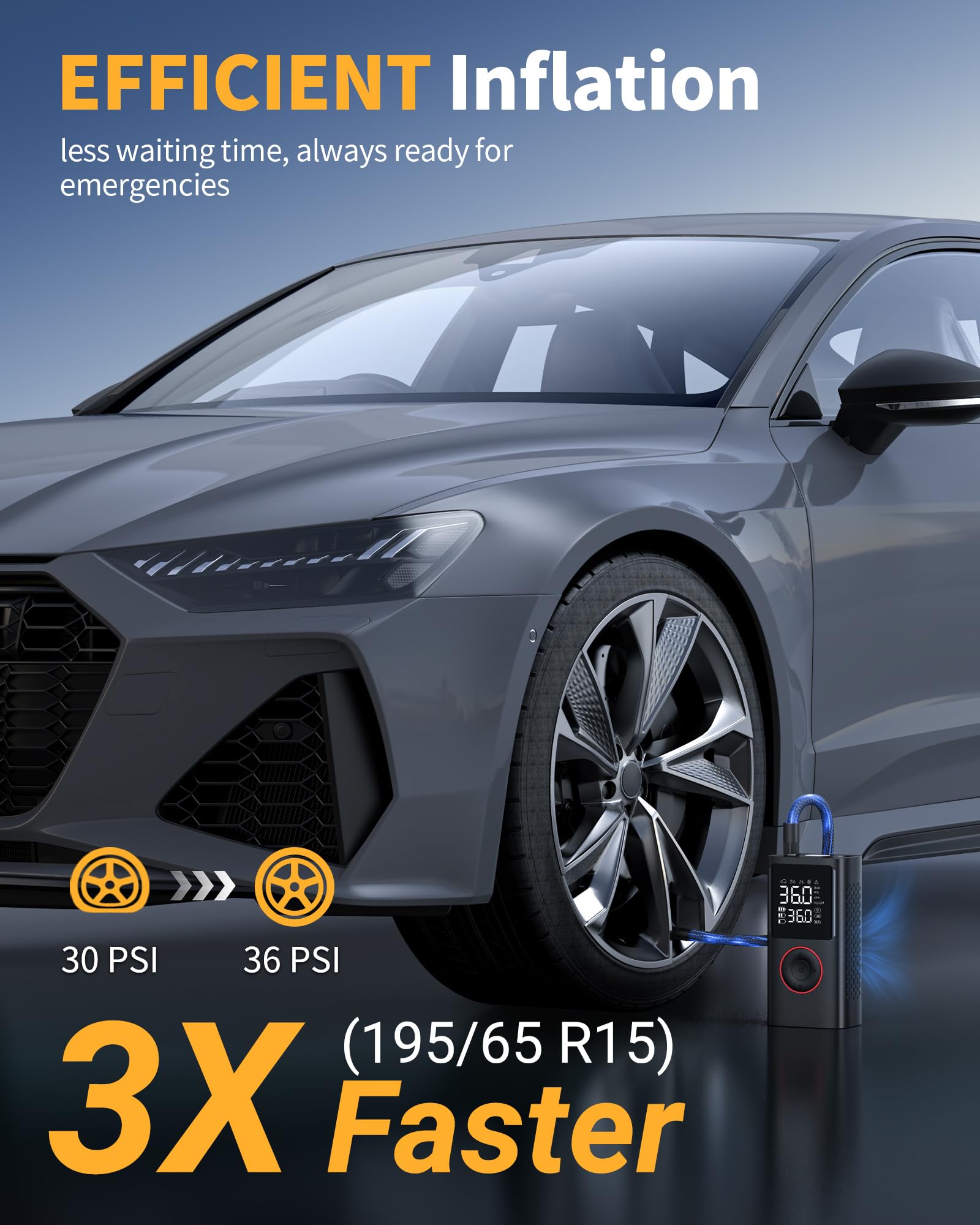 3X FASTER INFLATION: Powools portable air pump is born with a powerful motor and a high-performance chip, providing a maximum pressure of 150PSI and a strong airflow. This portable tire inflator for cars can pump up a standard car tire from 30 to 36PSI in less than 1 minute, offering 3X faster inflation than others. It can save you valuable time in emergencies or routine maintenance.