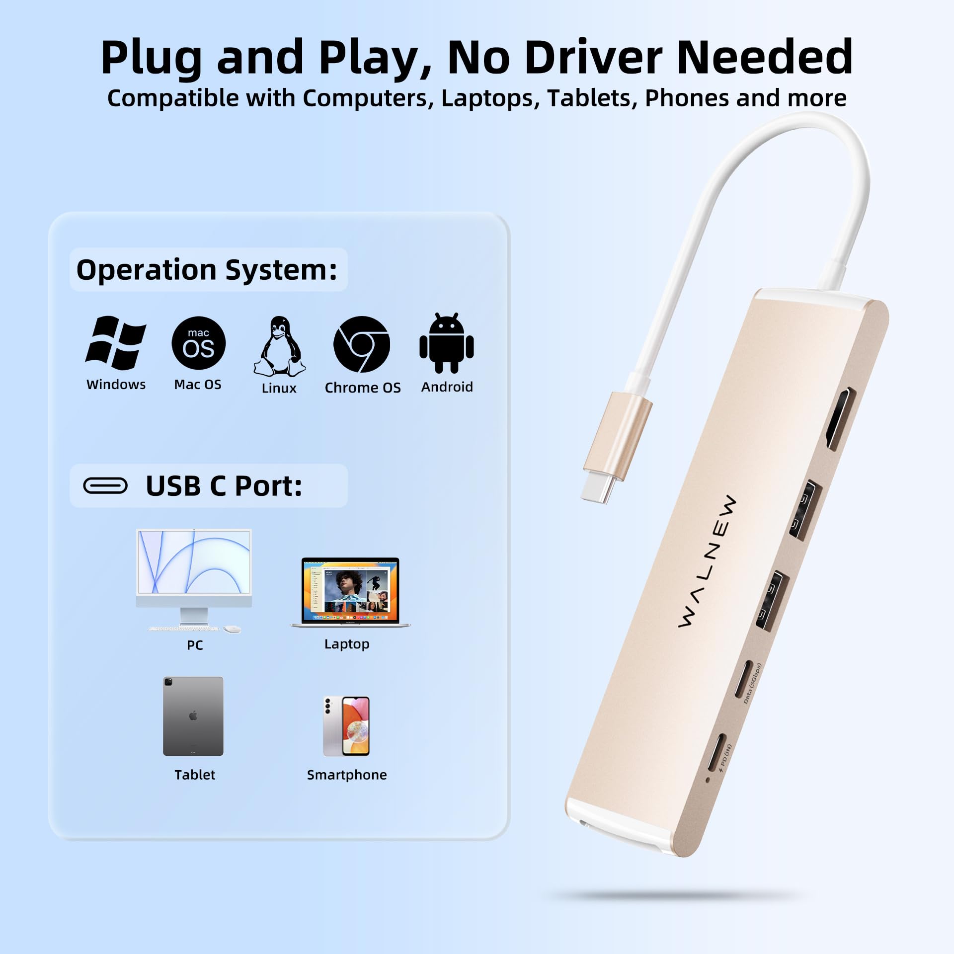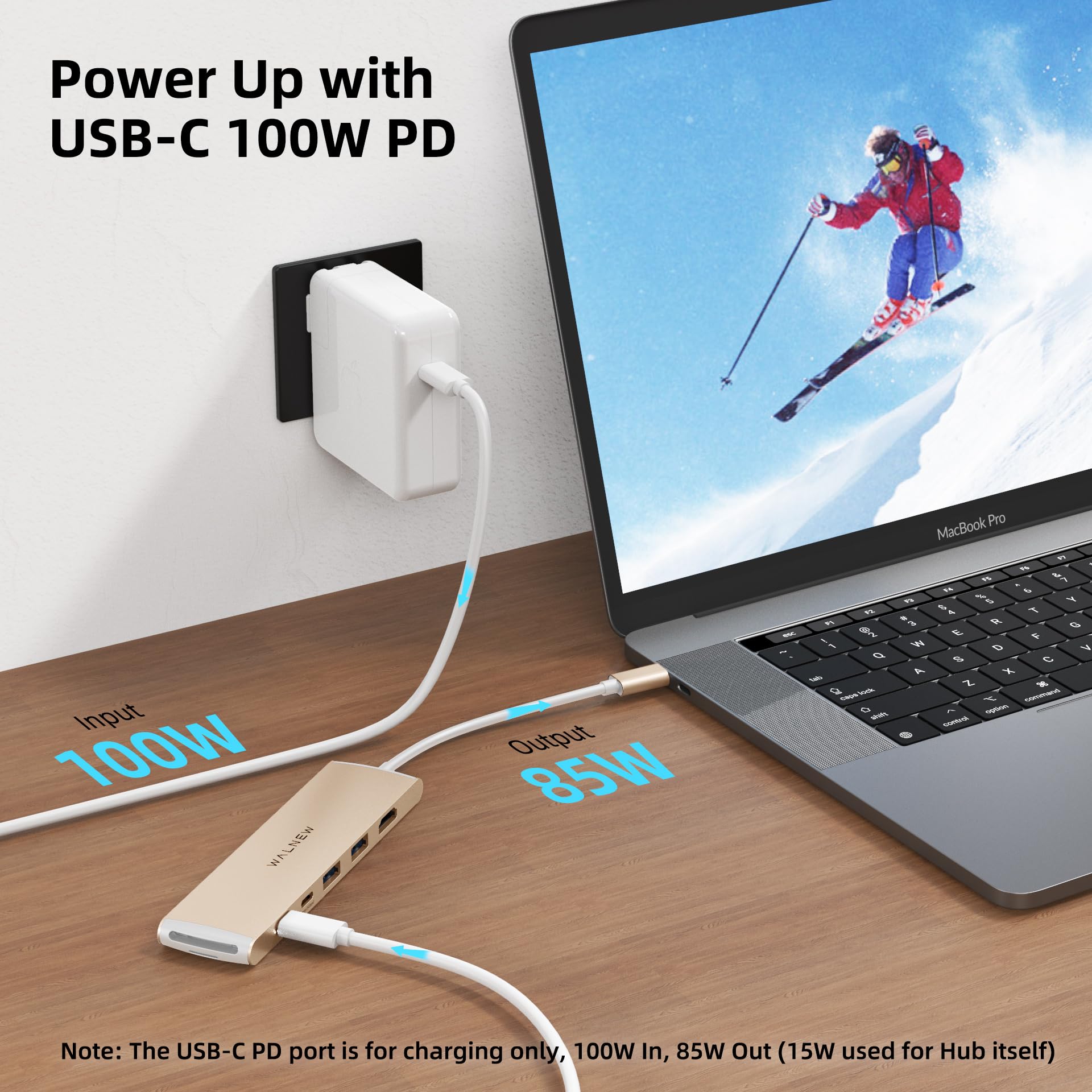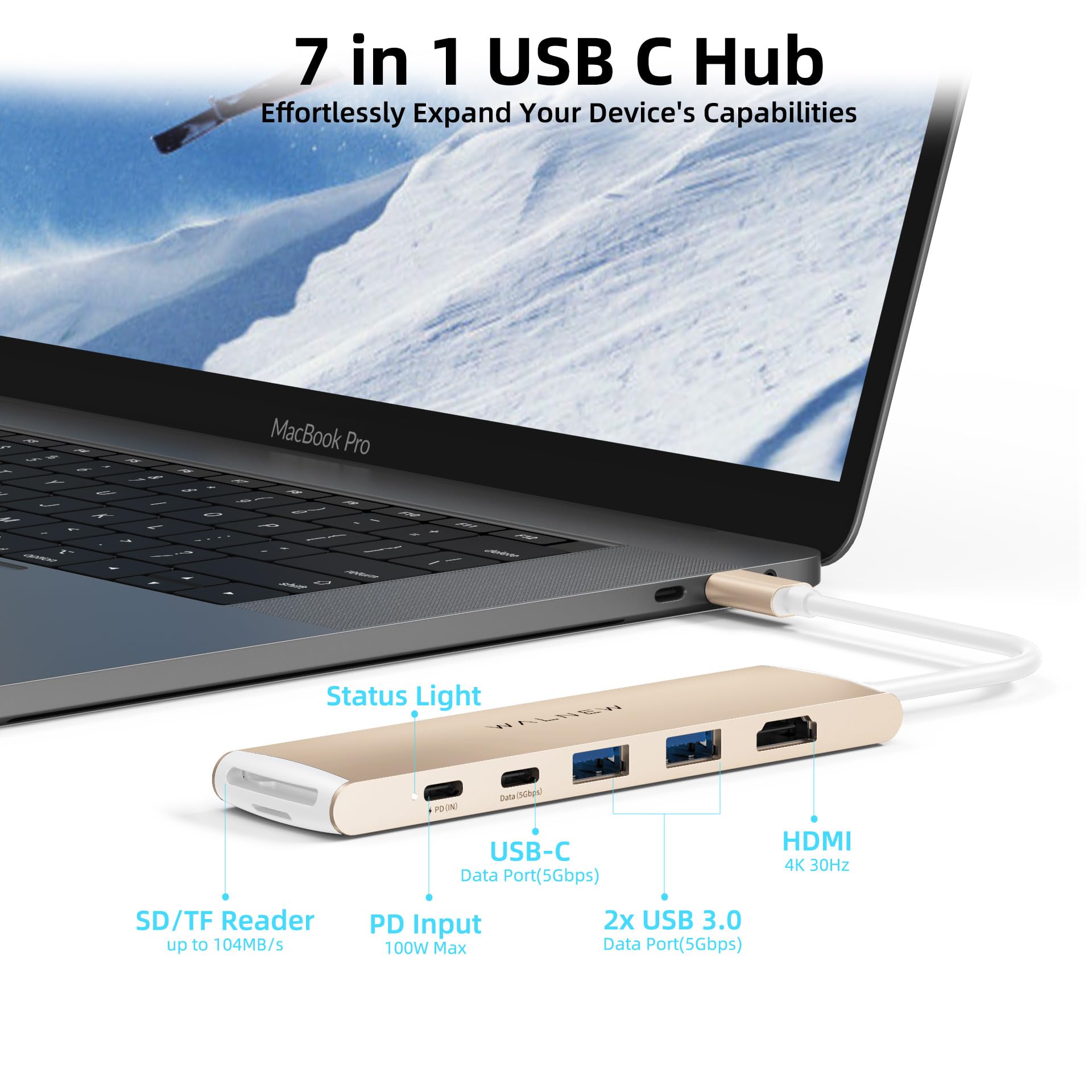 [7-in-1 USB-C Hub] The USB-C Hub features a 4K 30Hz HDMI, 100W USB-C Power Delivery (PD) input, three 5Gbps data ports (1 USB-C, 2 USB 3.0), and SD/MicroSD card slots. Its 7-in-1 design and 100 watt fast charging ensure your device maintain ample power while expanding various peripherals, boosting work efficiency.