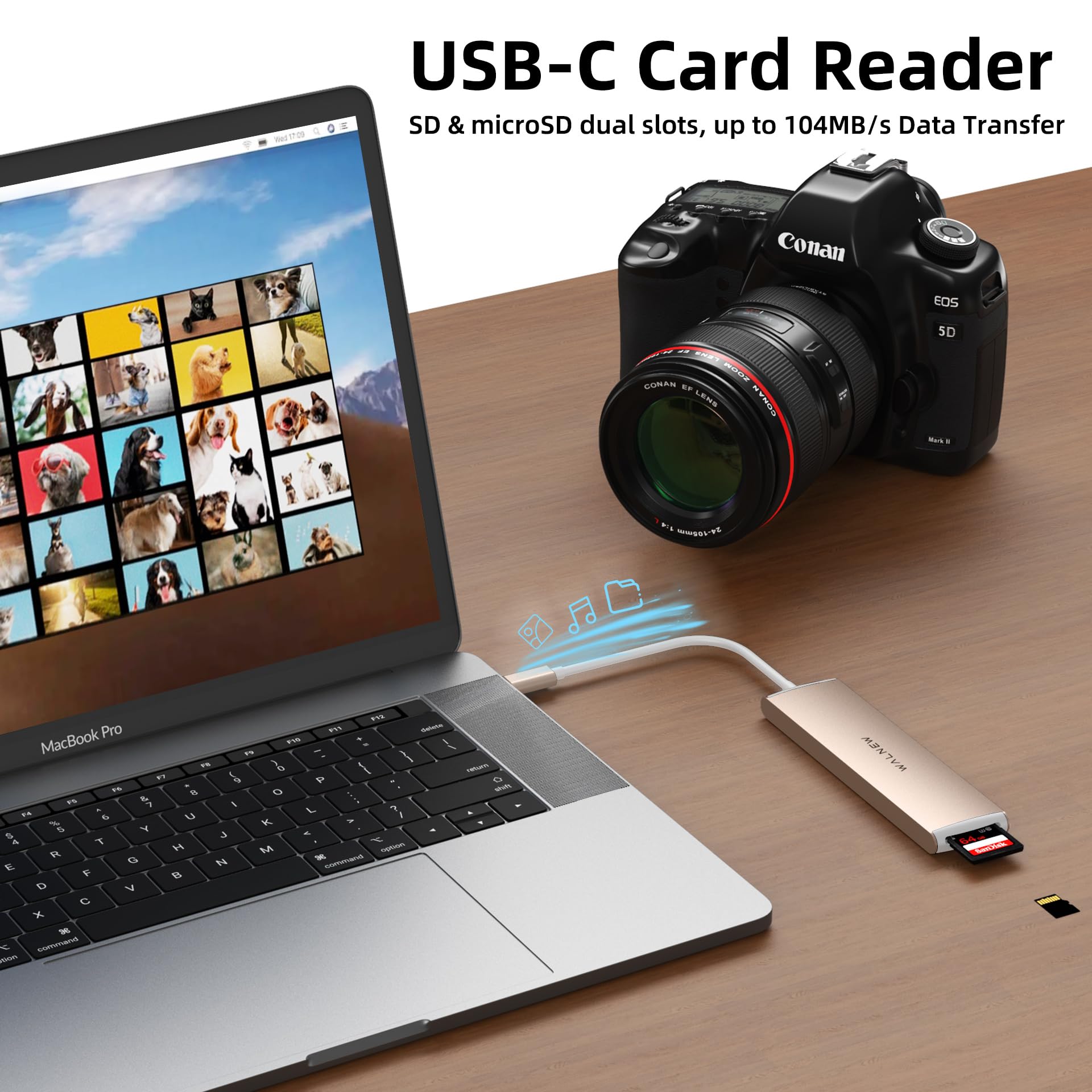 [SD/TF Card Reader] This USBC HUB's dual card slots make it easy to transfer photos, music, and videos at up to 104MB/s to USB-C enabled laptops, tablets, and phones. It works with UHS-I memory cards like SD, SDHC, SDXC, MicroSD, MicroSDHC, and MicroSDXC, making it versatile for all your data read/write needs.